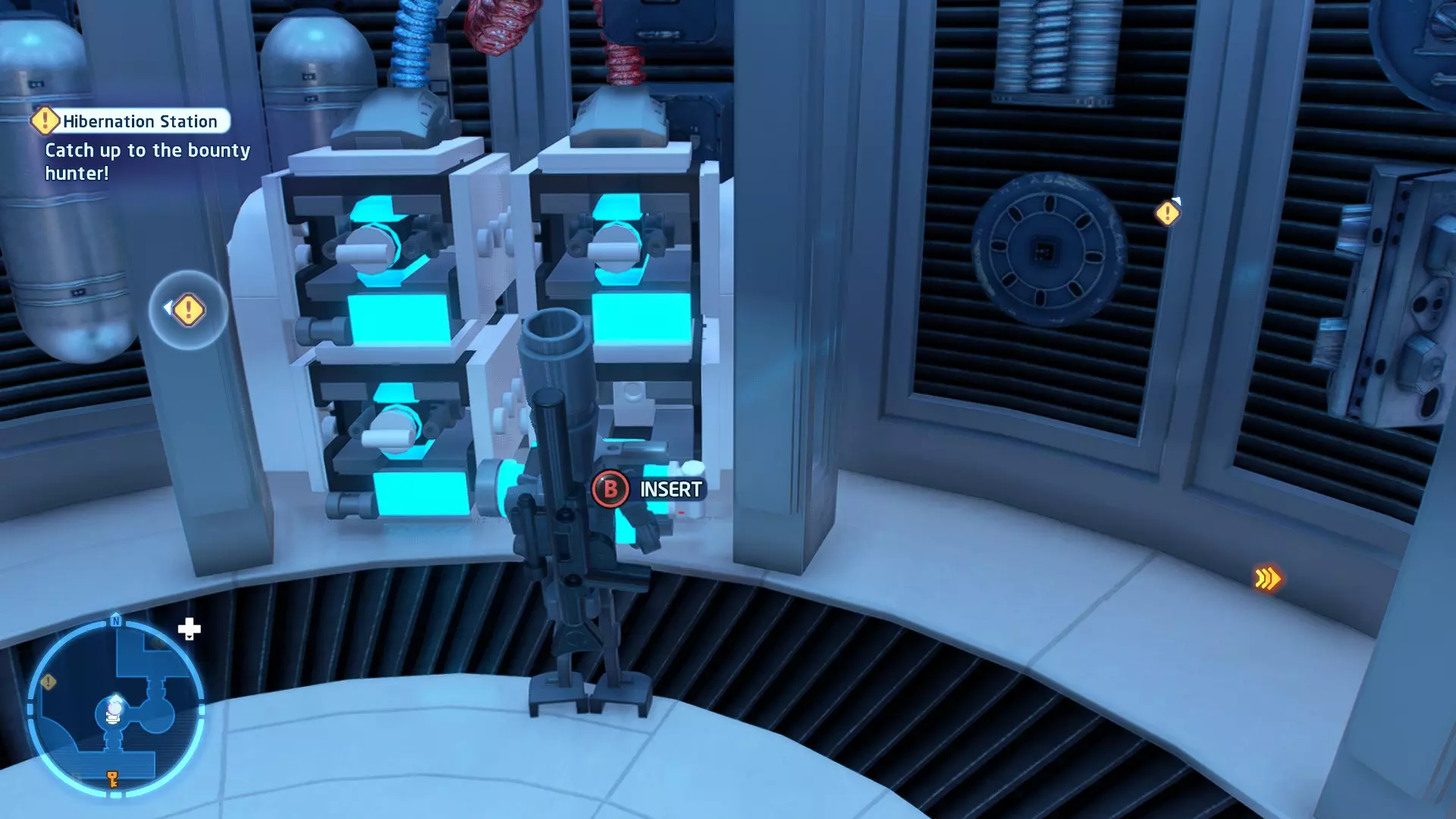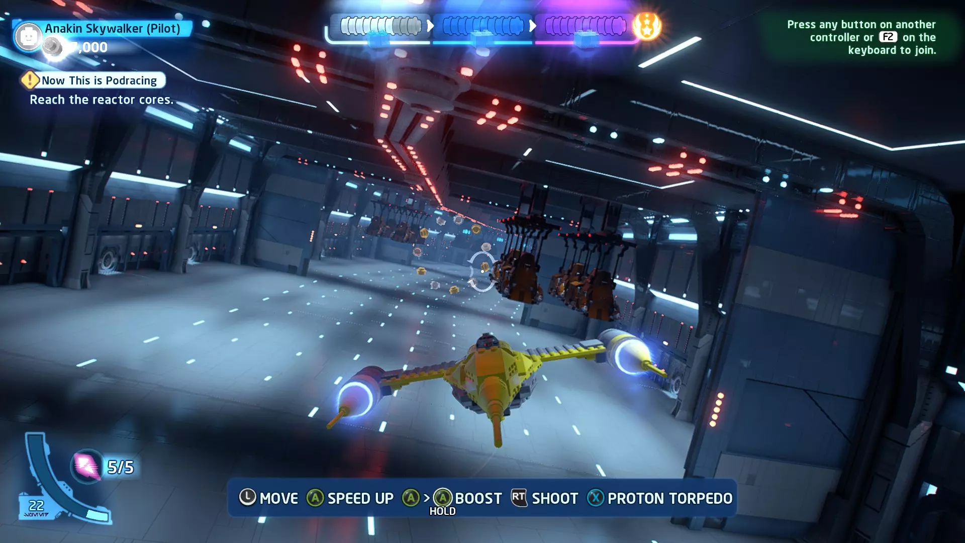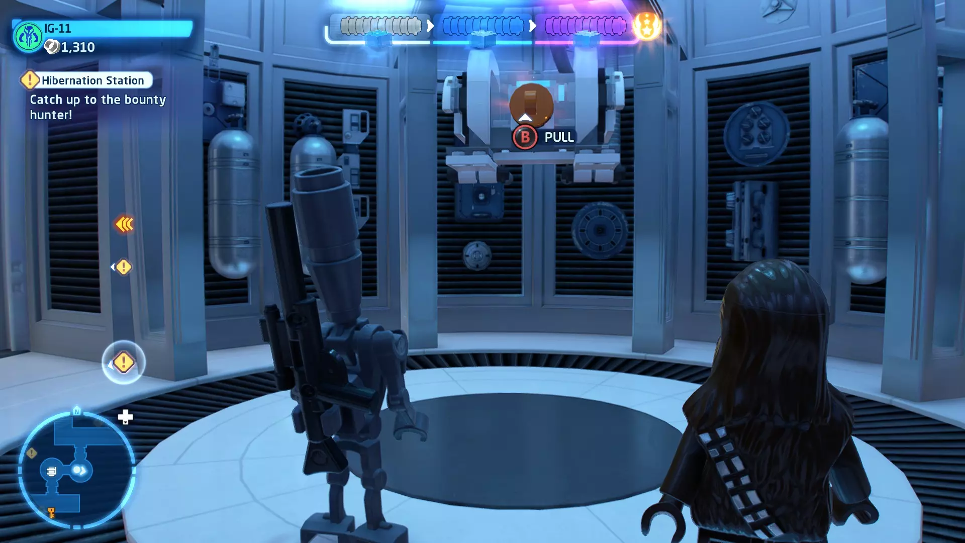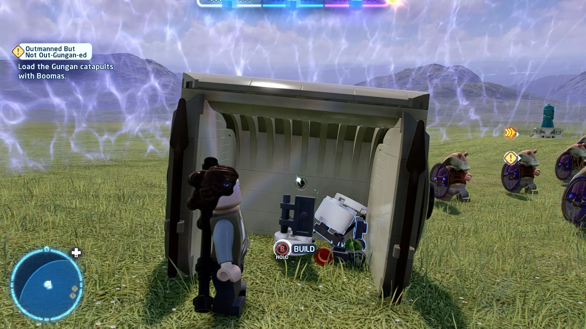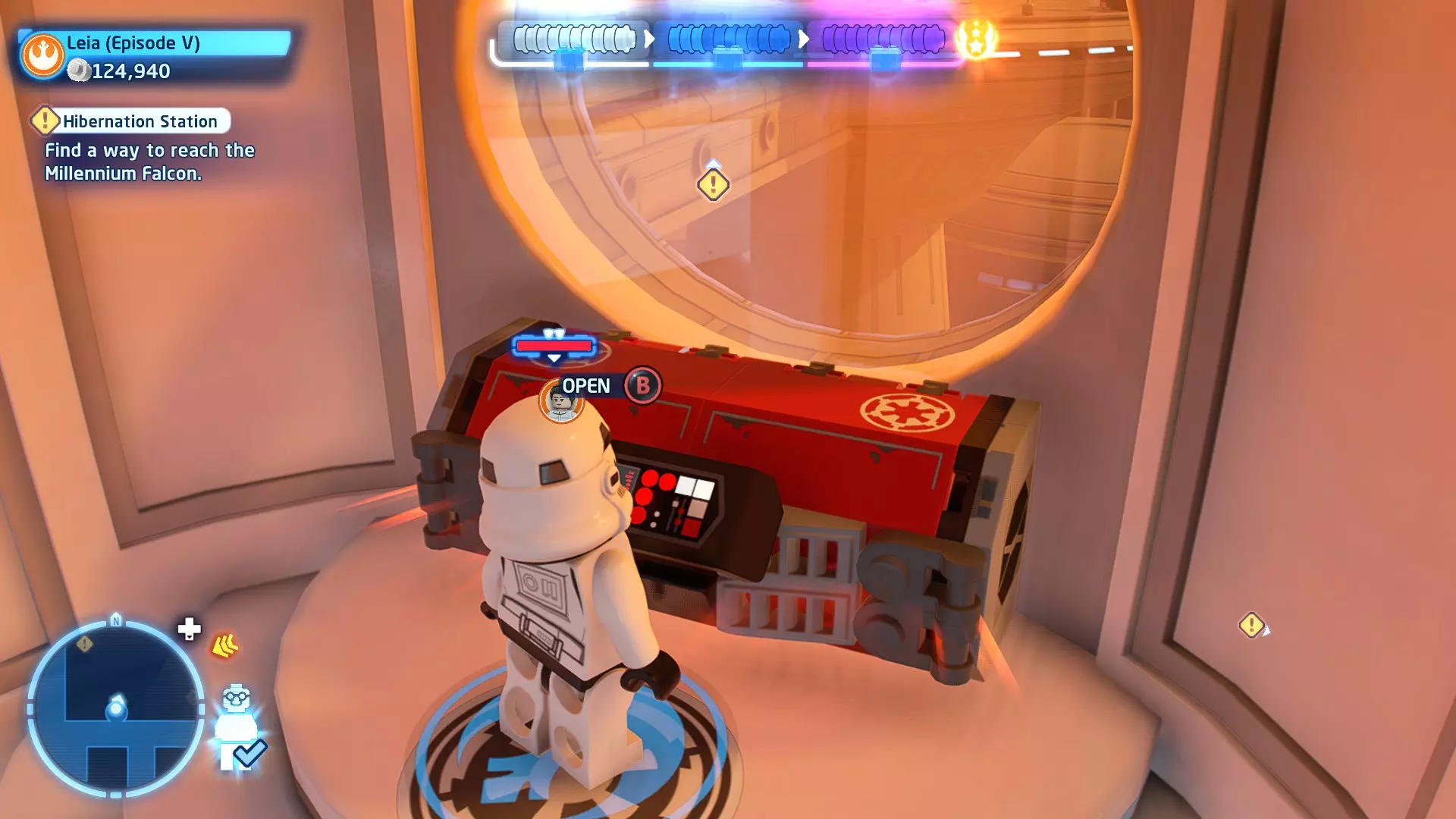 新任务:前往三泡邦戈船坞 过场动画结束后,贾巴·宾克斯将加入队伍。跟随标记前往邦戈船坞,在那里你会找到一个英雄终端。 新任务:寻找打开邦戈船坞入口的方法 让贾巴·宾克斯使用英雄终端降下屏障,这样你就能进入内部。 新任务:驾驶邦戈潜艇穿越星球核心 进入内部,找到开始第一个故事关卡的标记。 解锁角色:贾巴·宾克斯 A Bigger Fish - 故事模式