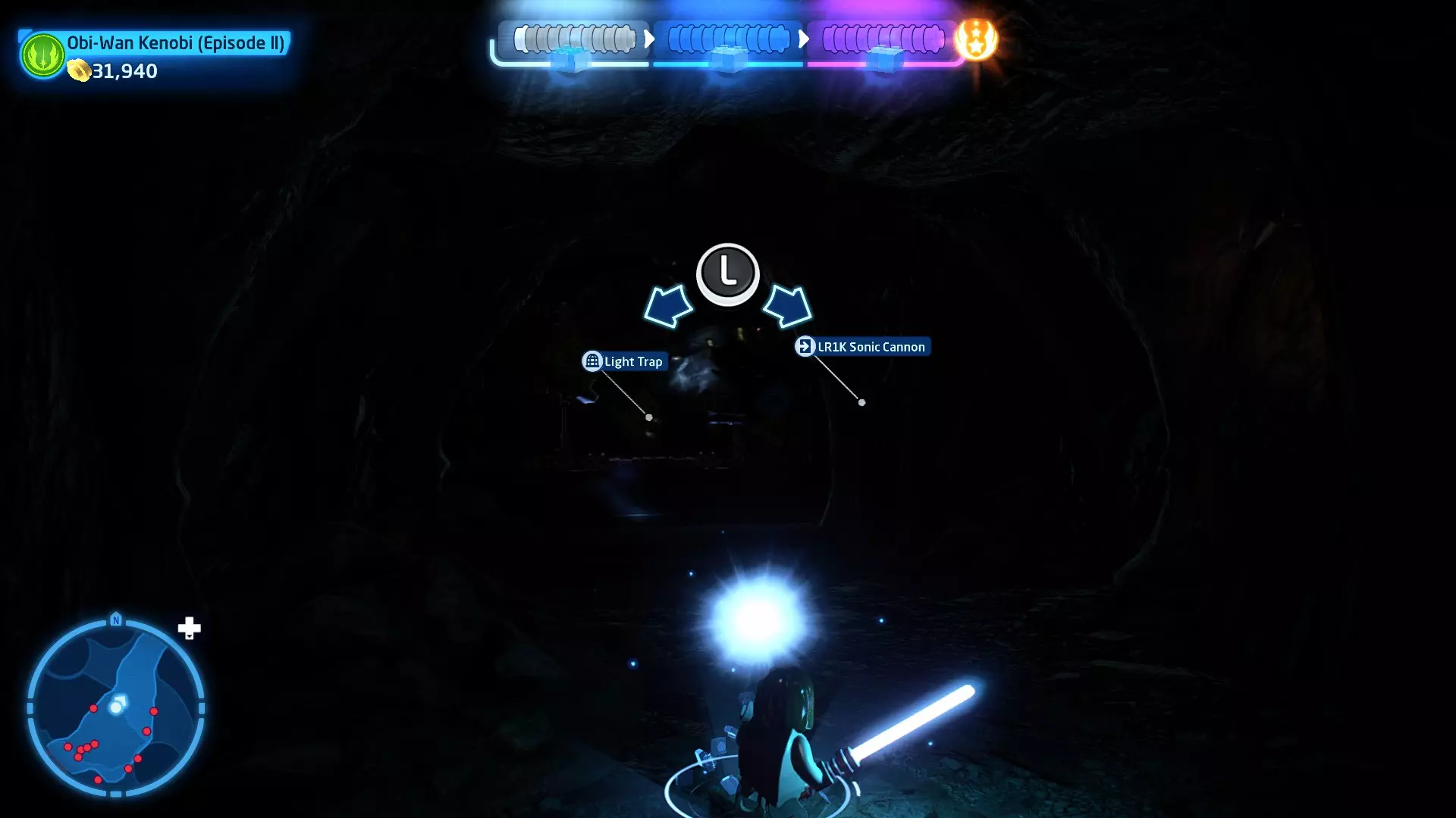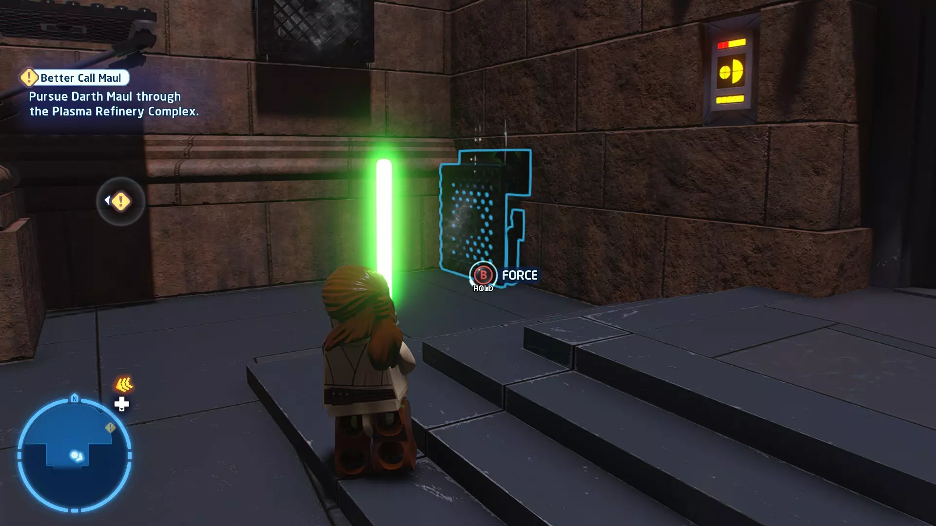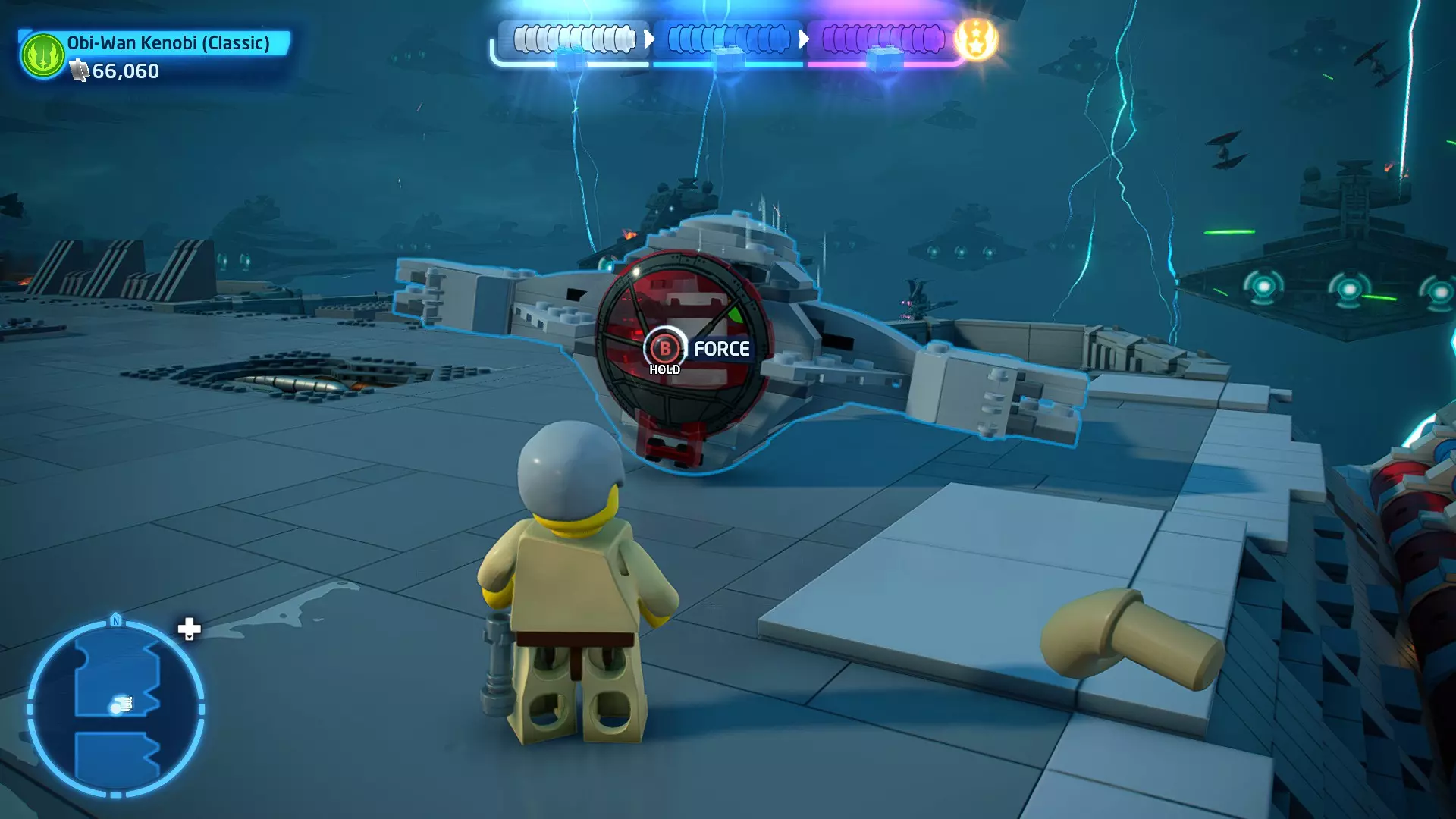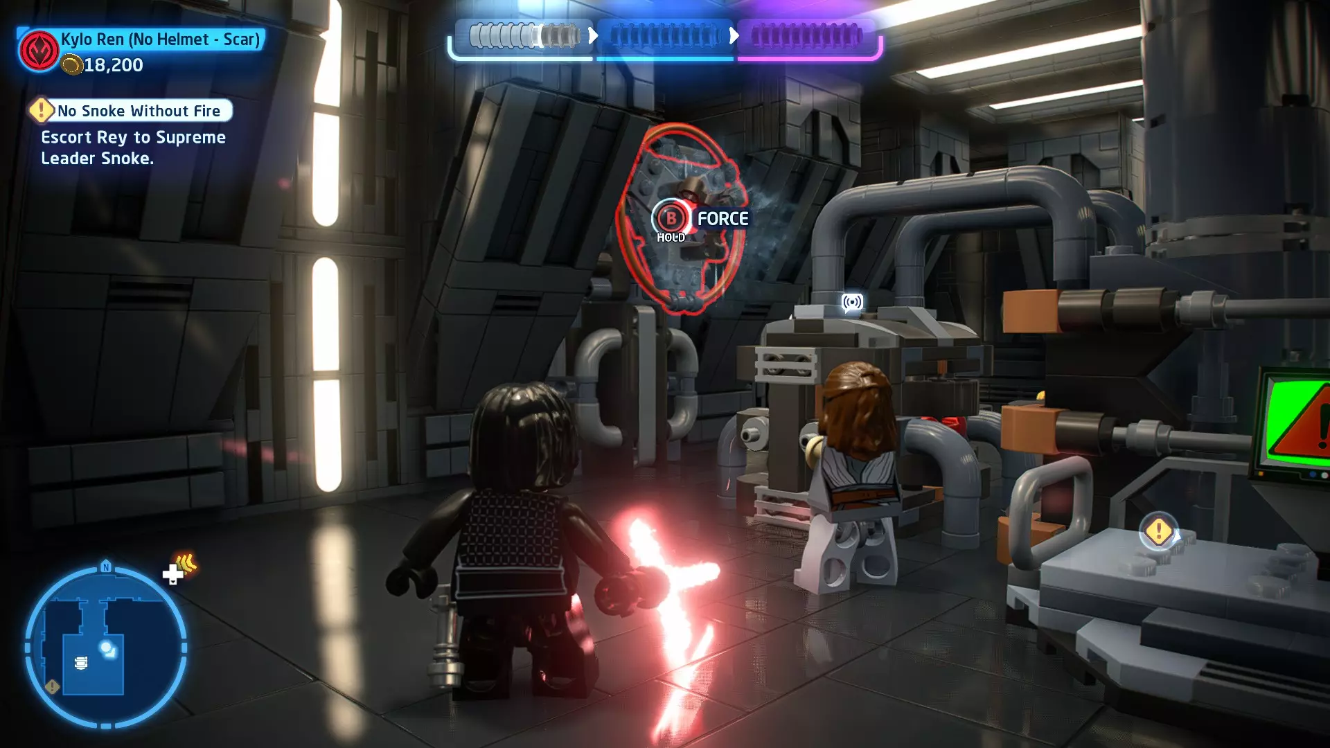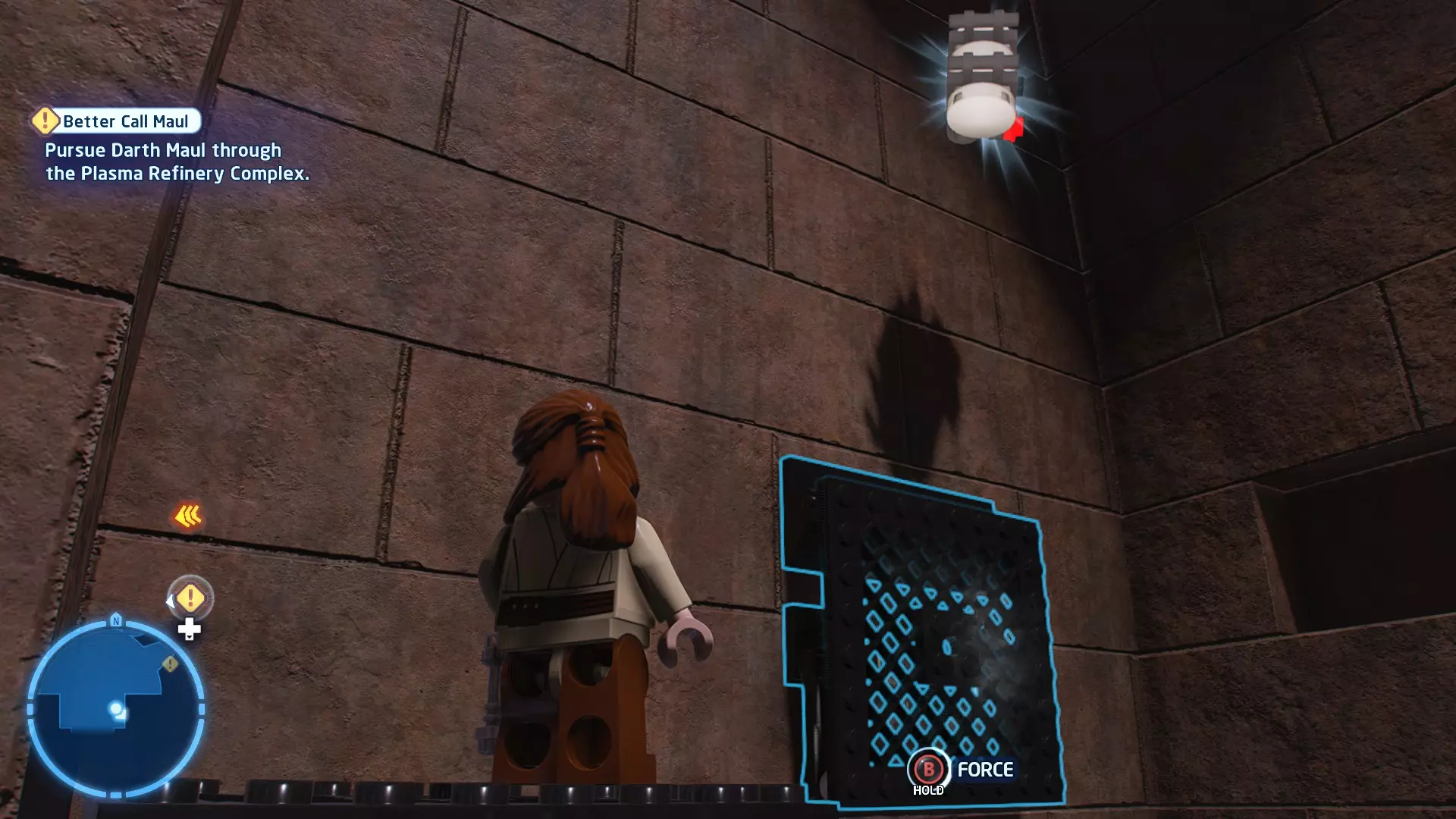 拥有此能力的角色可以使用原力与物体互动。可被原力影响的物体会有与你角色光/暗面阵营相对应的彩色轮廓。按住【特殊】键拿起物品,然后再次按下【特殊】键放下物品(或按RT键投掷!)。物品在空中时,你也可以使用方向键移动它们。