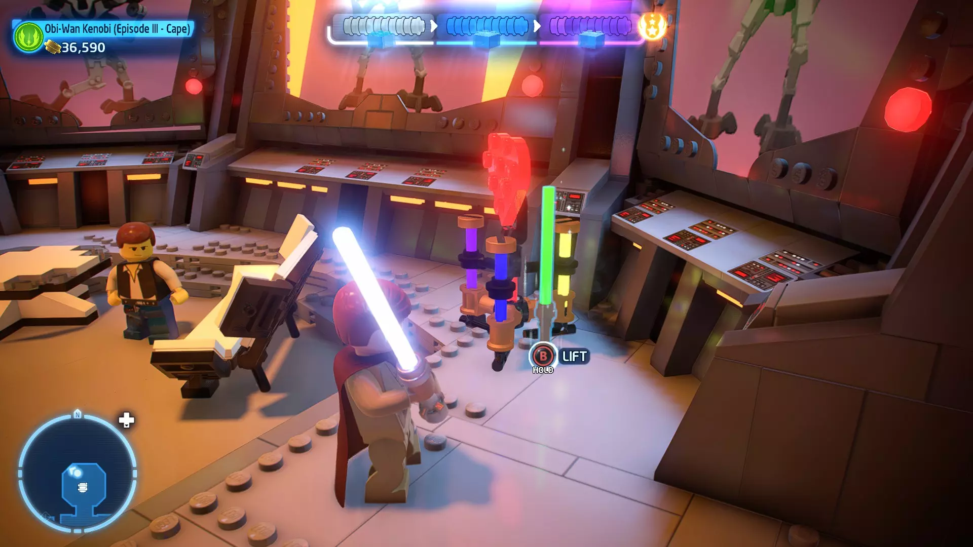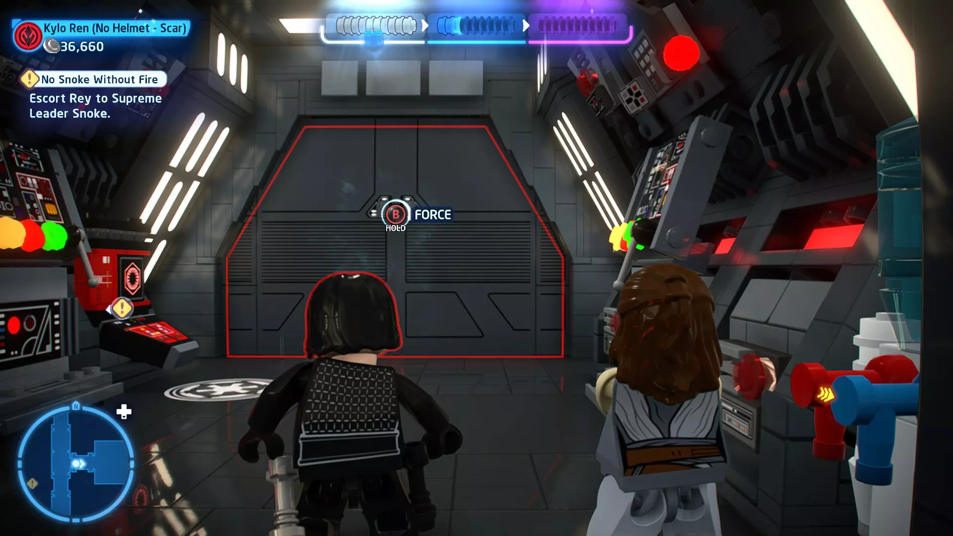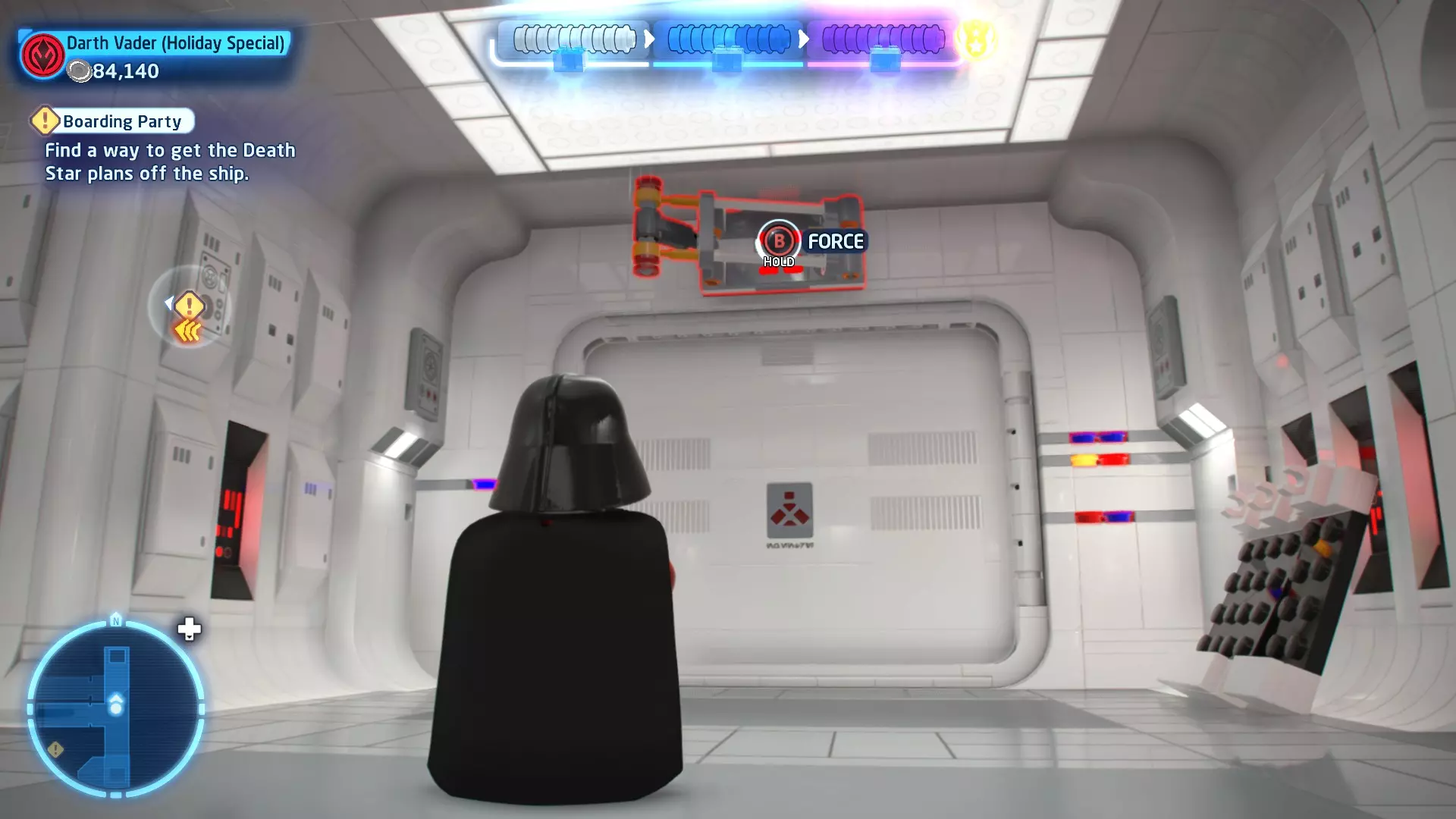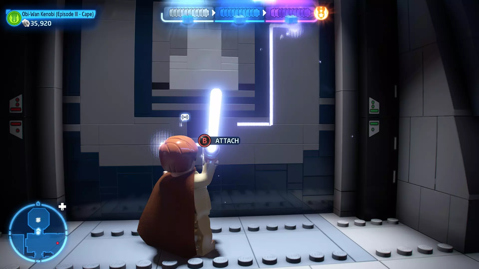 拥有此能力的角色可以使用原力与物体互动。可被原力影响的物体会有与你角色光/暗面阵营相对应的彩色轮廓。按住【特殊】键拿起物品,然后再次按下【特殊】键放下物品(或按RT键投掷!)。物品在空中时,你也可以使用方向键移动它们。