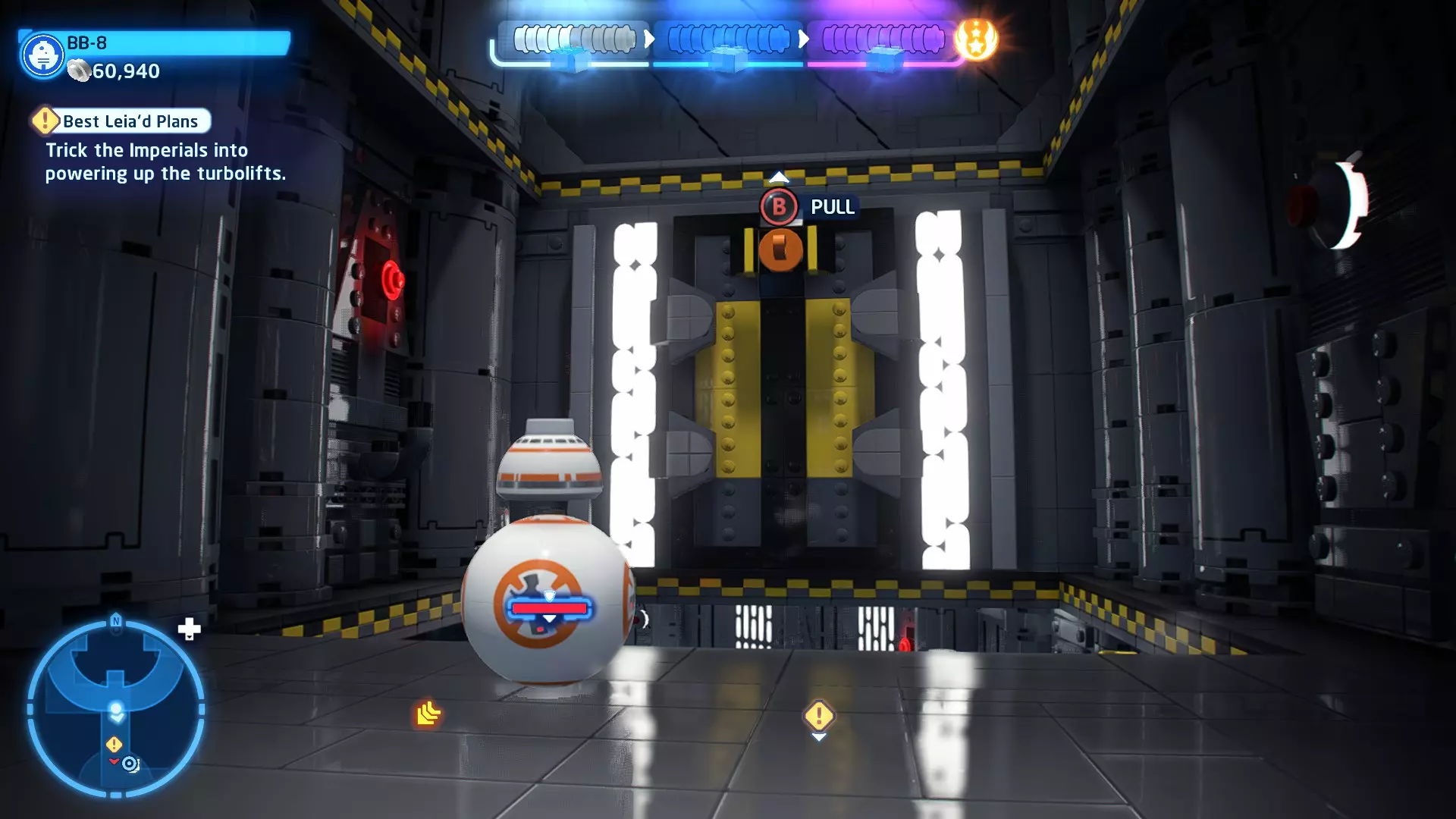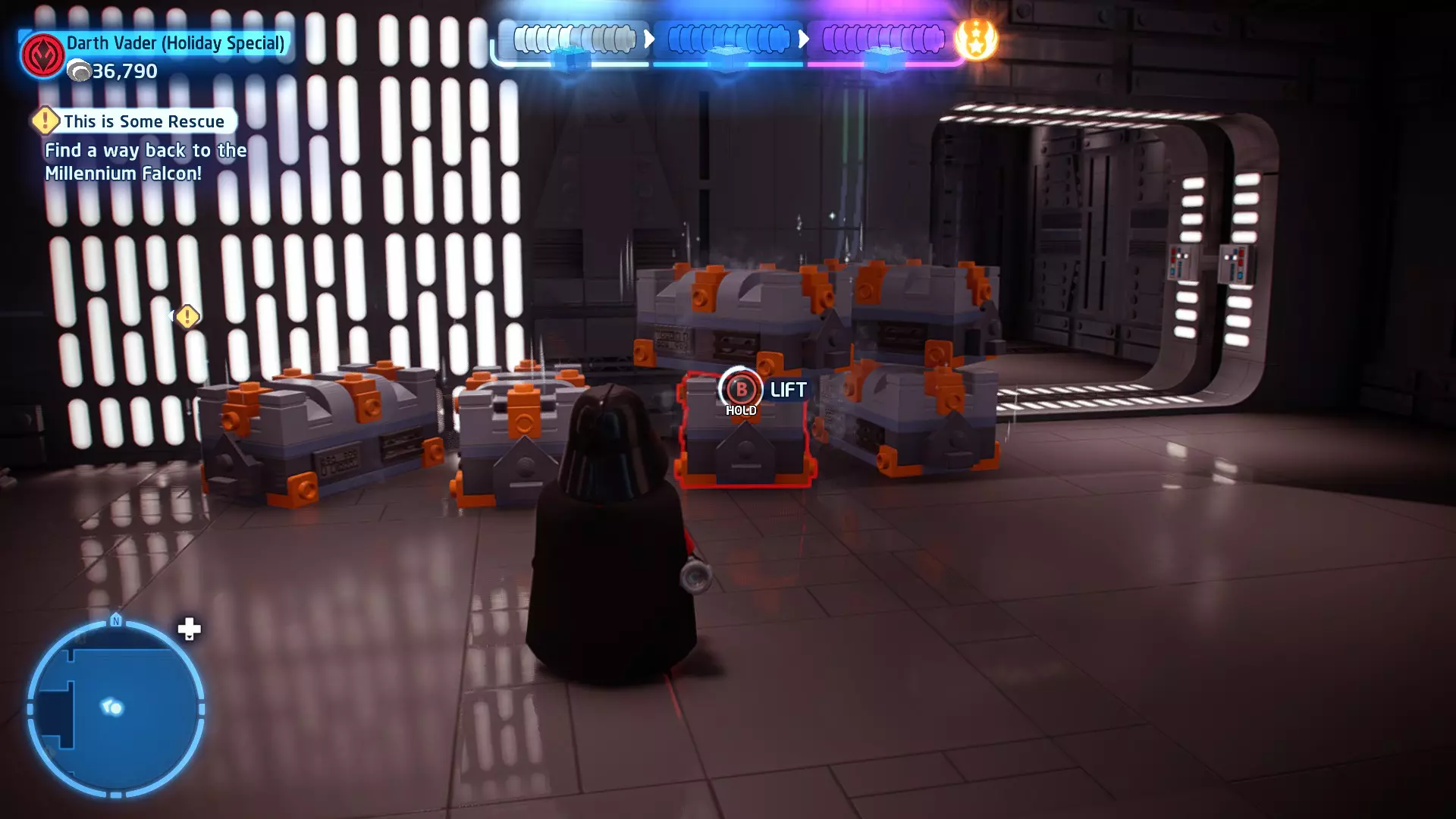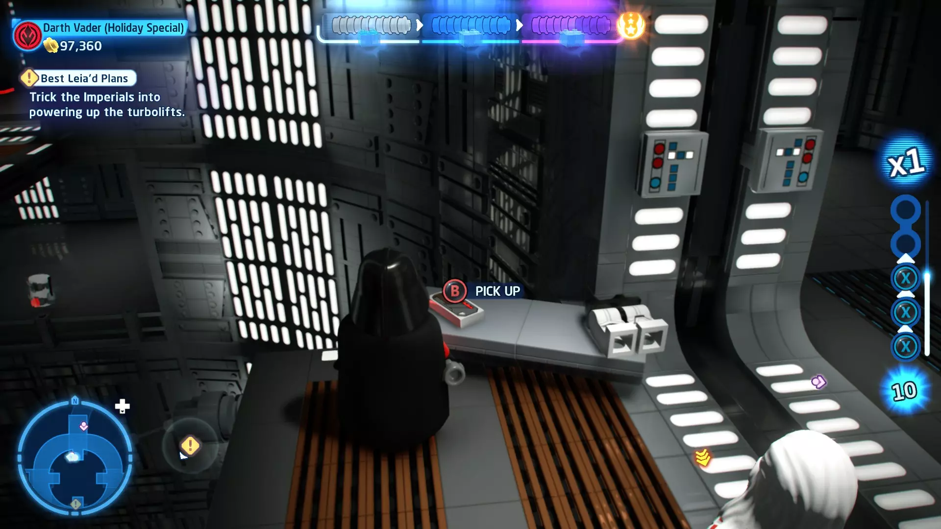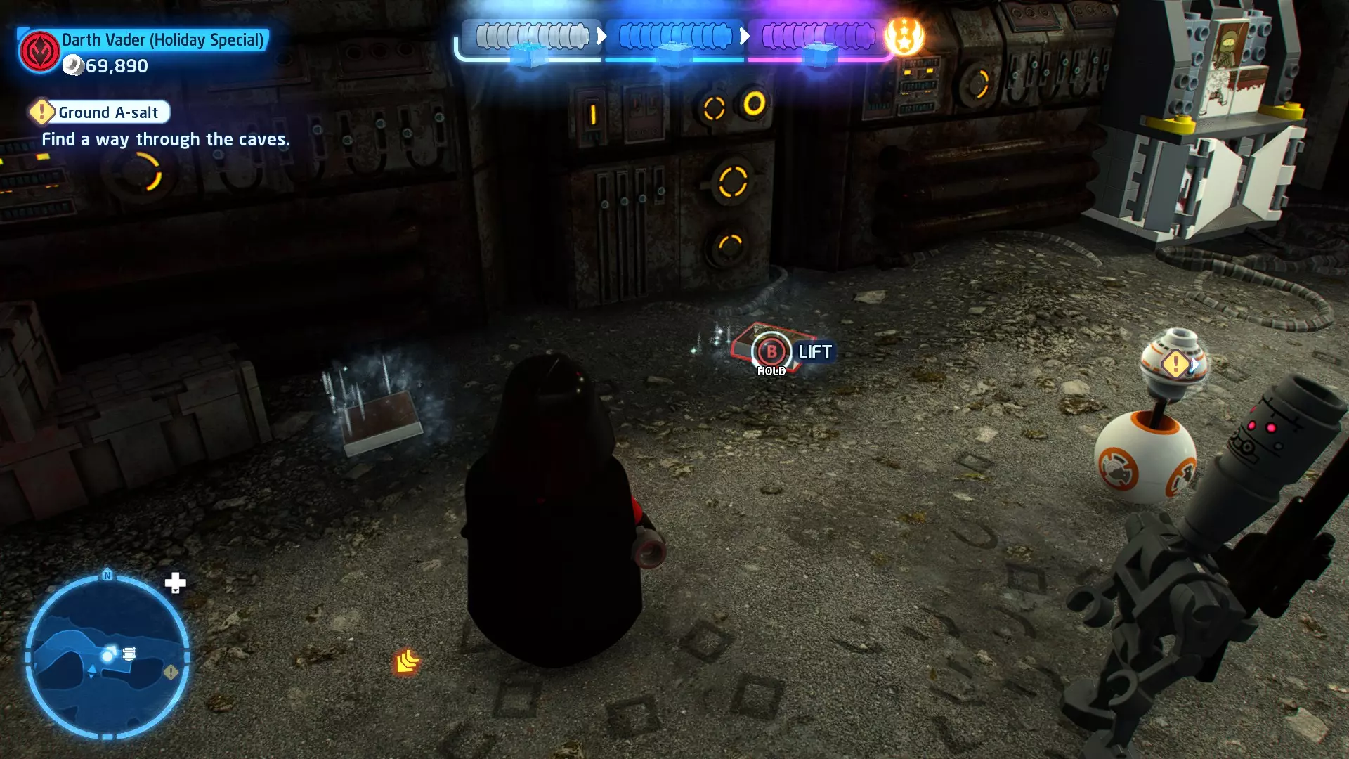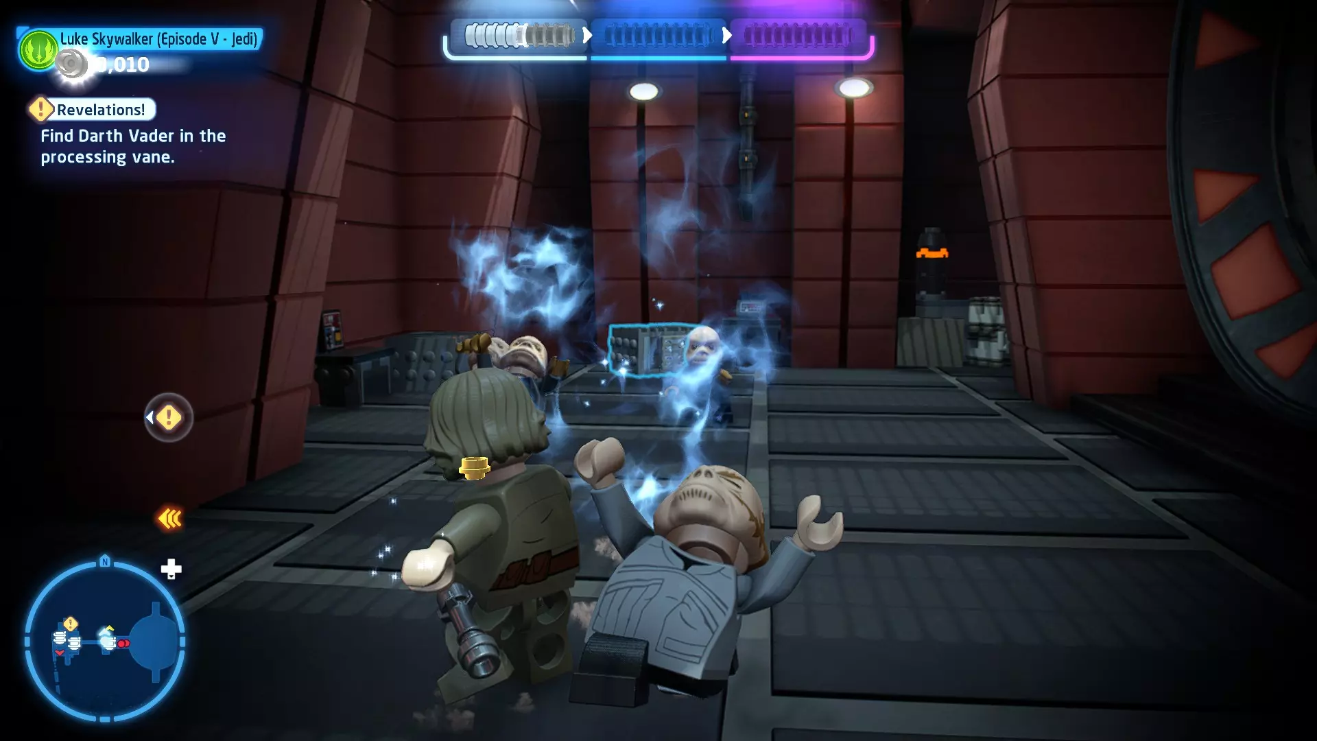 拥有此能力的角色可以使用原力与物体互动。可被原力影响的物体会有与你角色光/暗面阵营相对应的彩色轮廓。按住【特殊】键拿起物品,然后再次按下【特殊】键放下物品(或按RT键投掷!)。物品在空中时,你也可以使用方向键移动它们。