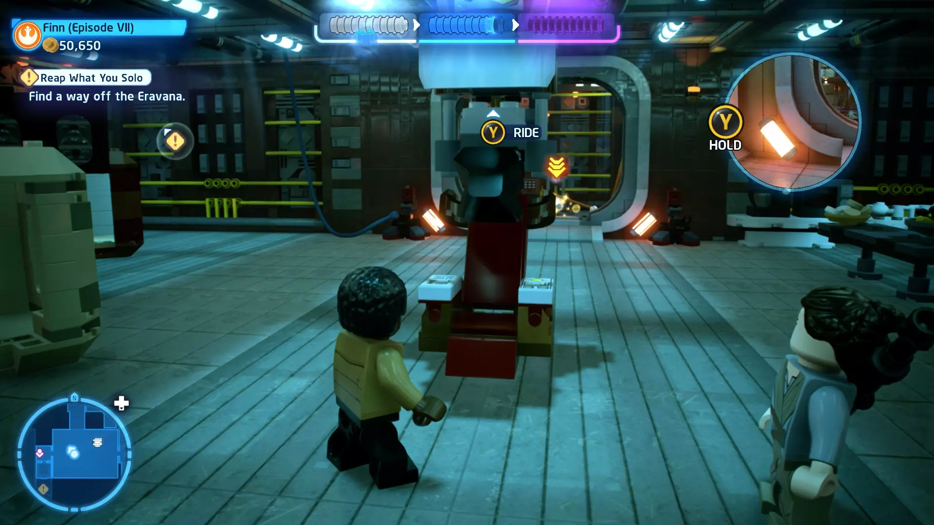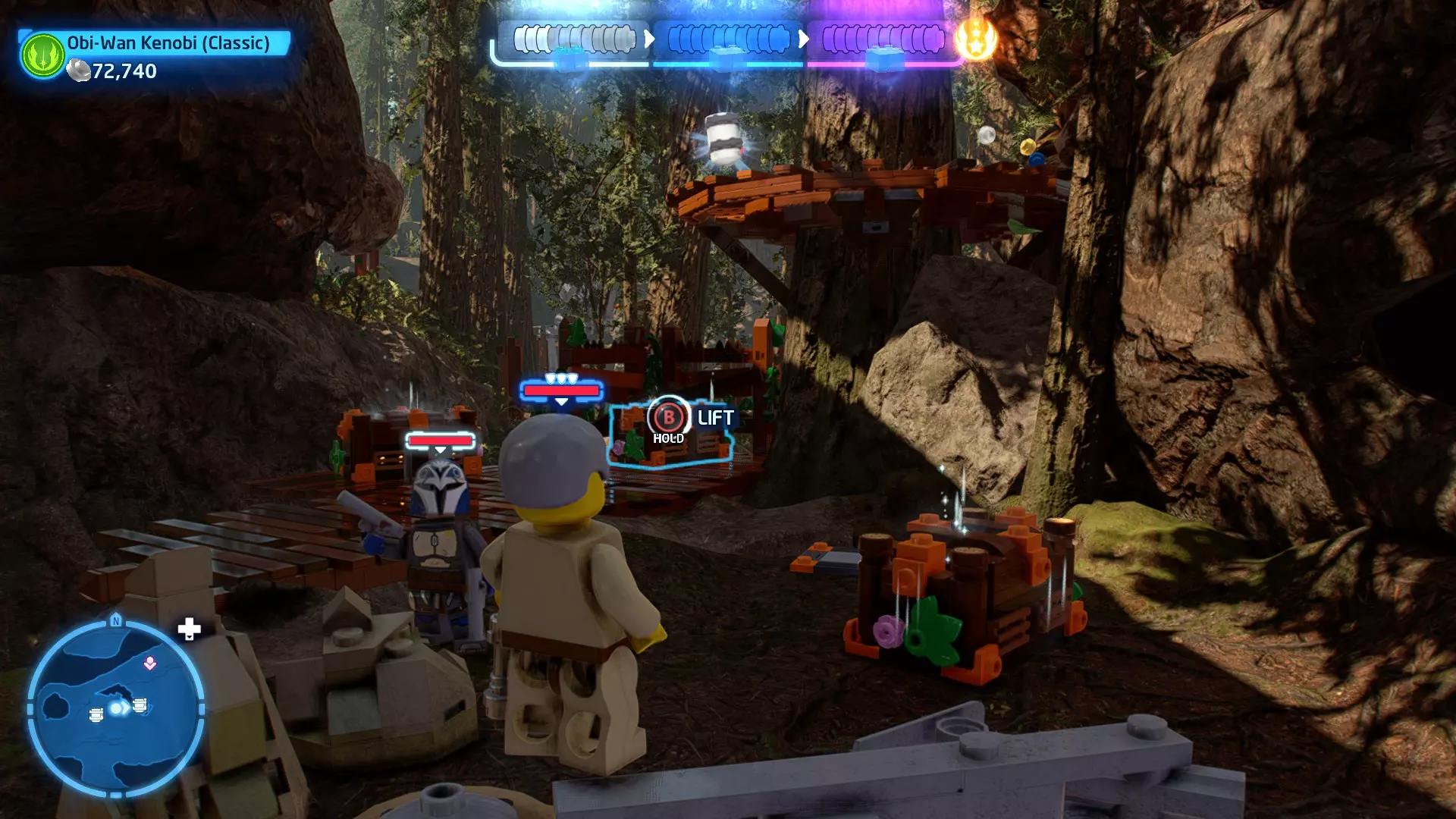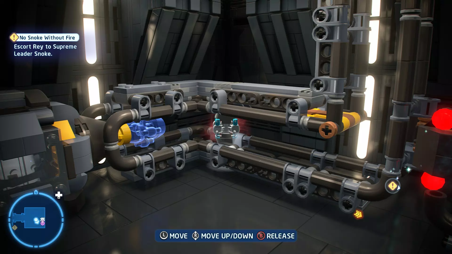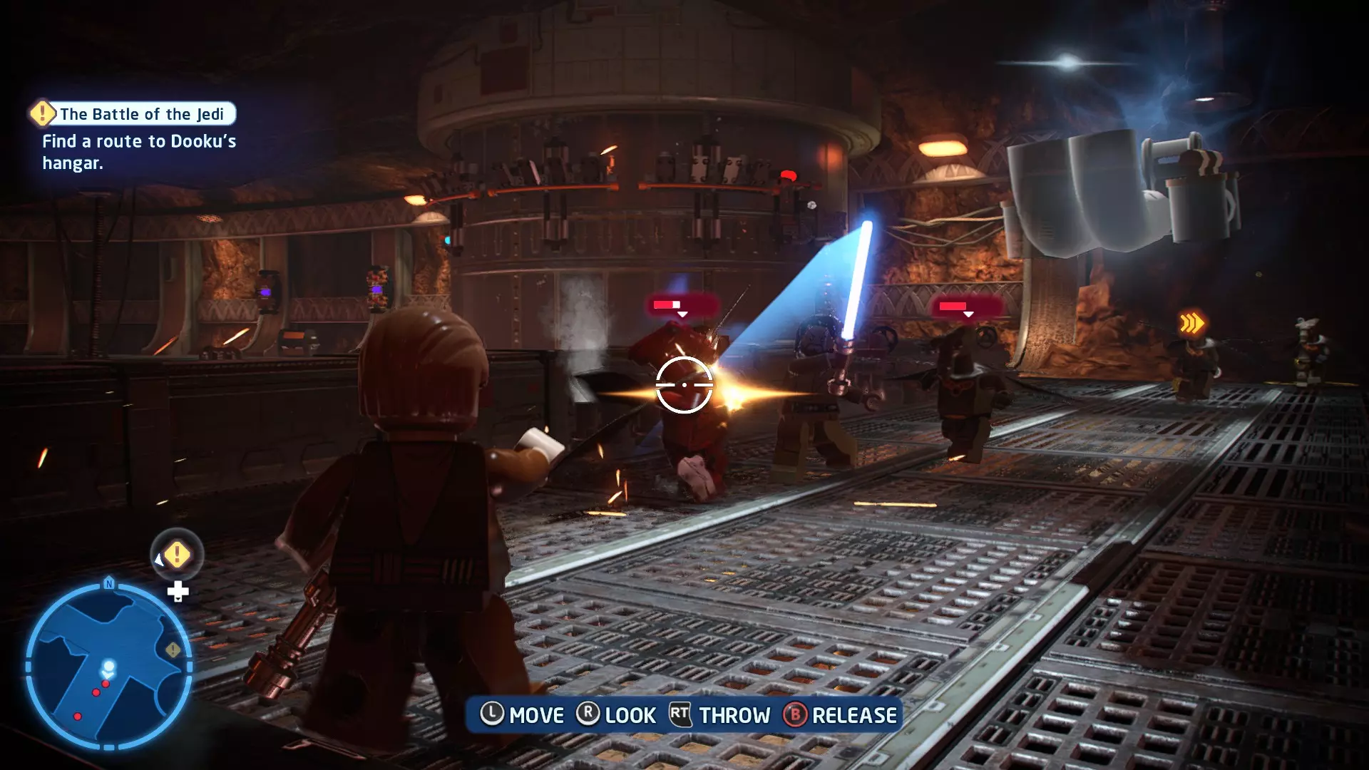 拥有此能力的角色可以使用原力与物体互动。可被原力影响的物体会有与你角色光/暗面阵营相对应的彩色轮廓。按住【特殊】键拿起物品,然后再次按下【特殊】键放下物品(或按RT键投掷!)。物品在空中时,你也可以使用方向键移动它们。