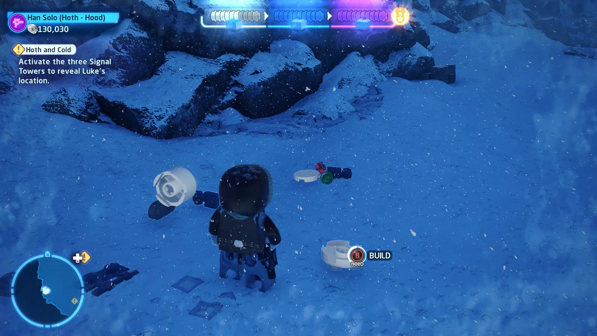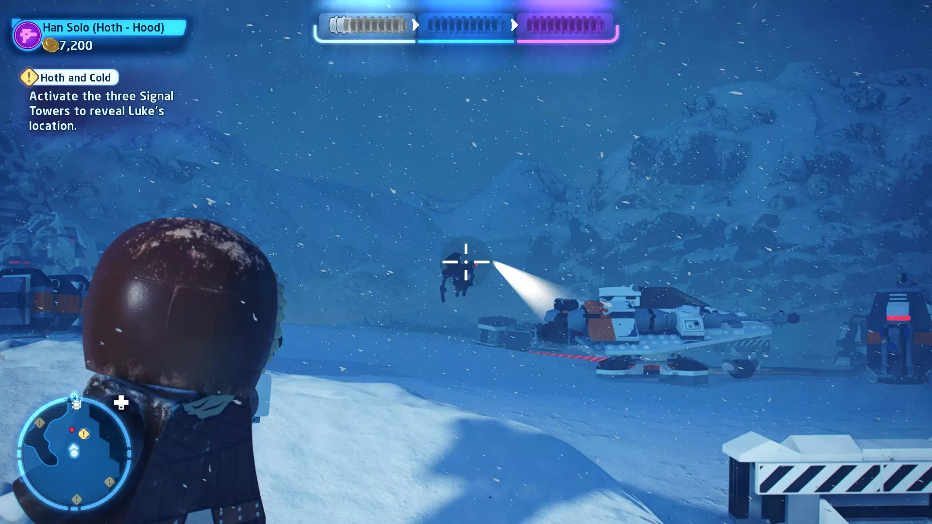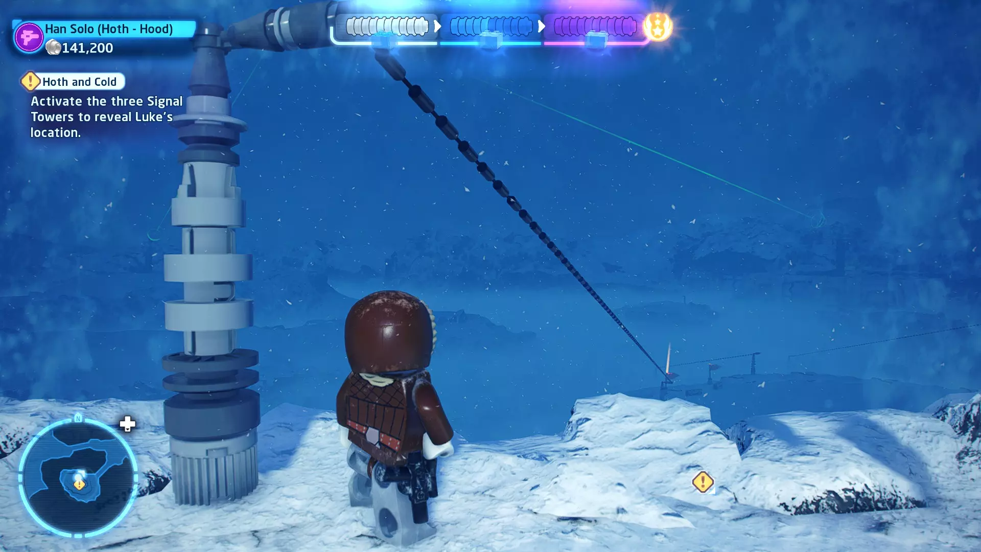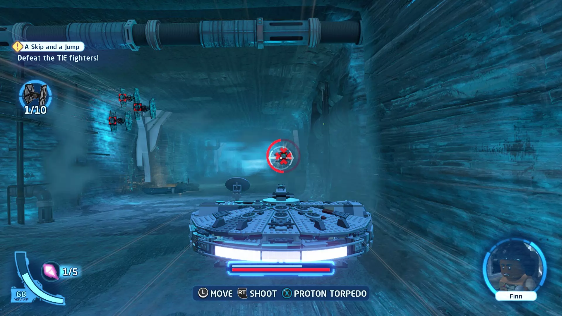 敌人:第一秩序TIE战斗机 初始角色:波·达默龙(第九部)、芬恩(第九部) 初始载具:千年隼号(第九部) 真绝地值:100,000 第一部分 - 逃离辛塔冰川殖民地 当前任务目标:摧毁TIE战斗机! 为了带着布利奥的消息 escape,我们需要击败来袭的TIE战斗机。摧毁10架TIE战斗机,任务目标将更新。 新任务目标:击落起重机! 继续飞行时,你会发现前方有三个标记目标。射击这些目标以击落起重机,并用巨石砸向TIE战斗机! 新任务目标:逃离第一秩序! 大部分TIE战斗机已被消灭,是时候进行光速跳跃了!按照出现的按钮提示操作以躲避TIE战斗机,完成本关卡。已解锁角色:芬恩(第九部)、波·达默龙(第九部)、布利奥(100,000) 已解锁载具:千年隼(第九部) 一小跳 - 迷你套件 注意:这些迷你套件会随机出现在关卡各处,与你选择飞行的隧道无关。每个迷你套件都会被标记为目标(周围有红色方框),以便你更容易发现它们 迷你套件1 - 起重机与收获