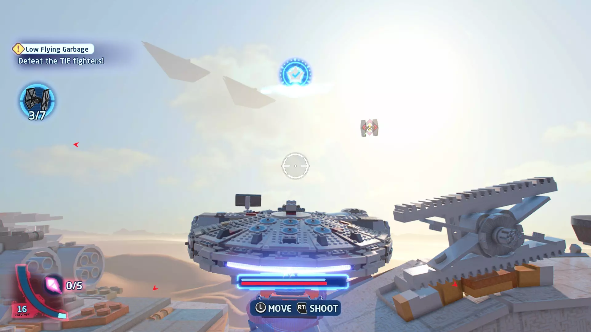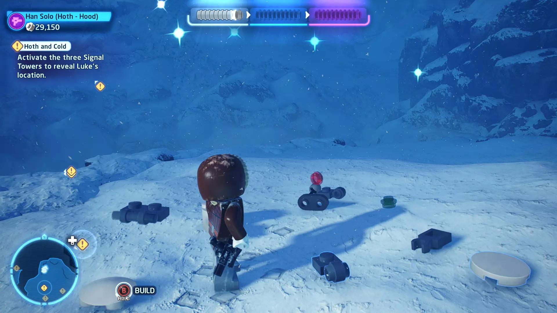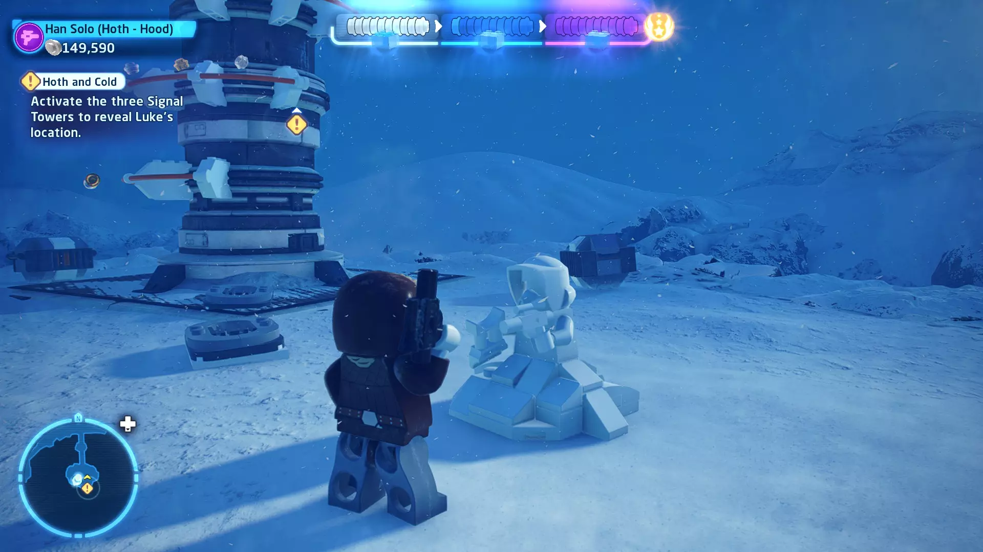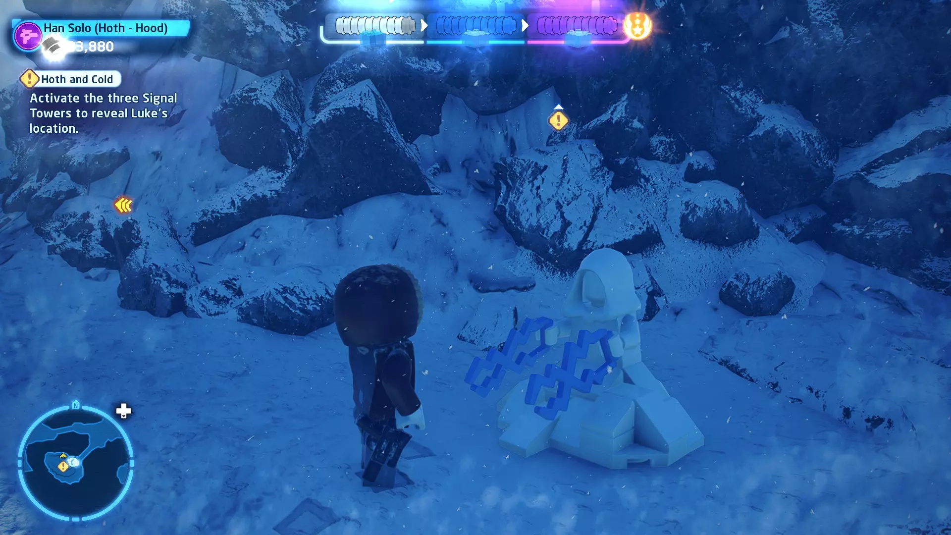 敌人:第一秩序TIE战斗机 初始角色:波·达默龙(第九部)、芬恩(第九部) 初始载具:千年隼号(第九部) 真绝地值:100,000 第一部分 - 逃离辛塔冰川殖民地 当前任务目标:摧毁TIE战斗机! 为了带着布利奥的消息 escape,我们需要击败来袭的TIE战斗机。摧毁10架TIE战斗机,任务目标将更新。 新任务目标:击落起重机! 继续飞行时,你会发现前方有三个标记目标。射击这些目标以击落起重机,并用巨石砸向TIE战斗机! 新任务目标:逃离第一秩序! 大部分TIE战斗机已被消灭,是时候进行光速跳跃了!按照出现的按钮提示操作以躲避TIE战斗机,完成本关卡。已解锁角色:芬恩(第九部)、波·达默龙(第九部)、布利奥(100,000) 已解锁载具:千年隼(第九部) 一小跳 - 迷你套件 注意:这些迷你套件会随机出现在关卡各处,与你选择飞行的隧道无关。每个迷你套件都会被标记为目标(周围有红色方框),以便你更容易发现它们 迷你套件1 - 起重机与收获