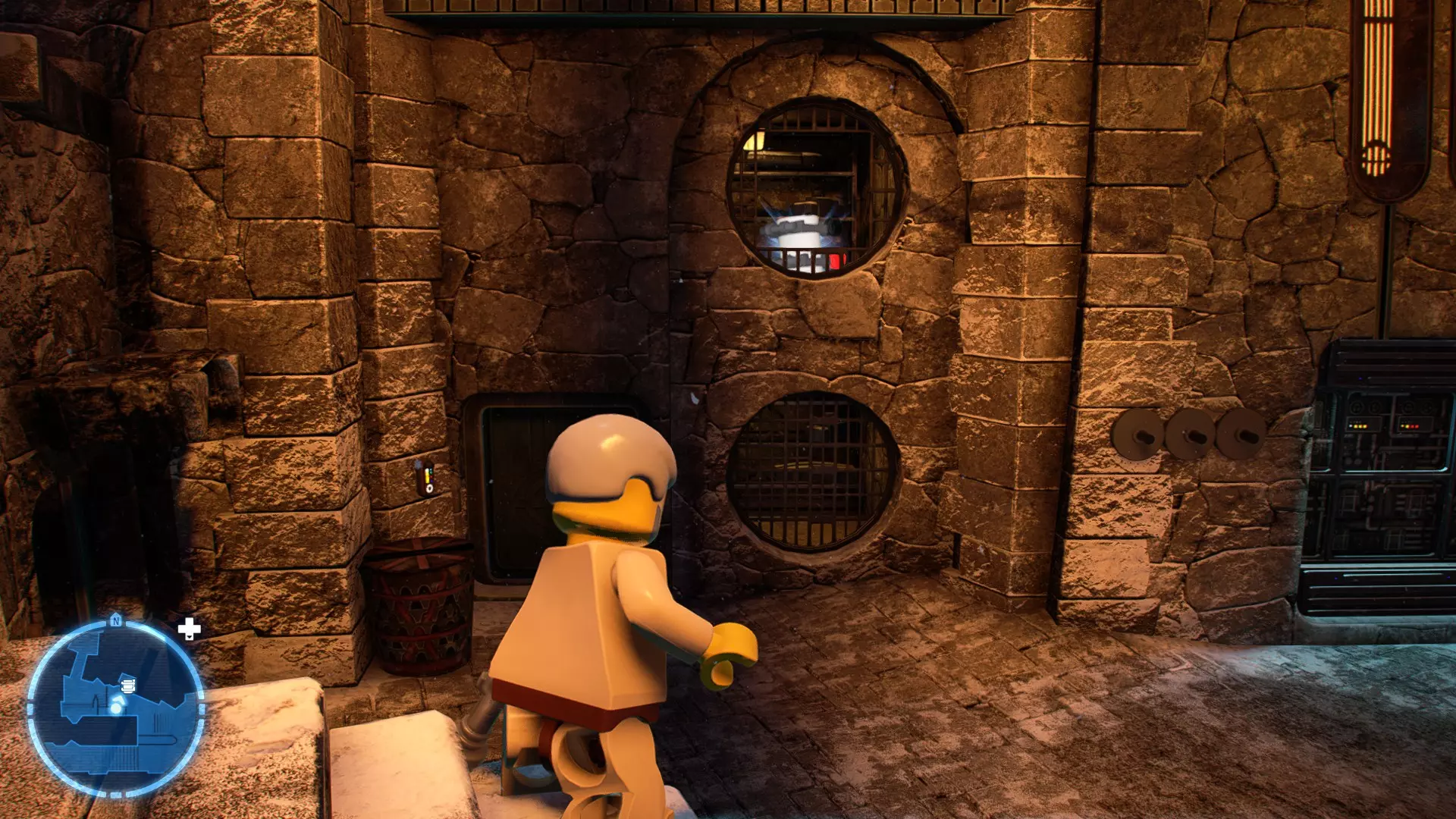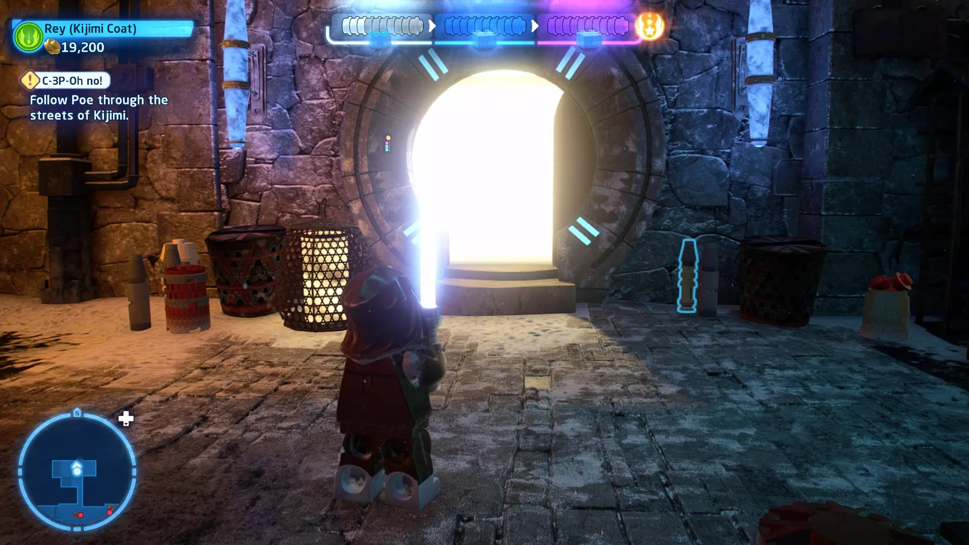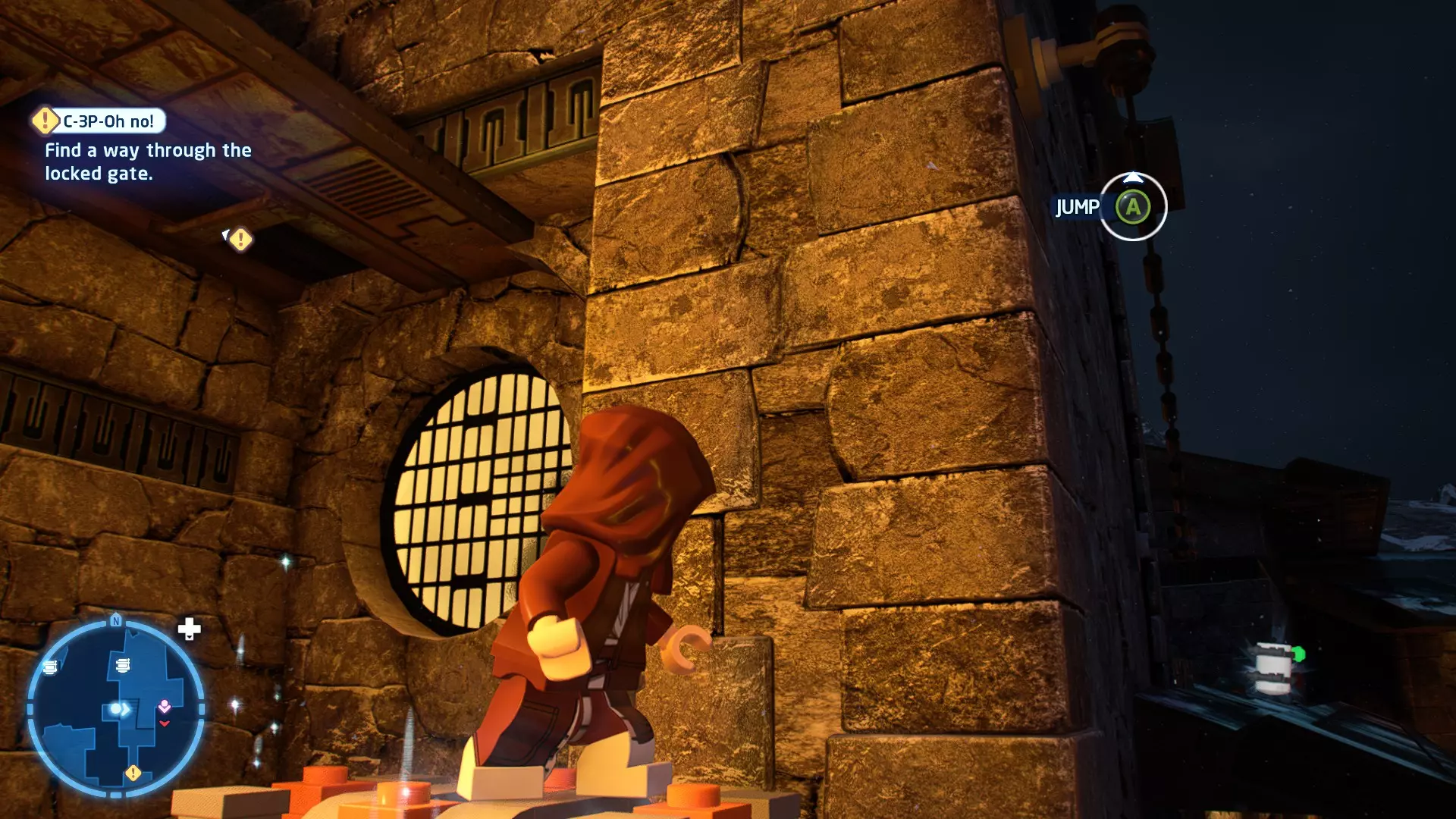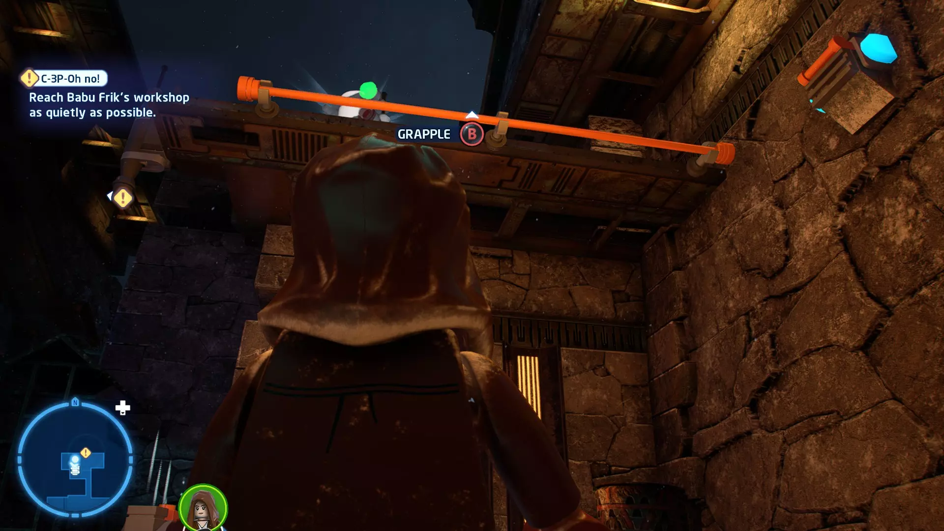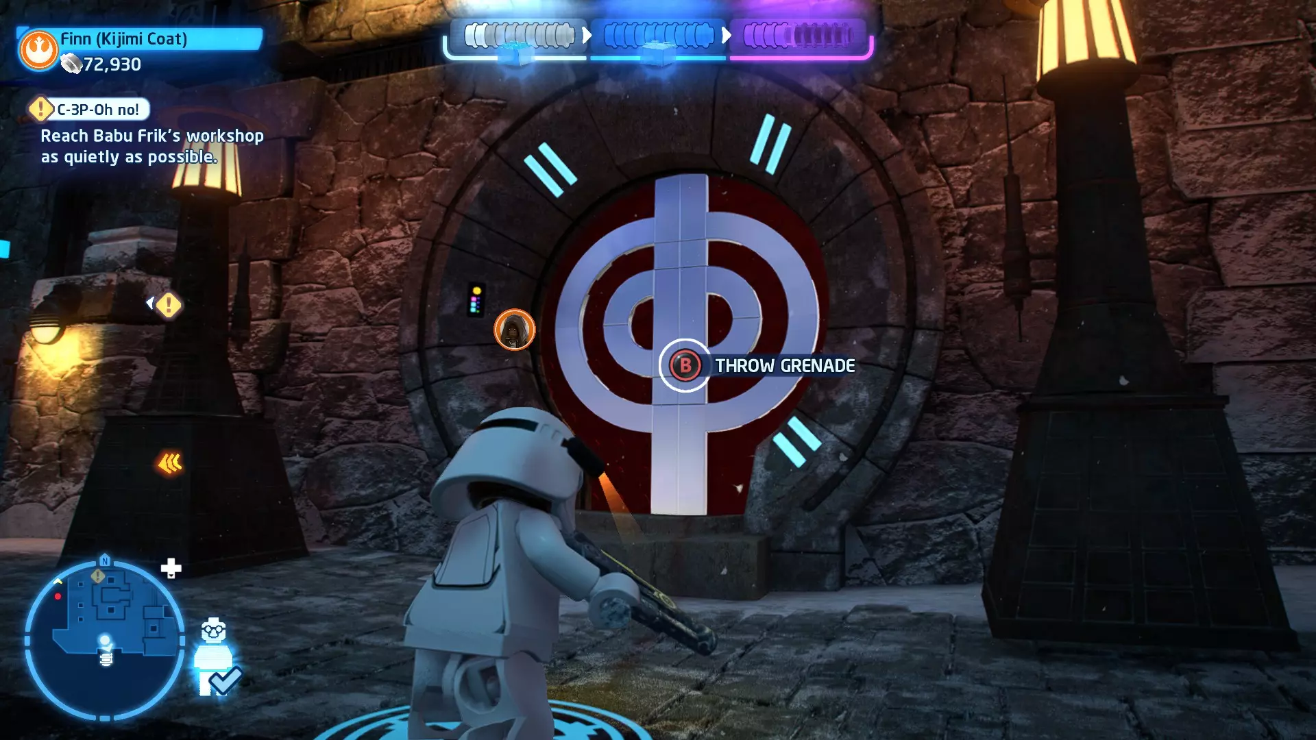敌人:基吉米恶棍、第一秩序寒地突击士兵、第一秩序军官(基吉米) 初始角色:芬恩(基吉米外套)、蕾伊(基吉米外套)、C-3PO(基吉米外套) 真绝地分数:90,000 第一部分 - 基吉米城 当前目标:跟随波穿过基吉米的街道 跟随波沿街前行,你会遇到第一秩序的巡逻队。短暂过场后,波会着手开门。但电源已被切断,你需要想办法恢复电力。 幸运的是,在附近的小巷(UA-TT步行机所在的 ledge 下方)可以找到一个能量核心。拿起能量核心并放入插槽中打开门,即可继续前进。继续沿街走,你会遇到更多士兵。新目标:找到通过上锁大门的方法 你会遇到两名第一秩序士兵,波会指示你悄悄靠近其中一人并将其解决。走到一人身后,按照按钮提示将其解决(波会解决另一名士兵)。接下来你需要解决屋顶上的士兵。射击其中一名士兵将其解决(波会解决另一名),然后继续朝大门前进。 这扇大门也被锁住了,我们需要找到另一个能量核心来打开它。返回楼梯下方,摧毁发光的箱子以露出能量核心,然后使用原力将其从插槽中取出。拿起能量核心并带回楼梯上方,接着使用原力堆叠箱子,这样你就能跳上大门上方的 ledge。将能量核心放入插槽以打开大门,这样你就能继续前进。 新目标:跟随波伊穿过基吉米的街道 沿着街道继续前进,你会遭到一些基吉米恶棍的袭击! 新目标:抵御恶棍的攻击! 击败来袭的恶棍后,第一秩序巡逻队将会出现! 新目标:让第一秩序通过或与他们战斗! 随后会有一支第一秩序巡逻队经过该区域。正如你的任务目标所示,你可以选择让士兵通过,或者从藏身之处出来与他们战斗。一旦士兵离开,将会播放一段过场动画。 新目标:找到通过锁着的大门的方法 由佐丽带路,跟随她和波伊走上台阶,朝大门走去。佐丽会拿出一个能量核心,为大门供能。不幸的是,电源将会短路,导致大门无法打开。对大门使用原力,然后按方向键上打开大门,即可继续前进。 新任务目标:尽可能安静地抵达巴布·弗里克的工坊 巴布·弗里克的工坊位于庭院的另一边,有以下几种抵达方式: 1. 战斗 2. 潜行 3. 清理庭院 战斗:你可以直接穿过庭院,疯狂冲向巴布的工坊。虽然这会暴露你的行踪,但却是抵达工坊最简单的方法。如果被士兵发现,你需要先击败庭院内的所有敌人才能进入工坊。 潜行:虽然比其他方法更具挑战性,但也可以悄悄穿过庭院。沿着庭院外围移动,避开黄色圆圈(这些代表士兵的视野范围)。你可以使用潜行攻击来消灭遇到的任何士兵。 清理庭院:你也可以通过清理庭院内的士兵到达巴布的工坊。要做到这一点,你需要激活庭院北侧的反派终端。你可以通过给芬恩穿上伪装(使用本关卡早些时候士兵掉落的盔甲碎片),或者悄悄靠近正在使用面板的军官并对他使用“影响”心灵控制术来完成。 已解锁角色:C-3PO(基吉米外套)、C-3PO(红眼)、芬恩(基吉米外套)、波·达默龙(基吉米外套)、蕾伊(基吉米外套)、佐里·布利斯 C-3P-哦不!- 迷你套件 所需能力:拆解、爆破、原力、抓钩、网发射器 迷你套件1 - 夜晚发出声响的贡克机器人
