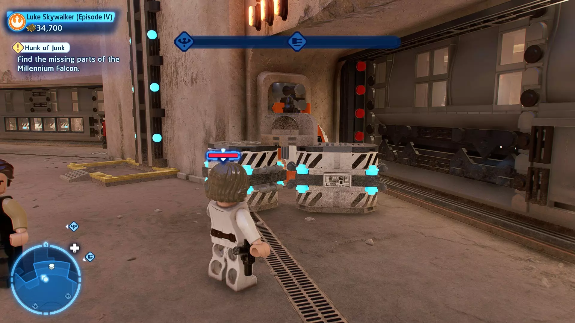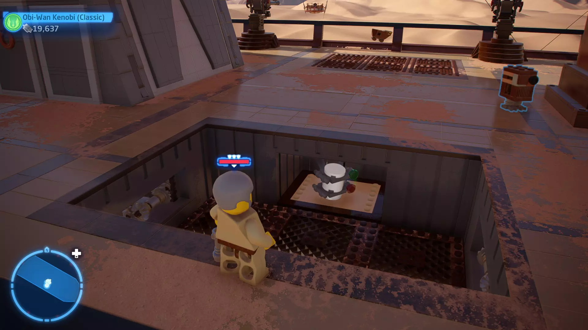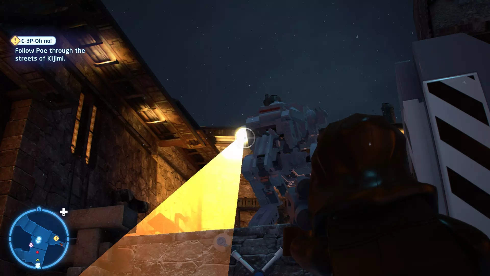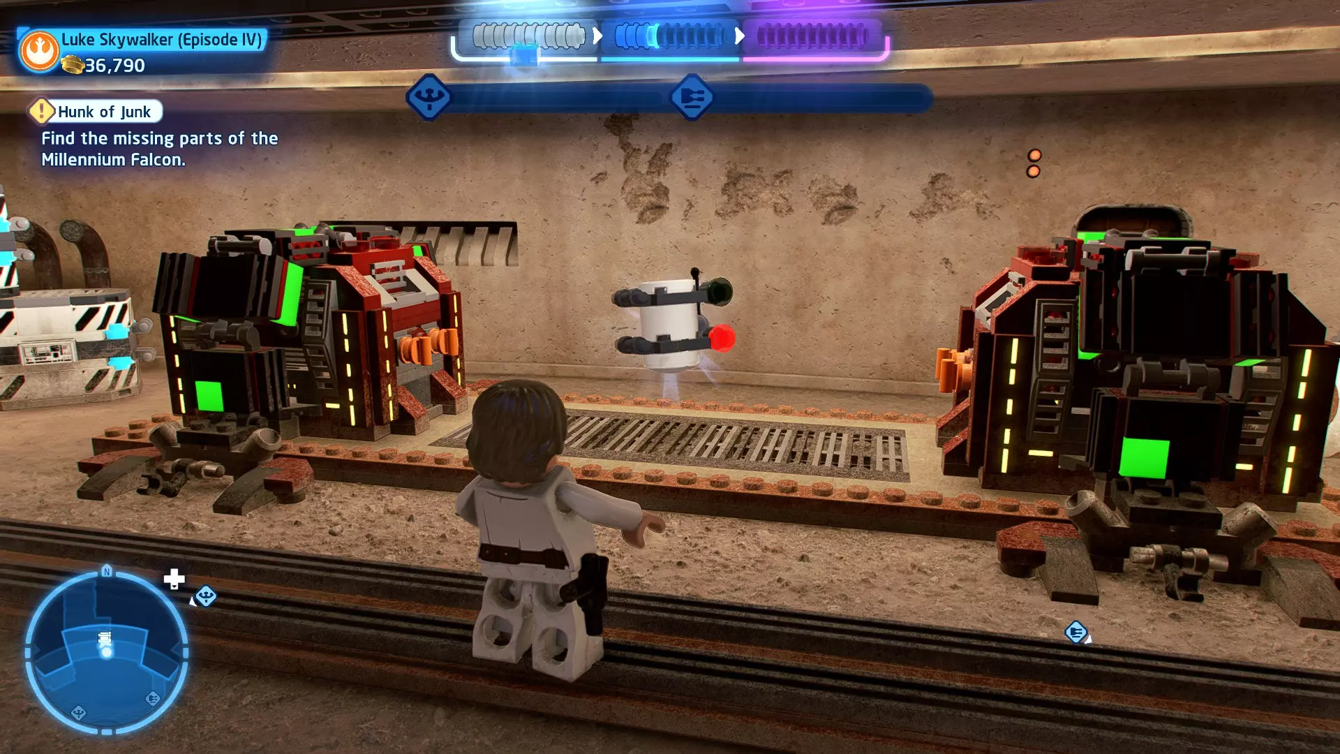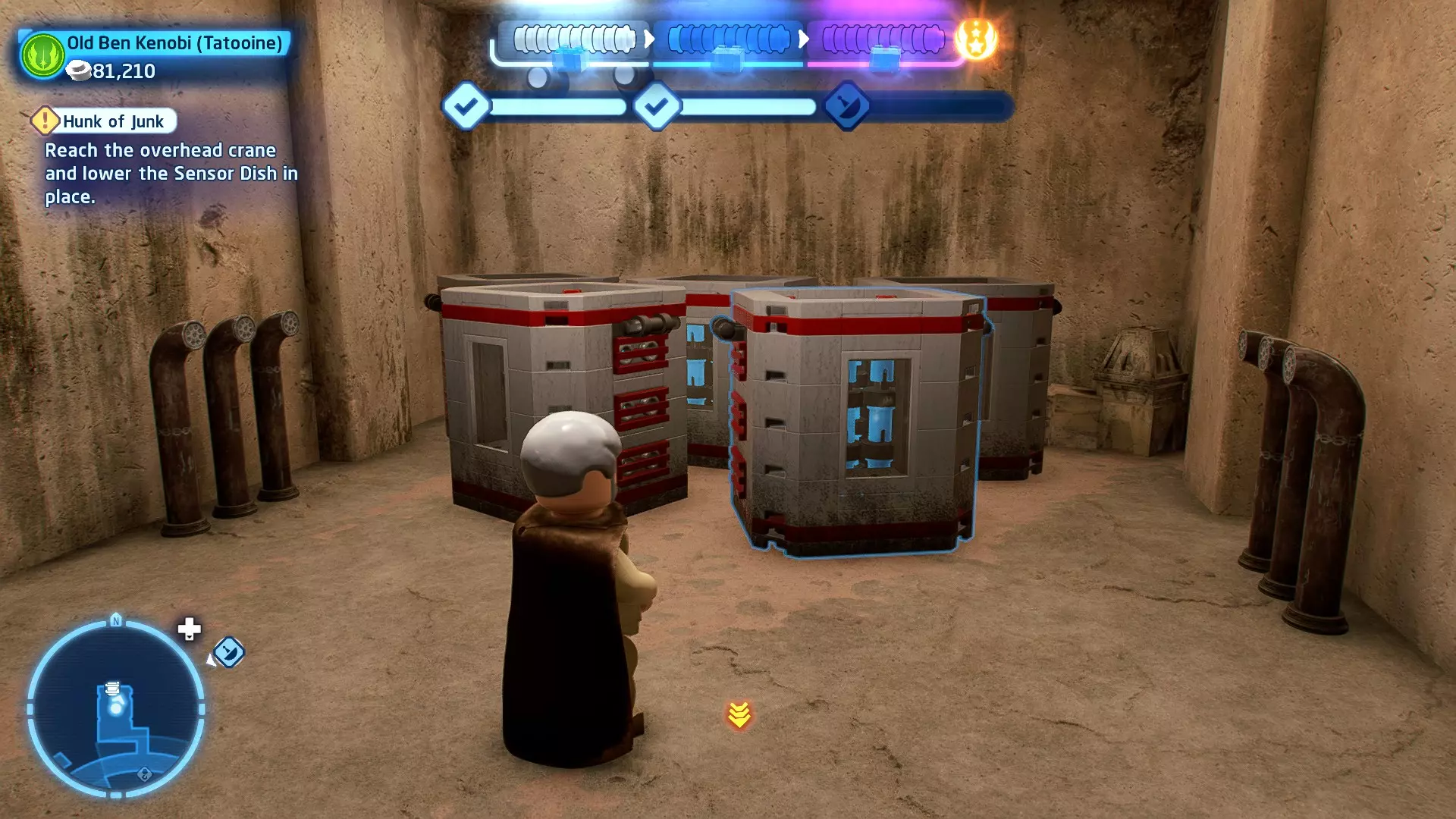 敌人:基吉米恶棍、第一秩序寒地突击士兵、第一秩序军官(基吉米) 初始角色:芬恩(基吉米外套)、蕾伊(基吉米外套)、C-3PO(基吉米外套) 真绝地分数:90,000 第一部分 - 基吉米城 当前目标:跟随波穿过基吉米的街道 跟随波沿街前行,你会遇到第一秩序的巡逻队。短暂过场后,波会着手开门。但电源已被切断,你需要想办法恢复电力。 幸运的是,在附近的小巷(UA-TT步行机所在的 ledge 下方)可以找到一个能量核心。拿起能量核心并放入插槽中打开门,即可继续前进。继续沿街走,你会遇到更多士兵。新目标:找到通过上锁大门的方法 你会遇到两名第一秩序士兵,波会指示你悄悄靠近其中一人并将其解决。走到一人身后,按照按钮提示将其解决(波会解决另一名士兵)。接下来你需要解决屋顶上的士兵。射击其中一名士兵将其解决(波会解决另一名),然后继续朝大门前进。 这扇大门也被锁住了,我们需要找到另一个能量核心来打开它。返回楼梯下方,摧毁发光的箱子以露出能量核心,然后使用原力将其从插槽中取出。拿起能量核心并带回楼梯上方,接着使用原力堆叠箱子,这样你就能跳上大门上方的 ledge。将能量核心放入插槽以打开大门,这样你就能继续前进。 新目标:跟随波伊穿过基吉米的街道 沿着街道继续前进,你会遭到一些基吉米恶棍的袭击! 新目标:抵御恶棍的攻击! 击败来袭的恶棍后,第一秩序巡逻队将会出现! 新目标:让第一秩序通过或与他们战斗! 随后会有一支第一秩序巡逻队经过该区域。正如你的任务目标所示,你可以选择让士兵通过,或者从藏身之处出来与他们战斗。一旦士兵离开,将会播放一段过场动画。 新目标:找到通过锁着的大门的方法 由佐丽带路,跟随她和波伊走上台阶,朝大门走去。佐丽会拿出一个能量核心,为大门供能。不幸的是,电源将会短路,导致大门无法打开。对大门使用原力,然后按方向键上打开大门,即可继续前进。 新任务目标:尽可能安静地抵达巴布·弗里克的工坊 巴布·弗里克的工坊位于庭院的另一边,有以下几种抵达方式: 1. 战斗 2. 潜行 3. 清理庭院 战斗:你可以直接穿过庭院,疯狂冲向巴布的工坊。虽然这会暴露你的行踪,但却是抵达工坊最简单的方法。如果被士兵发现,你需要先击败庭院内的所有敌人才能进入工坊。 潜行:虽然比其他方法更具挑战性,但也可以悄悄穿过庭院。沿着庭院外围移动,避开黄色圆圈(这些代表士兵的视野范围)。你可以使用潜行攻击来消灭遇到的任何士兵。 清理庭院:你也可以通过清理庭院内的士兵到达巴布的工坊。要做到这一点,你需要激活庭院北侧的反派终端。你可以通过给芬恩穿上伪装(使用本关卡早些时候士兵掉落的盔甲碎片),或者悄悄靠近正在使用面板的军官并对他使用“影响”心灵控制术来完成。 已解锁角色:C-3PO(基吉米外套)、C-3PO(红眼)、芬恩(基吉米外套)、波·达默龙(基吉米外套)、蕾伊(基吉米外套)、佐里·布利斯 C-3P-哦不!- 迷你套件 所需能力:拆解、爆破、原力、抓钩、网发射器 迷你套件1 - 夜晚发出声响的贡克机器人