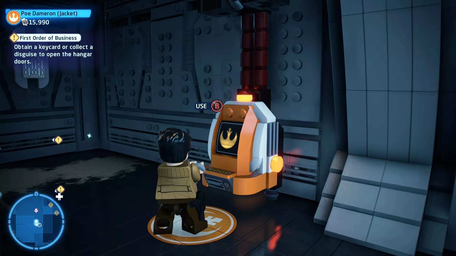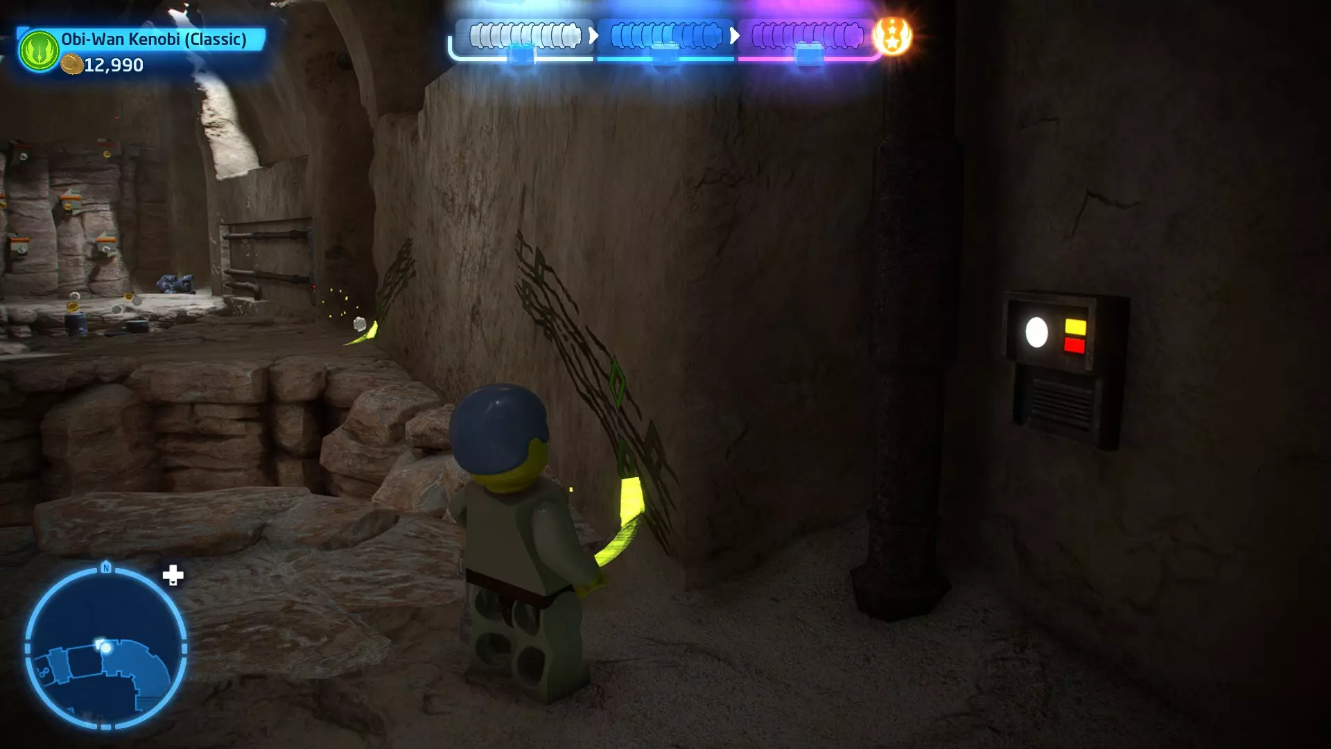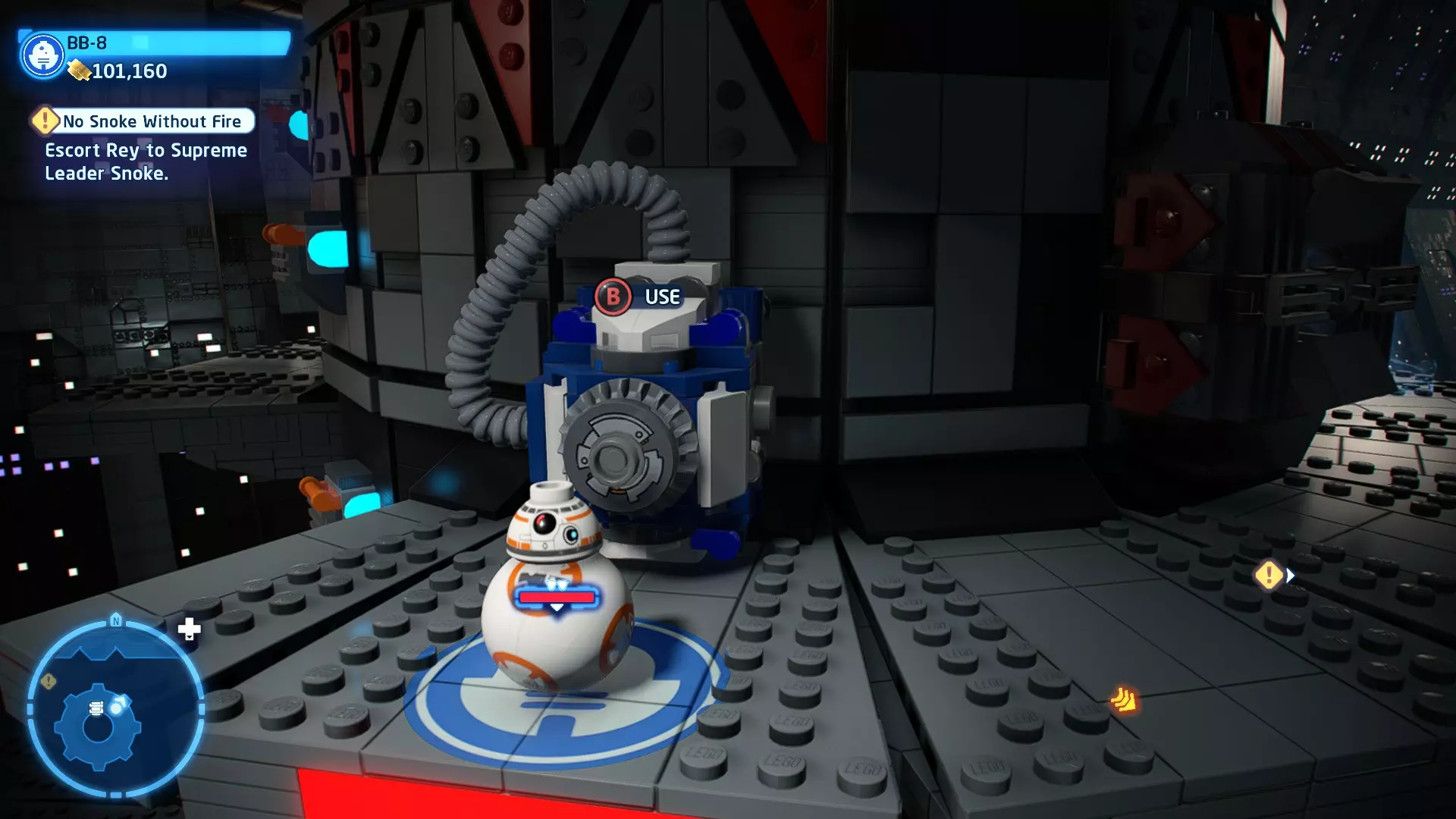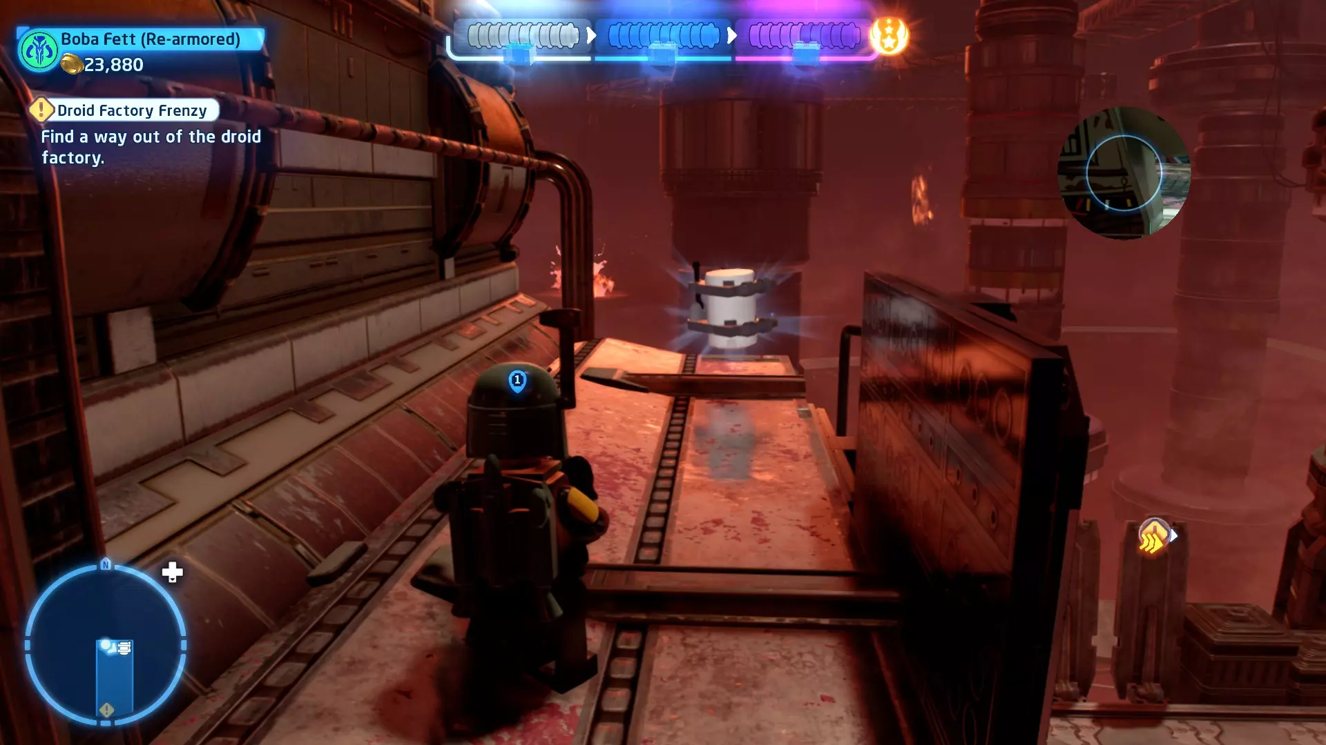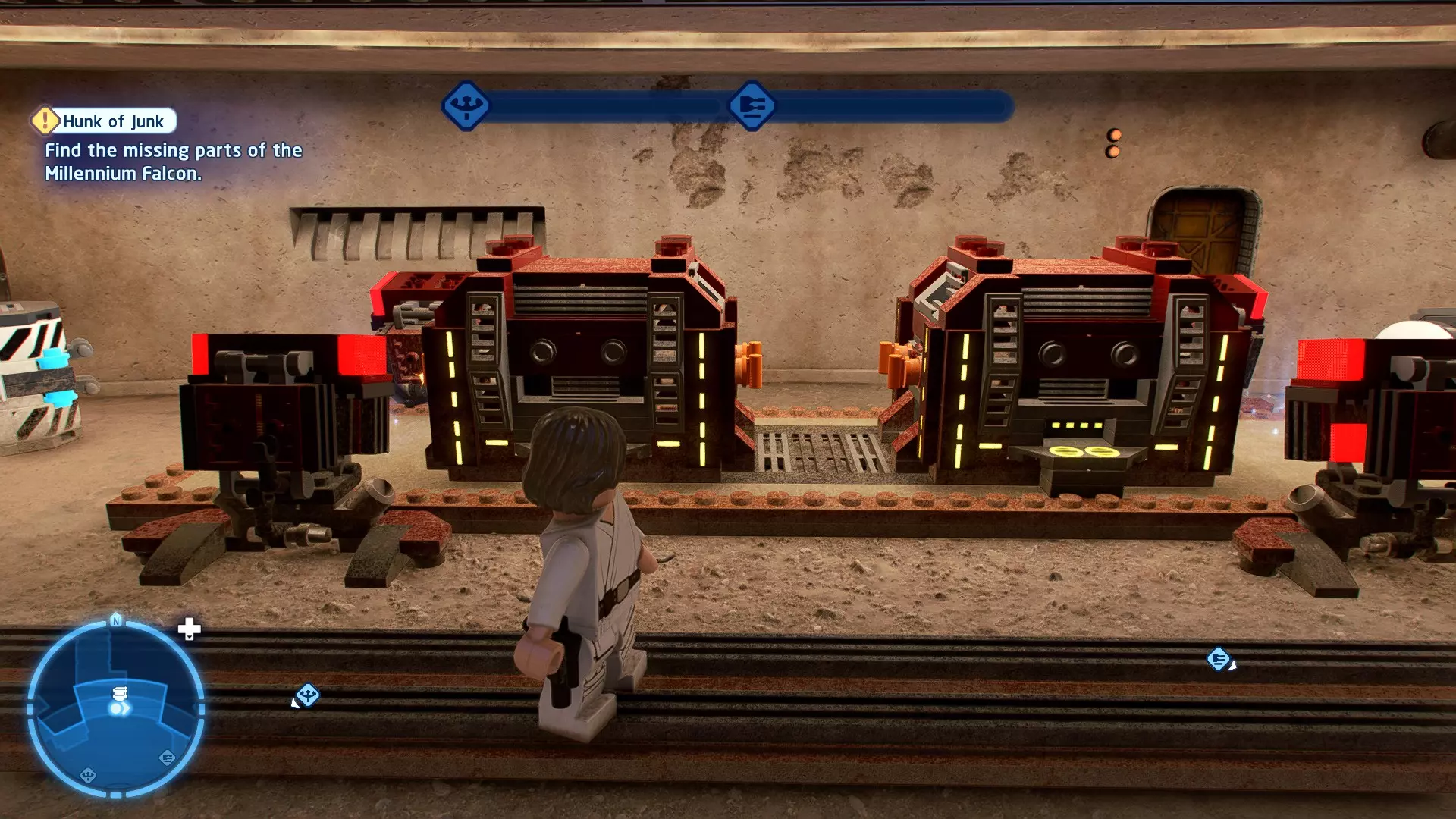 敌人:基吉米恶棍、第一秩序寒地突击士兵、第一秩序军官(基吉米) 初始角色:芬恩(基吉米外套)、蕾伊(基吉米外套)、C-3PO(基吉米外套) 真绝地分数:90,000 第一部分 - 基吉米城 当前目标:跟随波穿过基吉米的街道 跟随波沿街前行,你会遇到第一秩序的巡逻队。短暂过场后,波会着手开门。但电源已被切断,你需要想办法恢复电力。 幸运的是,在附近的小巷(UA-TT步行机所在的 ledge 下方)可以找到一个能量核心。拿起能量核心并放入插槽中打开门,即可继续前进。继续沿街走,你会遇到更多士兵。新目标:找到通过上锁大门的方法 你会遇到两名第一秩序士兵,波会指示你悄悄靠近其中一人并将其解决。走到一人身后,按照按钮提示将其解决(波会解决另一名士兵)。接下来你需要解决屋顶上的士兵。射击其中一名士兵将其解决(波会解决另一名),然后继续朝大门前进。 这扇大门也被锁住了,我们需要找到另一个能量核心来打开它。返回楼梯下方,摧毁发光的箱子以露出能量核心,然后使用原力将其从插槽中取出。拿起能量核心并带回楼梯上方,接着使用原力堆叠箱子,这样你就能跳上大门上方的 ledge。将能量核心放入插槽以打开大门,这样你就能继续前进。 新目标:跟随波伊穿过基吉米的街道 沿着街道继续前进,你会遭到一些基吉米恶棍的袭击! 新目标:抵御恶棍的攻击! 击败来袭的恶棍后,第一秩序巡逻队将会出现! 新目标:让第一秩序通过或与他们战斗! 随后会有一支第一秩序巡逻队经过该区域。正如你的任务目标所示,你可以选择让士兵通过,或者从藏身之处出来与他们战斗。一旦士兵离开,将会播放一段过场动画。 新目标:找到通过锁着的大门的方法 由佐丽带路,跟随她和波伊走上台阶,朝大门走去。佐丽会拿出一个能量核心,为大门供能。不幸的是,电源将会短路,导致大门无法打开。对大门使用原力,然后按方向键上打开大门,即可继续前进。 新任务目标:尽可能安静地抵达巴布·弗里克的工坊 巴布·弗里克的工坊位于庭院的另一边,有以下几种抵达方式: 1. 战斗 2. 潜行 3. 清理庭院 战斗:你可以直接穿过庭院,疯狂冲向巴布的工坊。虽然这会暴露你的行踪,但却是抵达工坊最简单的方法。如果被士兵发现,你需要先击败庭院内的所有敌人才能进入工坊。 潜行:虽然比其他方法更具挑战性,但也可以悄悄穿过庭院。沿着庭院外围移动,避开黄色圆圈(这些代表士兵的视野范围)。你可以使用潜行攻击来消灭遇到的任何士兵。 清理庭院:你也可以通过清理庭院内的士兵到达巴布的工坊。要做到这一点,你需要激活庭院北侧的反派终端。你可以通过给芬恩穿上伪装(使用本关卡早些时候士兵掉落的盔甲碎片),或者悄悄靠近正在使用面板的军官并对他使用“影响”心灵控制术来完成。 已解锁角色:C-3PO(基吉米外套)、C-3PO(红眼)、芬恩(基吉米外套)、波·达默龙(基吉米外套)、蕾伊(基吉米外套)、佐里·布利斯 C-3P-哦不!- 迷你套件 所需能力:拆解、爆破、原力、抓钩、网发射器 迷你套件1 - 夜晚发出声响的贡克机器人
