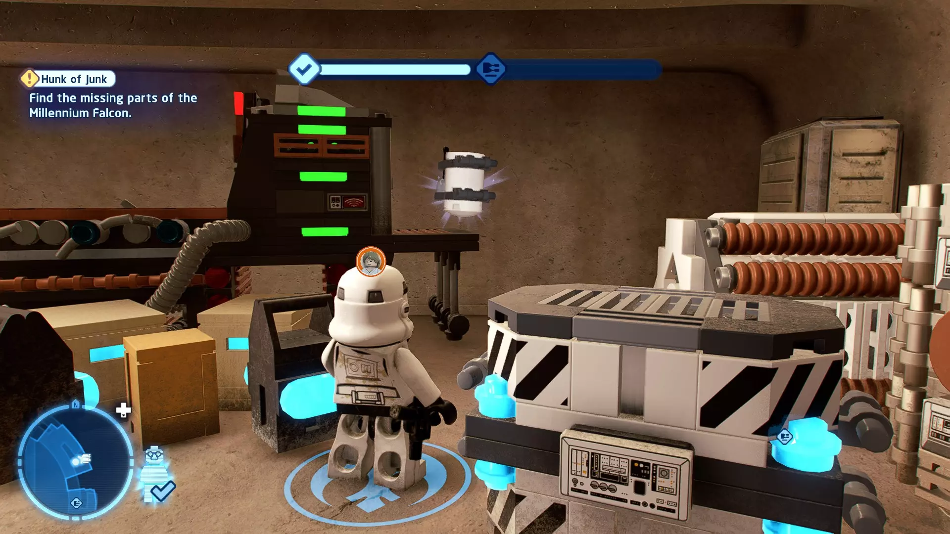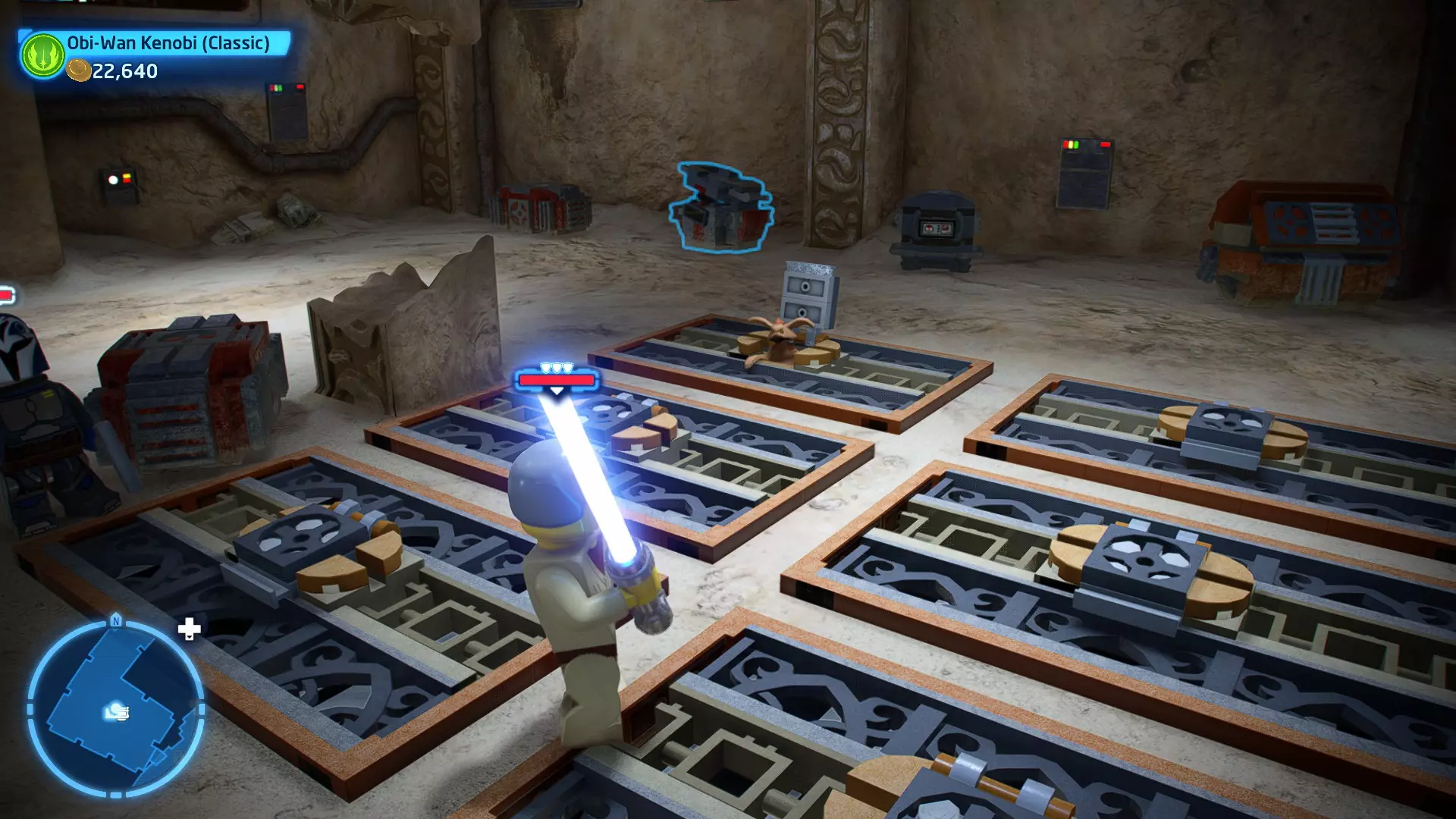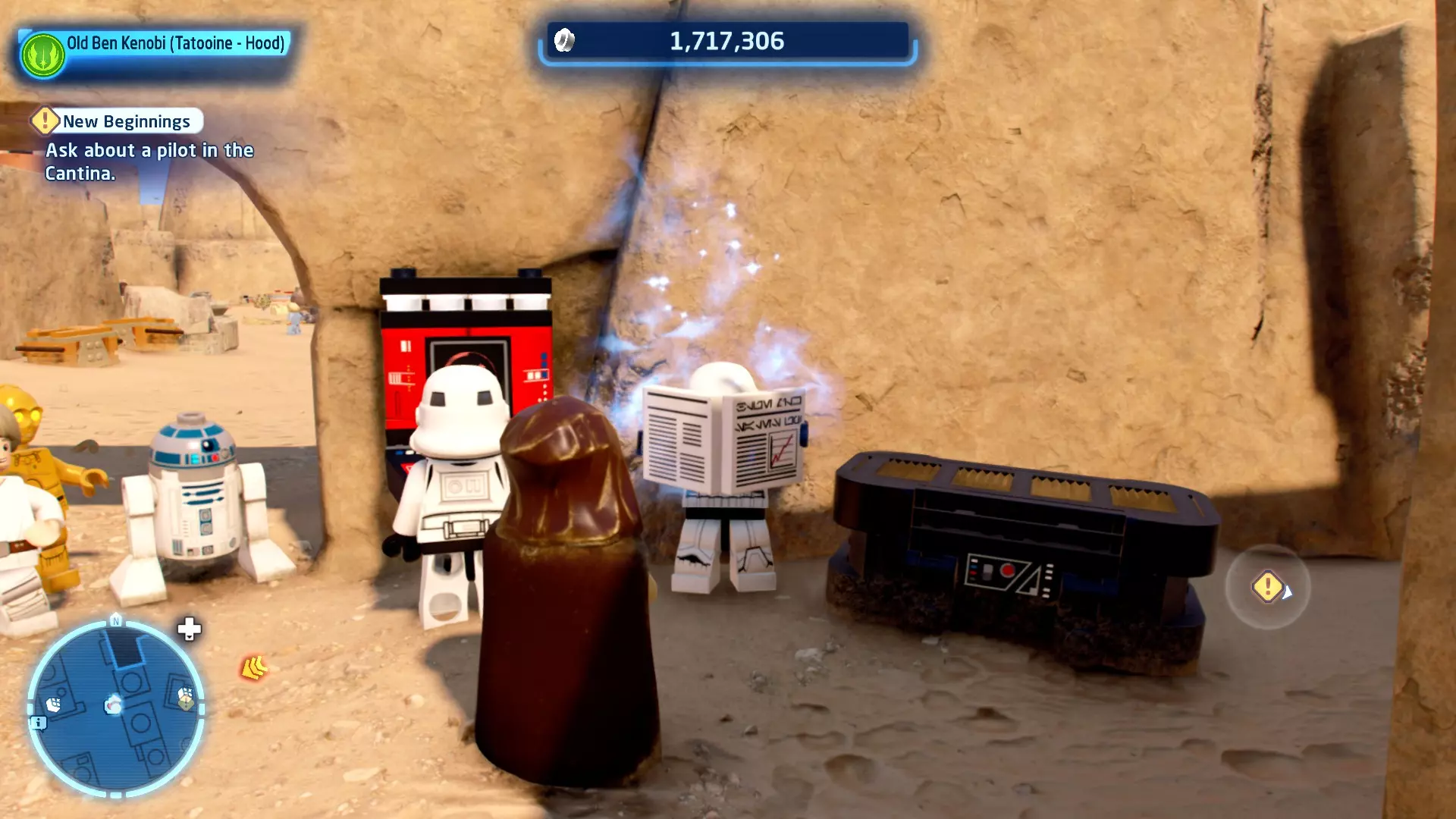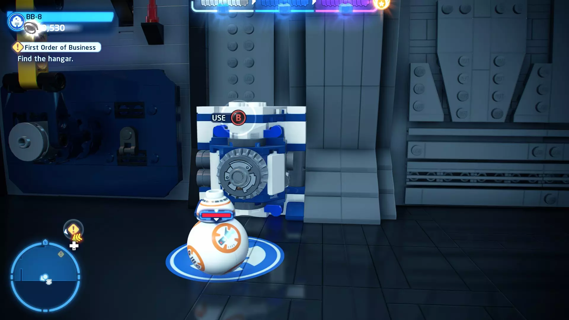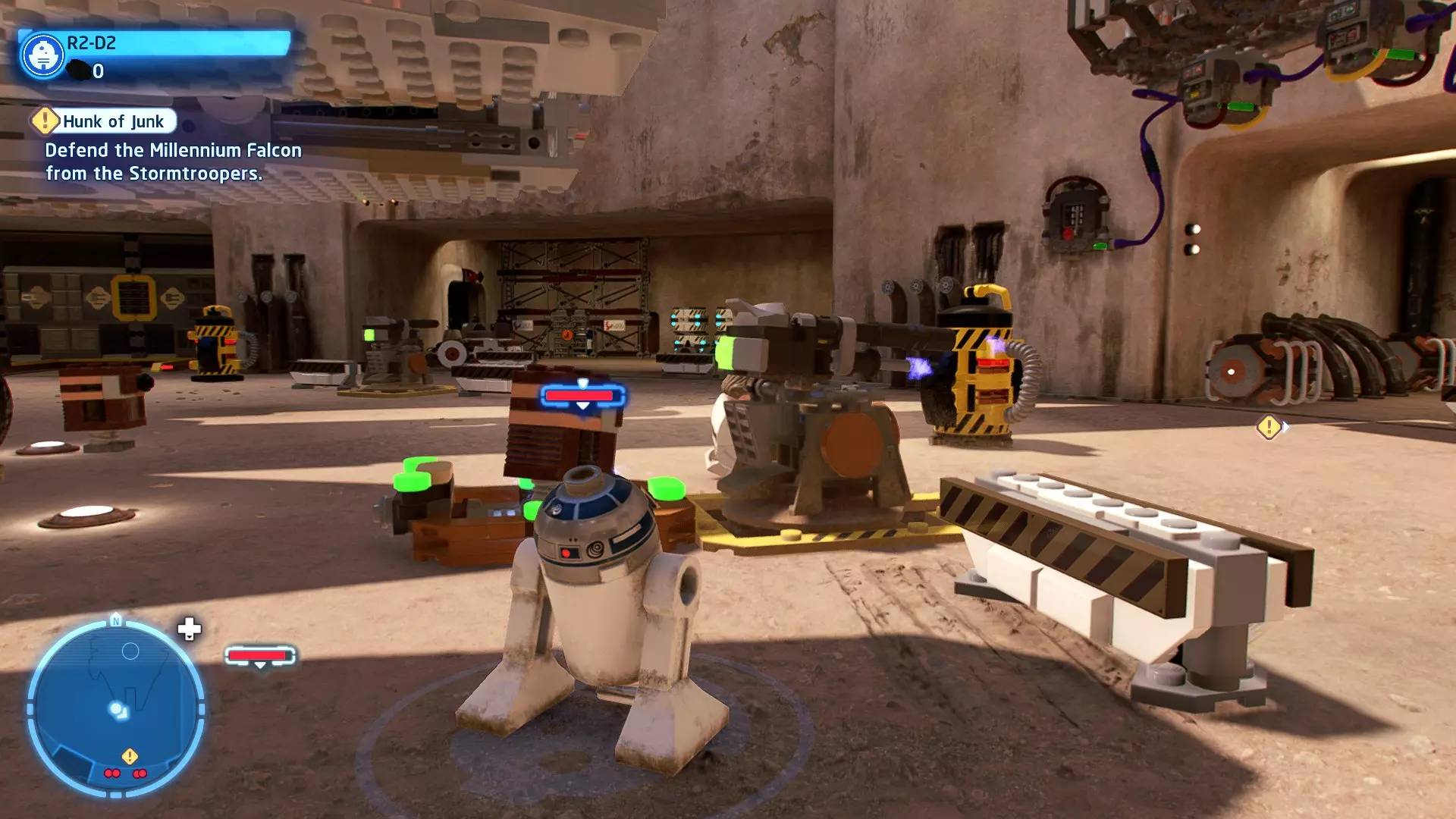 敌人:基吉米恶棍、第一秩序寒地突击士兵、第一秩序军官(基吉米) 初始角色:芬恩(基吉米外套)、蕾伊(基吉米外套)、C-3PO(基吉米外套) 真绝地分数:90,000 第一部分 - 基吉米城 当前目标:跟随波穿过基吉米的街道 跟随波沿街前行,你会遇到第一秩序的巡逻队。短暂过场后,波会着手开门。但电源已被切断,你需要想办法恢复电力。 幸运的是,在附近的小巷(UA-TT步行机所在的 ledge 下方)可以找到一个能量核心。拿起能量核心并放入插槽中打开门,即可继续前进。继续沿街走,你会遇到更多士兵。新目标:找到通过上锁大门的方法 你会遇到两名第一秩序士兵,波会指示你悄悄靠近其中一人并将其解决。走到一人身后,按照按钮提示将其解决(波会解决另一名士兵)。接下来你需要解决屋顶上的士兵。射击其中一名士兵将其解决(波会解决另一名),然后继续朝大门前进。 这扇大门也被锁住了,我们需要找到另一个能量核心来打开它。返回楼梯下方,摧毁发光的箱子以露出能量核心,然后使用原力将其从插槽中取出。拿起能量核心并带回楼梯上方,接着使用原力堆叠箱子,这样你就能跳上大门上方的 ledge。将能量核心放入插槽以打开大门,这样你就能继续前进。 新目标:跟随波伊穿过基吉米的街道 沿着街道继续前进,你会遭到一些基吉米恶棍的袭击! 新目标:抵御恶棍的攻击! 击败来袭的恶棍后,第一秩序巡逻队将会出现! 新目标:让第一秩序通过或与他们战斗! 随后会有一支第一秩序巡逻队经过该区域。正如你的任务目标所示,你可以选择让士兵通过,或者从藏身之处出来与他们战斗。一旦士兵离开,将会播放一段过场动画。 新目标:找到通过锁着的大门的方法 由佐丽带路,跟随她和波伊走上台阶,朝大门走去。佐丽会拿出一个能量核心,为大门供能。不幸的是,电源将会短路,导致大门无法打开。对大门使用原力,然后按方向键上打开大门,即可继续前进。 新任务目标:尽可能安静地抵达巴布·弗里克的工坊 巴布·弗里克的工坊位于庭院的另一边,有以下几种抵达方式: 1. 战斗 2. 潜行 3. 清理庭院 战斗:你可以直接穿过庭院,疯狂冲向巴布的工坊。虽然这会暴露你的行踪,但却是抵达工坊最简单的方法。如果被士兵发现,你需要先击败庭院内的所有敌人才能进入工坊。 潜行:虽然比其他方法更具挑战性,但也可以悄悄穿过庭院。沿着庭院外围移动,避开黄色圆圈(这些代表士兵的视野范围)。你可以使用潜行攻击来消灭遇到的任何士兵。 清理庭院:你也可以通过清理庭院内的士兵到达巴布的工坊。要做到这一点,你需要激活庭院北侧的反派终端。你可以通过给芬恩穿上伪装(使用本关卡早些时候士兵掉落的盔甲碎片),或者悄悄靠近正在使用面板的军官并对他使用“影响”心灵控制术来完成。 已解锁角色:C-3PO(基吉米外套)、C-3PO(红眼)、芬恩(基吉米外套)、波·达默龙(基吉米外套)、蕾伊(基吉米外套)、佐里·布利斯 C-3P-哦不!- 迷你套件 所需能力:拆解、爆破、原力、抓钩、网发射器 迷你套件1 - 夜晚发出声响的贡克机器人