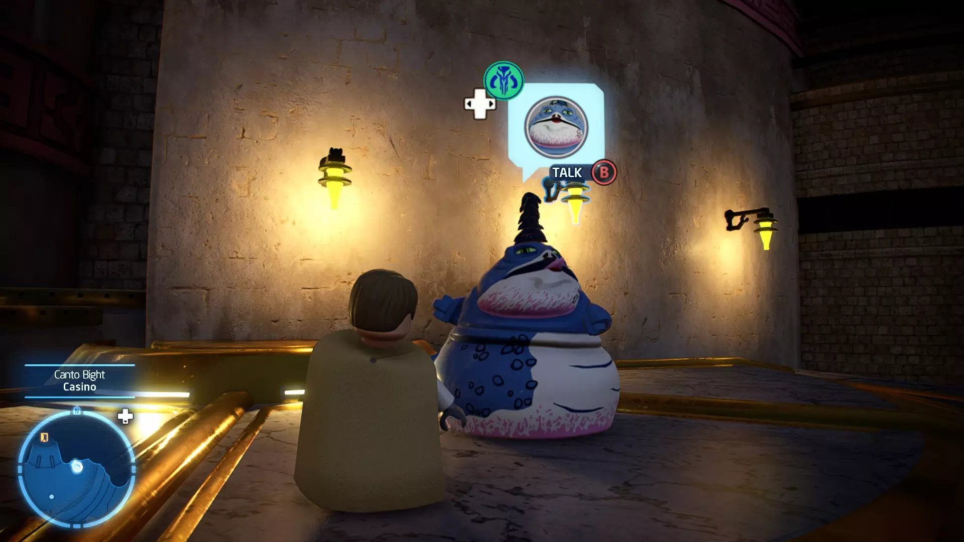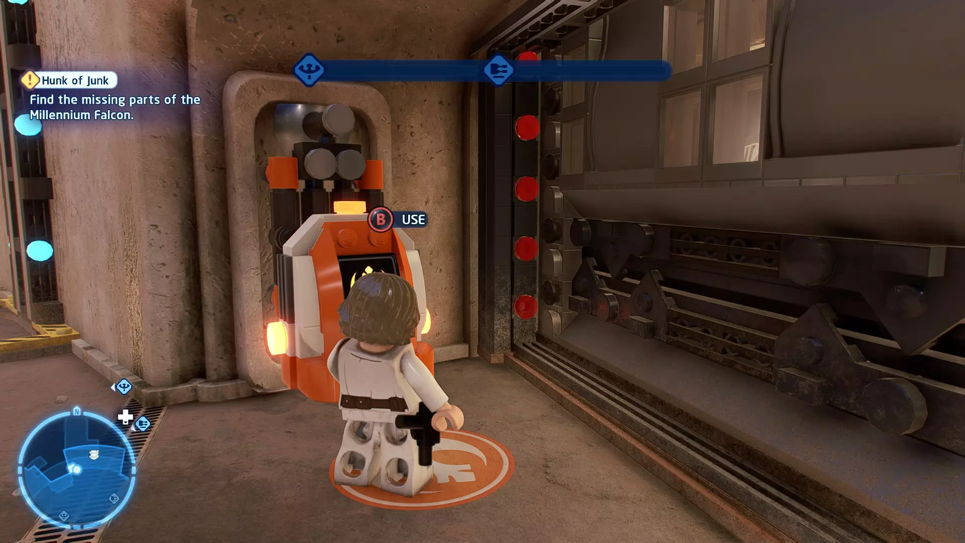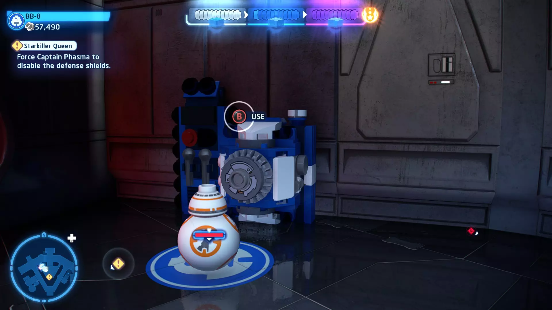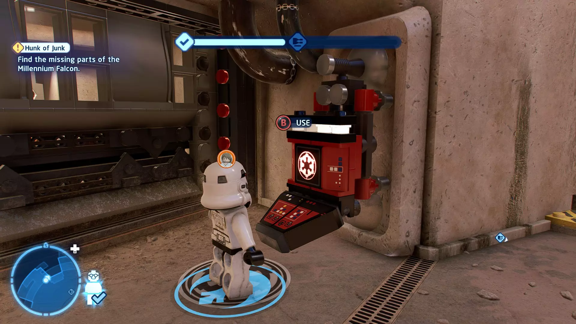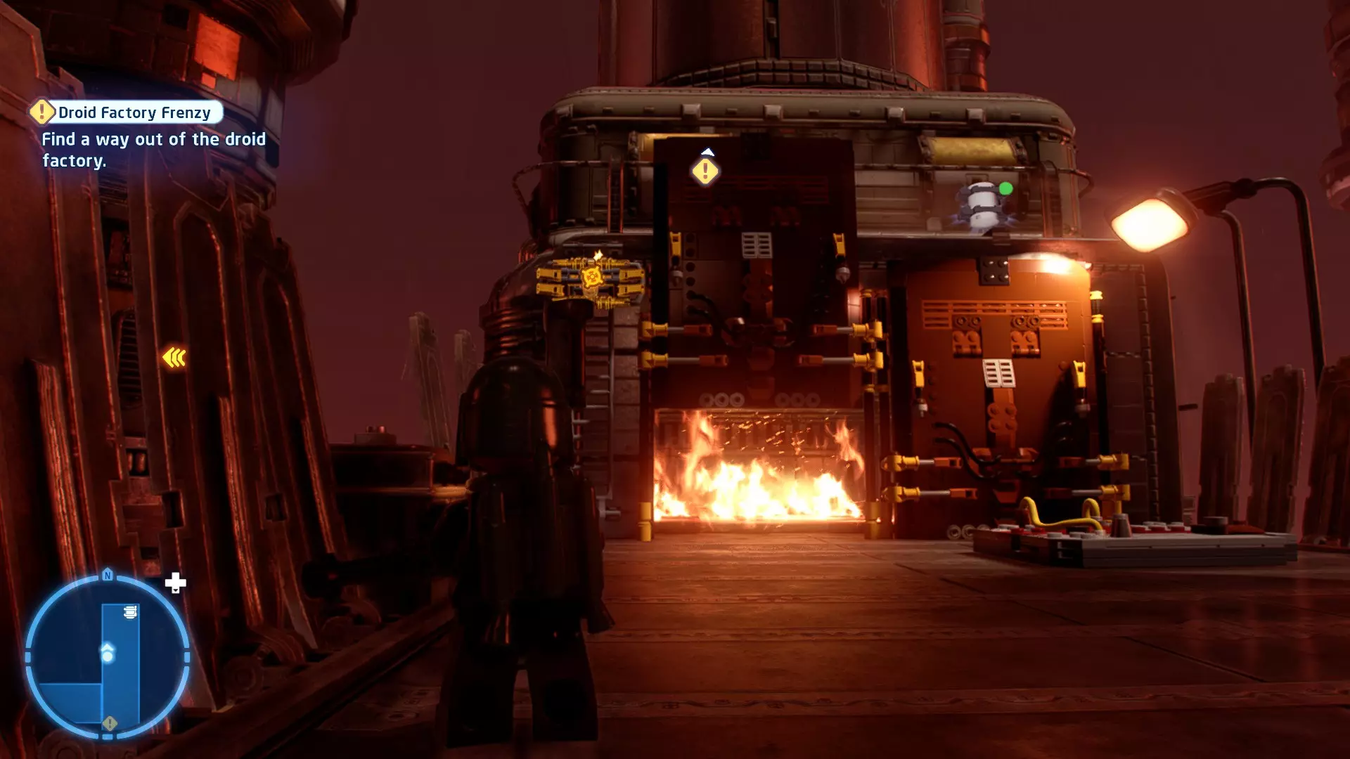 敌人:基吉米恶棍、第一秩序寒地突击士兵、第一秩序军官(基吉米) 初始角色:芬恩(基吉米外套)、蕾伊(基吉米外套)、C-3PO(基吉米外套) 真绝地分数:90,000 第一部分 - 基吉米城 当前目标:跟随波穿过基吉米的街道 跟随波沿街前行,你会遇到第一秩序的巡逻队。短暂过场后,波会着手开门。但电源已被切断,你需要想办法恢复电力。 幸运的是,在附近的小巷(UA-TT步行机所在的 ledge 下方)可以找到一个能量核心。拿起能量核心并放入插槽中打开门,即可继续前进。继续沿街走,你会遇到更多士兵。新目标:找到通过上锁大门的方法 你会遇到两名第一秩序士兵,波会指示你悄悄靠近其中一人并将其解决。走到一人身后,按照按钮提示将其解决(波会解决另一名士兵)。接下来你需要解决屋顶上的士兵。射击其中一名士兵将其解决(波会解决另一名),然后继续朝大门前进。 这扇大门也被锁住了,我们需要找到另一个能量核心来打开它。返回楼梯下方,摧毁发光的箱子以露出能量核心,然后使用原力将其从插槽中取出。拿起能量核心并带回楼梯上方,接着使用原力堆叠箱子,这样你就能跳上大门上方的 ledge。将能量核心放入插槽以打开大门,这样你就能继续前进。 新目标:跟随波伊穿过基吉米的街道 沿着街道继续前进,你会遭到一些基吉米恶棍的袭击! 新目标:抵御恶棍的攻击! 击败来袭的恶棍后,第一秩序巡逻队将会出现! 新目标:让第一秩序通过或与他们战斗! 随后会有一支第一秩序巡逻队经过该区域。正如你的任务目标所示,你可以选择让士兵通过,或者从藏身之处出来与他们战斗。一旦士兵离开,将会播放一段过场动画。 新目标:找到通过锁着的大门的方法 由佐丽带路,跟随她和波伊走上台阶,朝大门走去。佐丽会拿出一个能量核心,为大门供能。不幸的是,电源将会短路,导致大门无法打开。对大门使用原力,然后按方向键上打开大门,即可继续前进。 新任务目标:尽可能安静地抵达巴布·弗里克的工坊 巴布·弗里克的工坊位于庭院的另一边,有以下几种抵达方式: 1. 战斗 2. 潜行 3. 清理庭院 战斗:你可以直接穿过庭院,疯狂冲向巴布的工坊。虽然这会暴露你的行踪,但却是抵达工坊最简单的方法。如果被士兵发现,你需要先击败庭院内的所有敌人才能进入工坊。 潜行:虽然比其他方法更具挑战性,但也可以悄悄穿过庭院。沿着庭院外围移动,避开黄色圆圈(这些代表士兵的视野范围)。你可以使用潜行攻击来消灭遇到的任何士兵。 清理庭院:你也可以通过清理庭院内的士兵到达巴布的工坊。要做到这一点,你需要激活庭院北侧的反派终端。你可以通过给芬恩穿上伪装(使用本关卡早些时候士兵掉落的盔甲碎片),或者悄悄靠近正在使用面板的军官并对他使用“影响”心灵控制术来完成。 已解锁角色:C-3PO(基吉米外套)、C-3PO(红眼)、芬恩(基吉米外套)、波·达默龙(基吉米外套)、蕾伊(基吉米外套)、佐里·布利斯 C-3P-哦不!- 迷你套件 所需能力:拆解、爆破、原力、抓钩、网发射器 迷你套件1 - 夜晚发出声响的贡克机器人