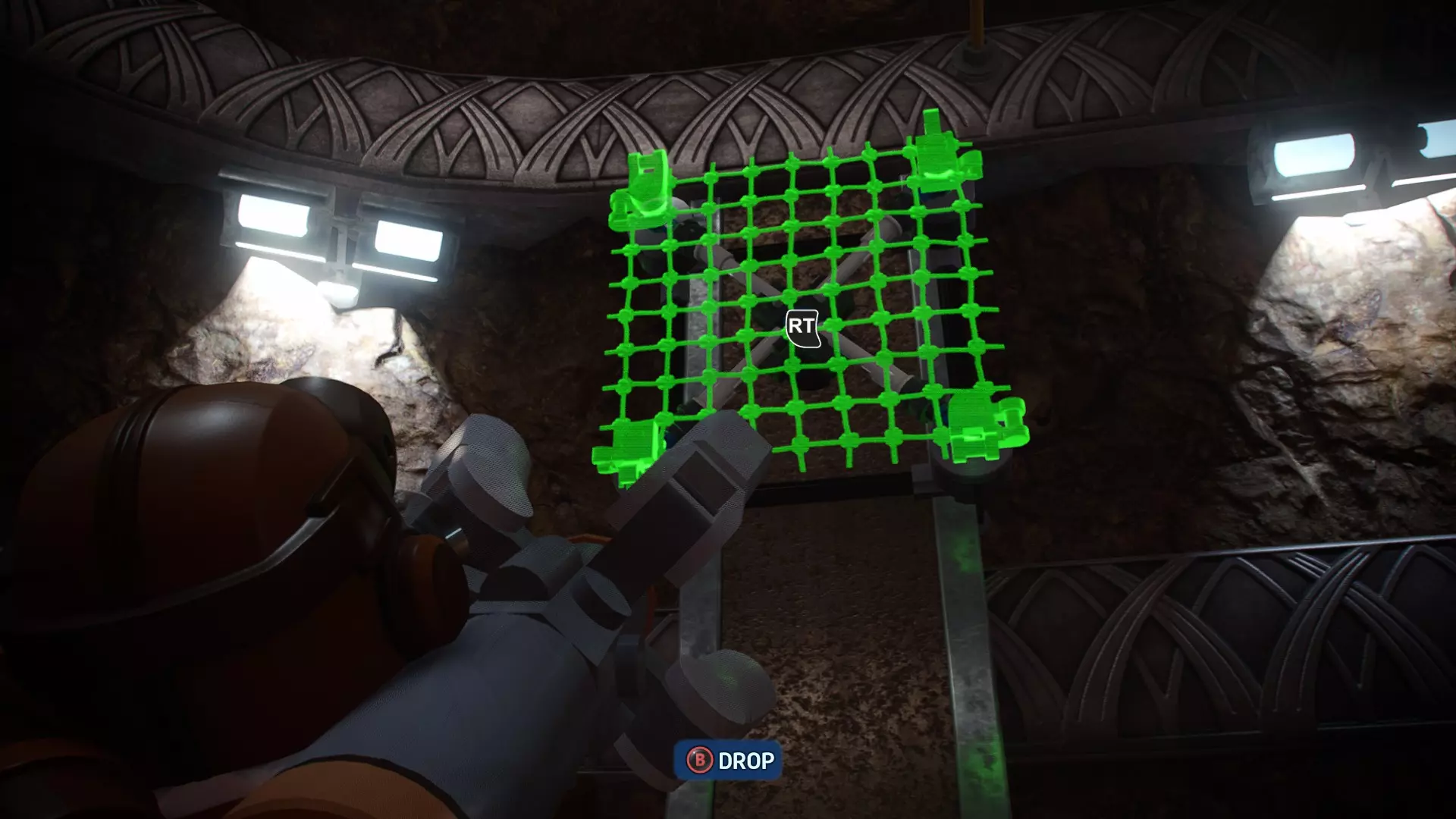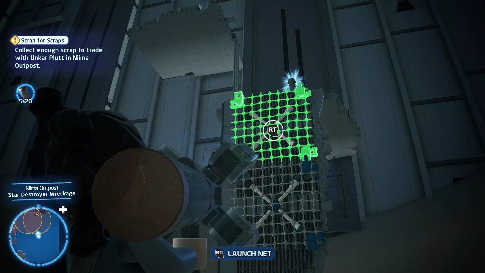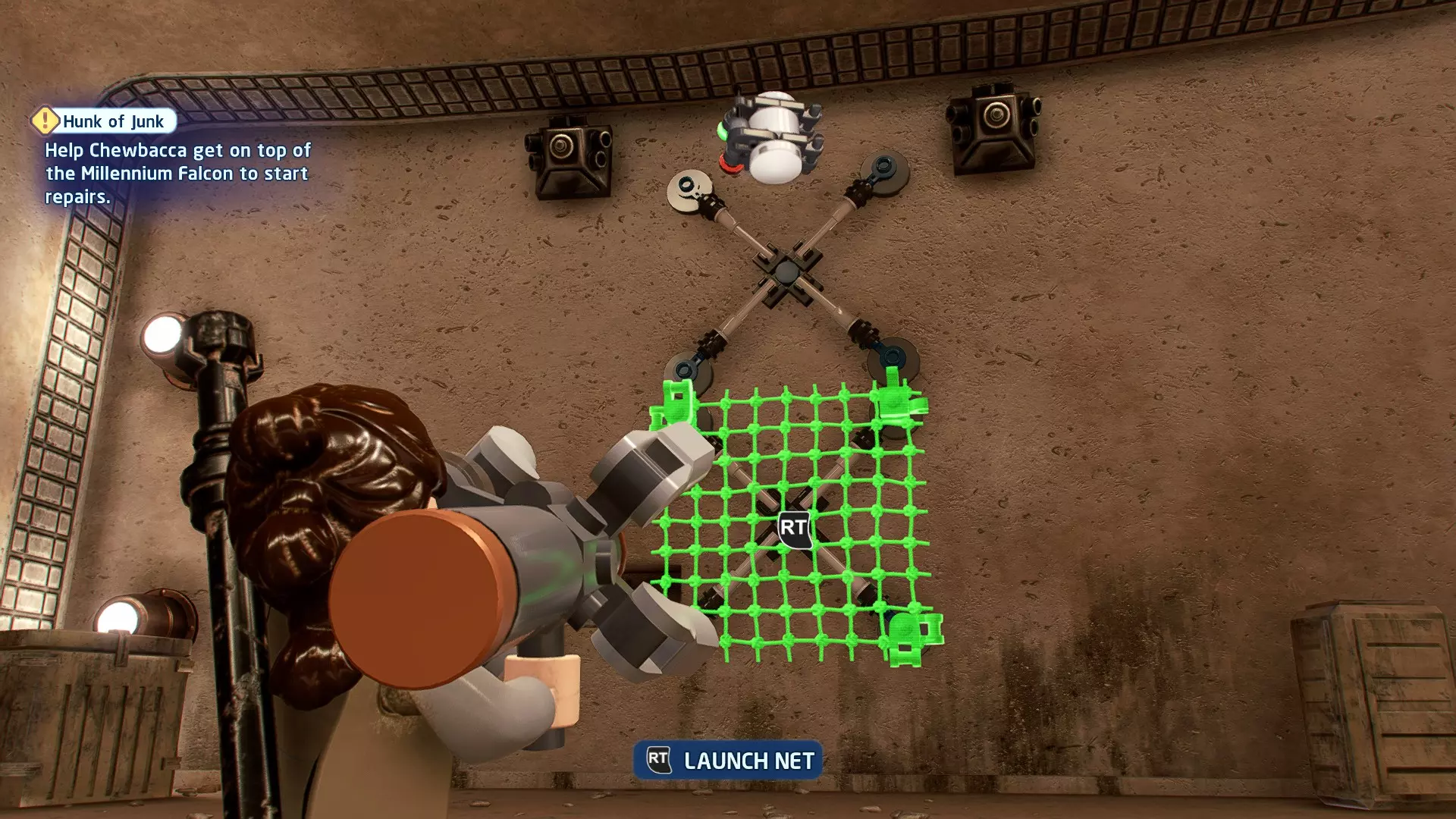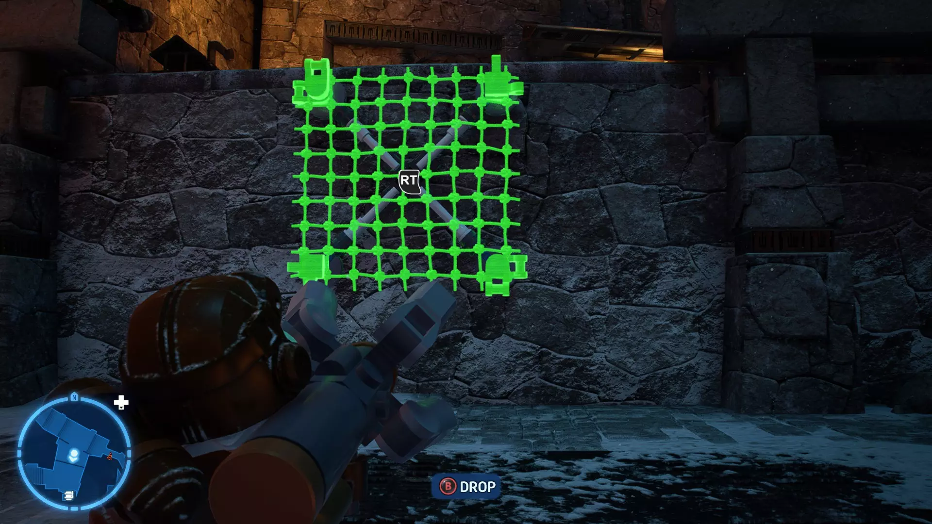 打开第一道门后,前往附近的小巷(UA-TT曾在此看守),你会发现一个网的插槽。向插槽发射一张网,这样你就能爬上上面的 ledge(平台)。