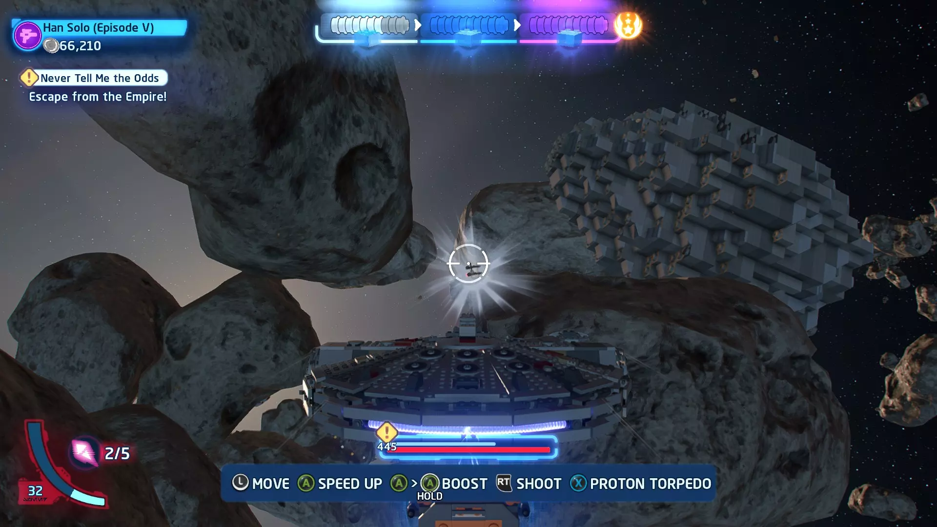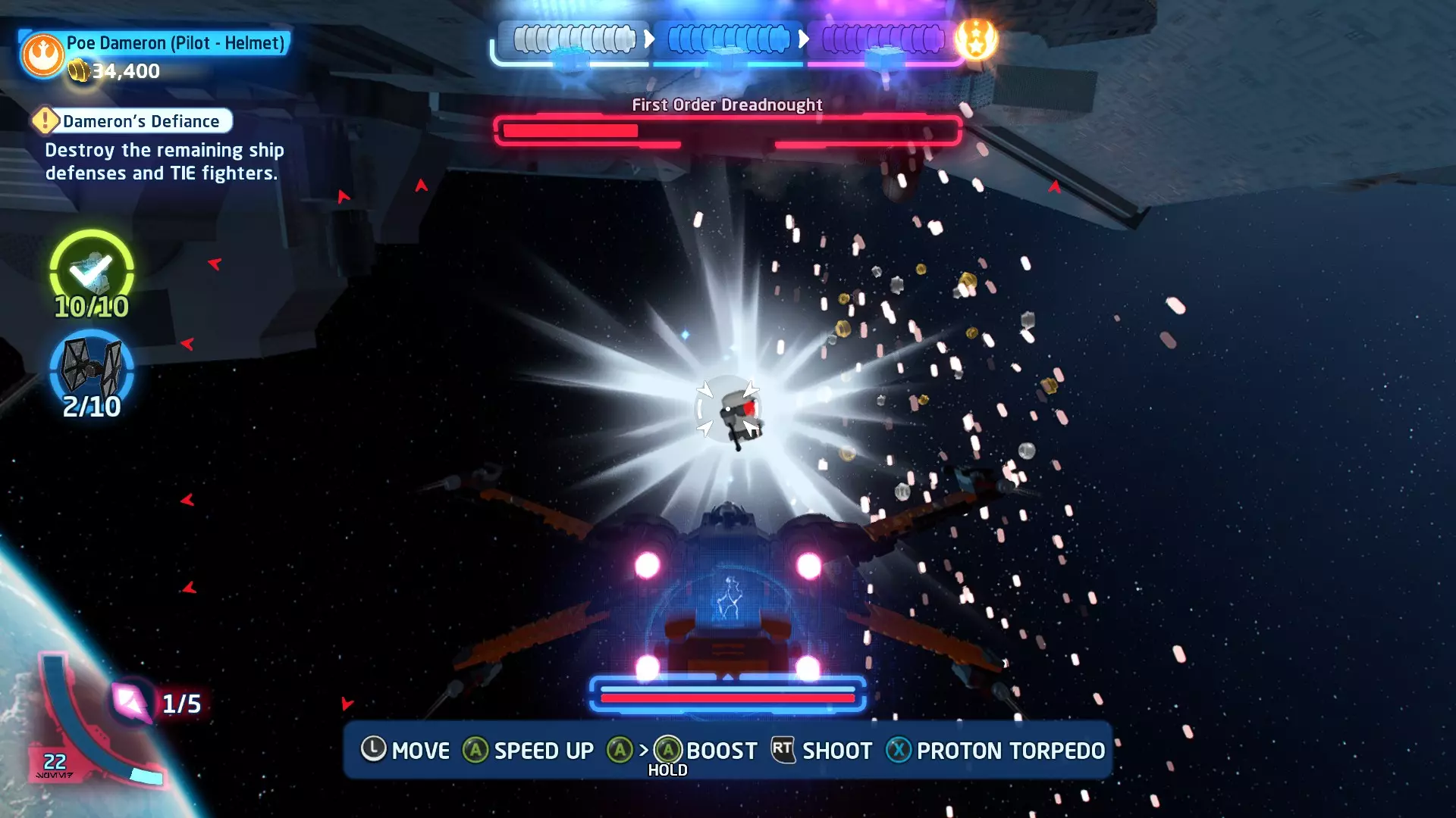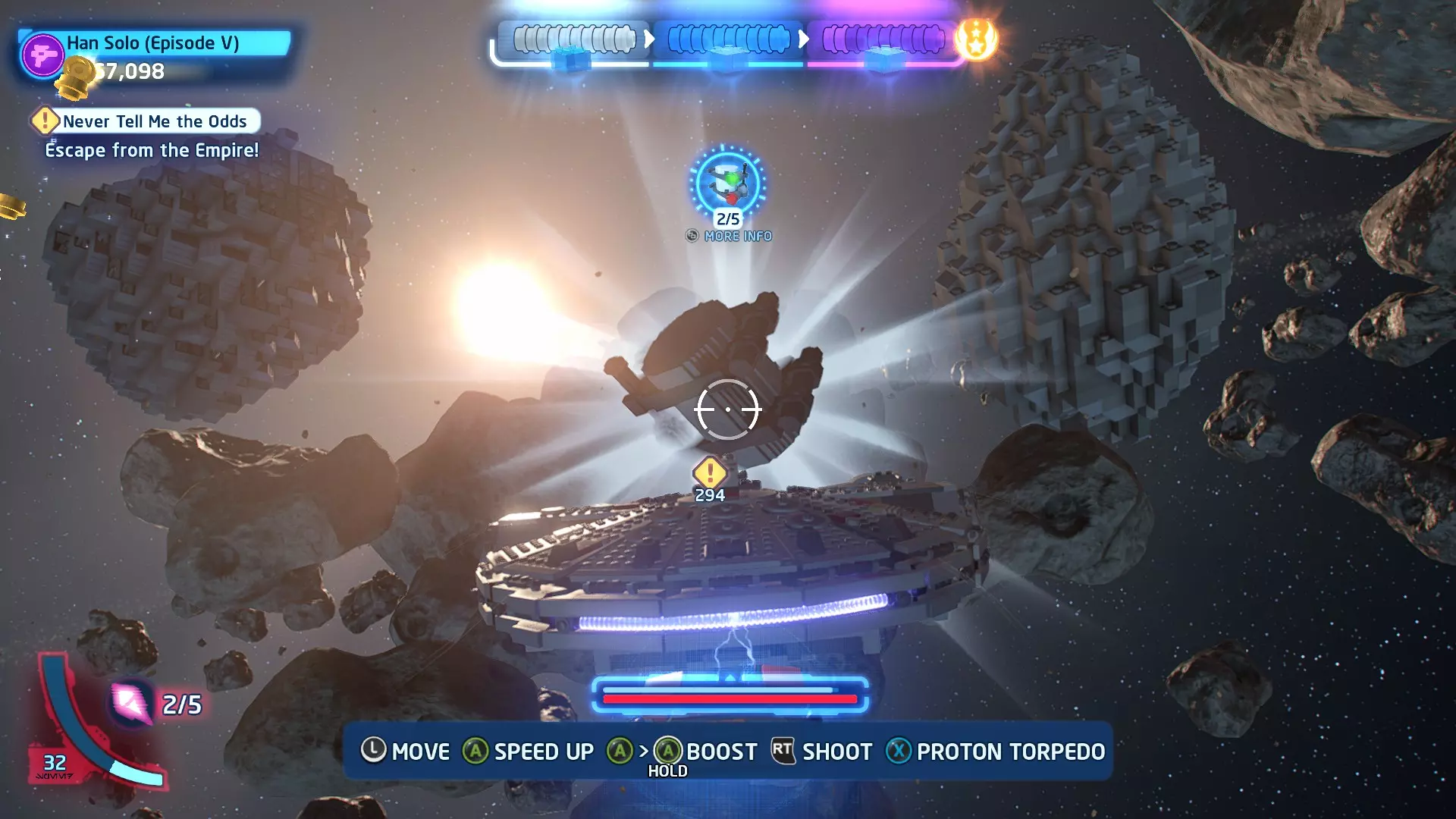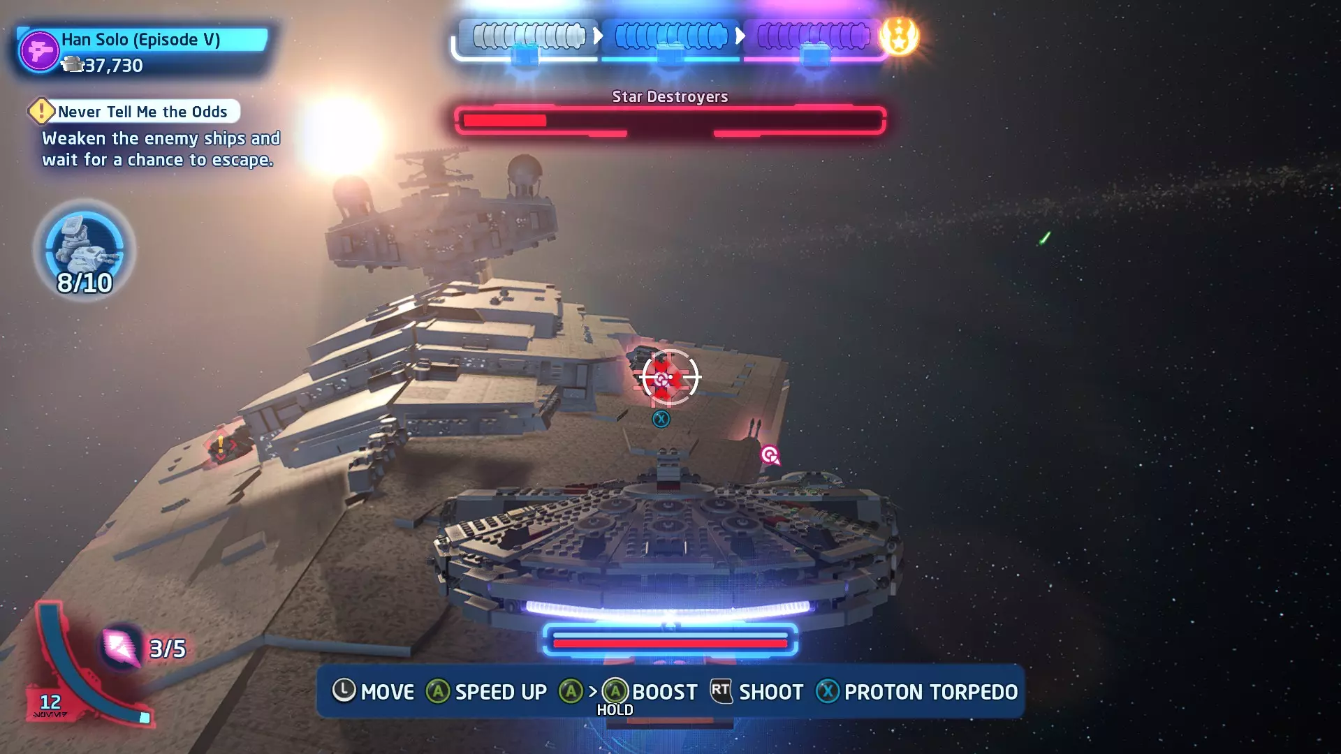 击败TIE战斗机获取质子鱼雷。使用它们摧毁3架TIE战斗机以完成此挑战。 挑战3 - 波式飞行 详情:及时启动超光速引擎完成所有光速跳跃