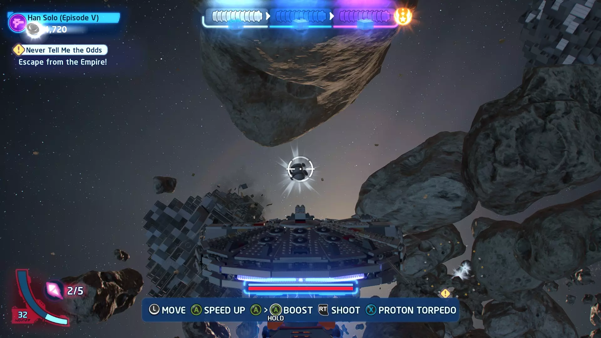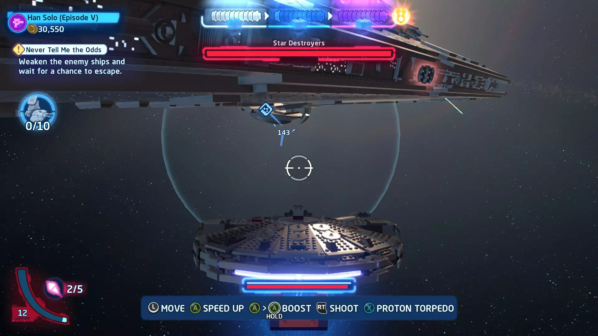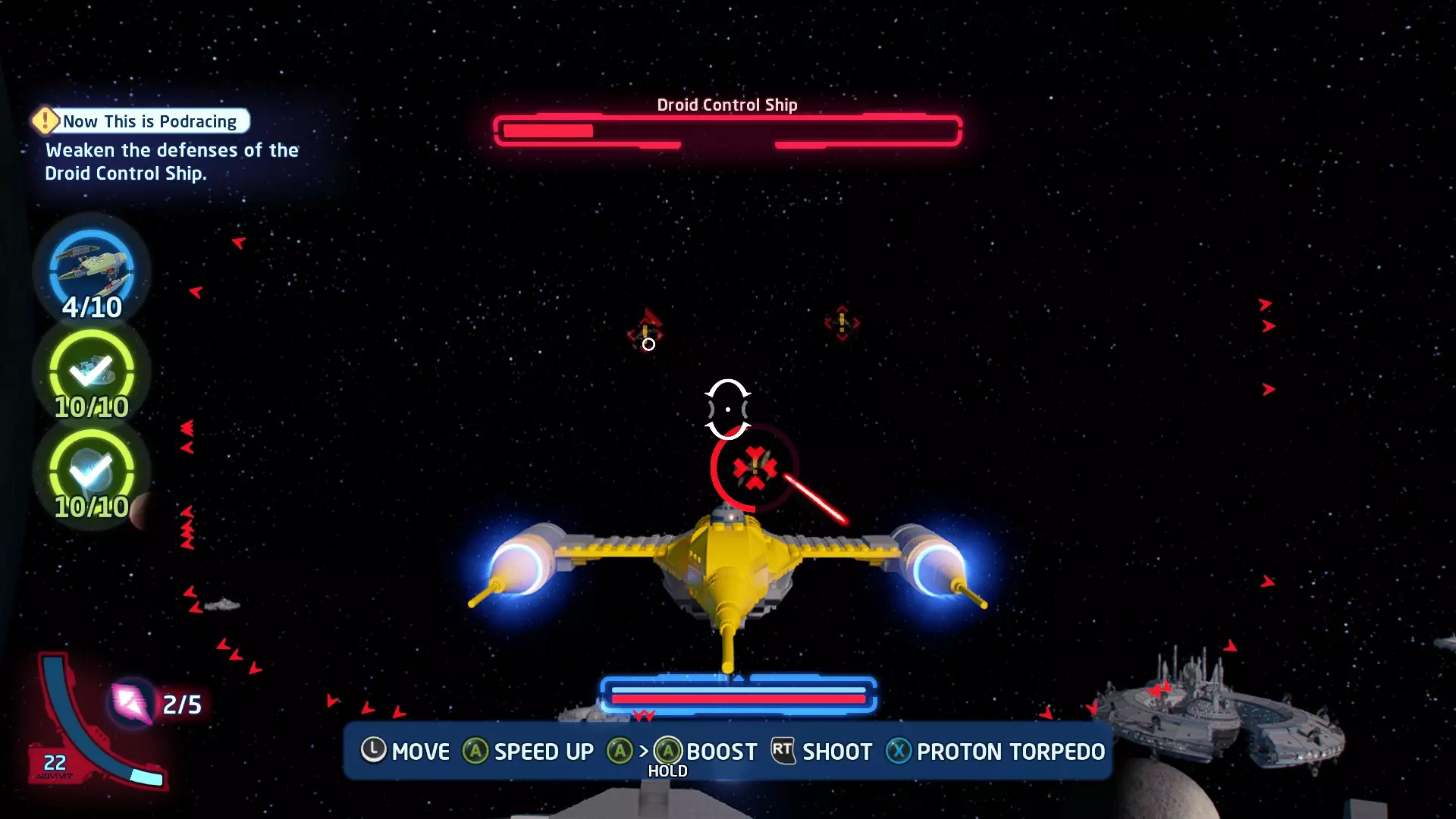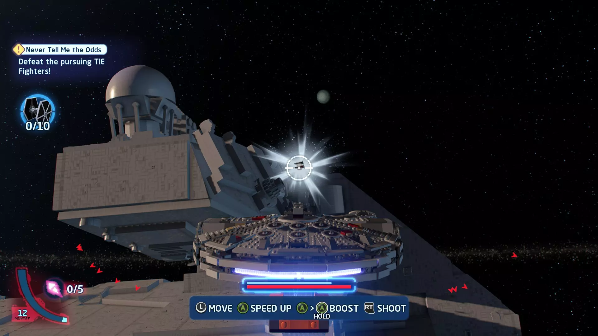 击败TIE战斗机获取质子鱼雷。使用它们摧毁3架TIE战斗机以完成此挑战。 挑战3 - 波式飞行 详情:及时启动超光速引擎完成所有光速跳跃