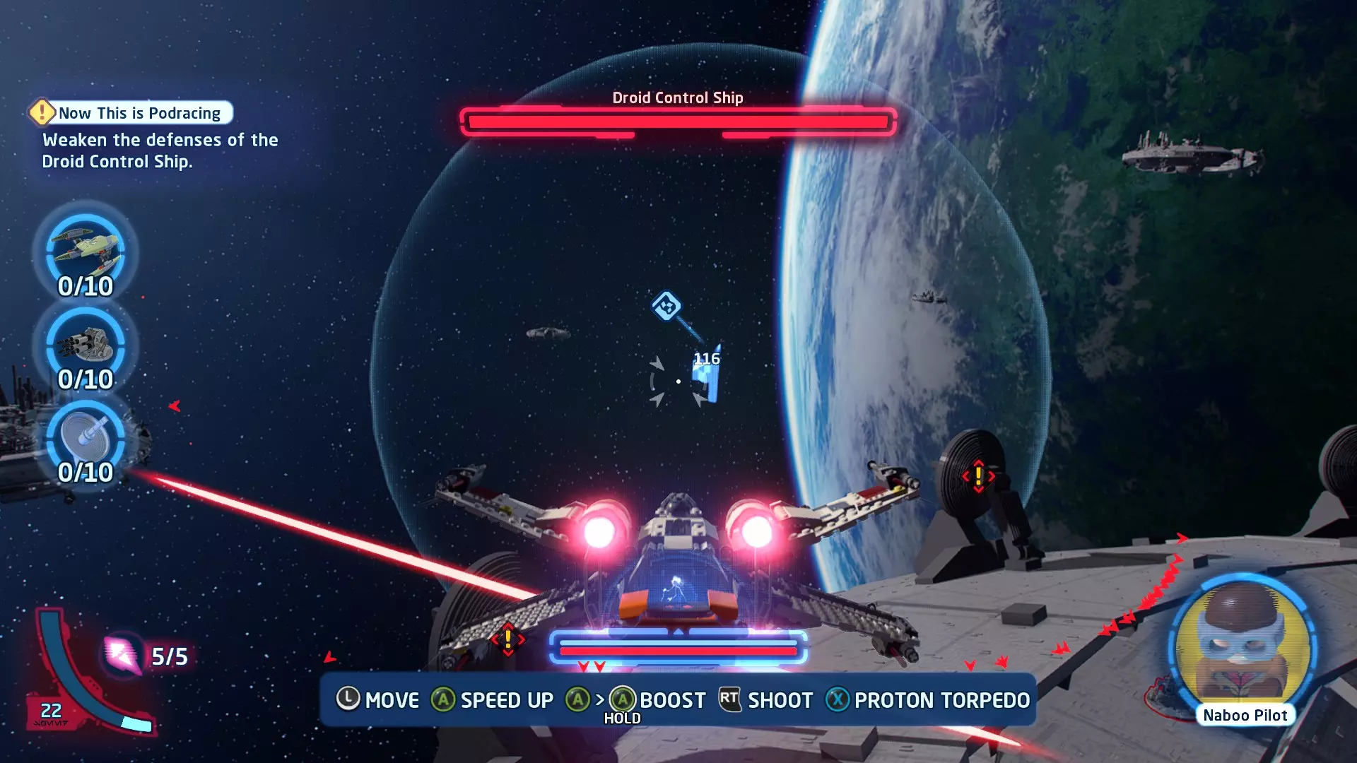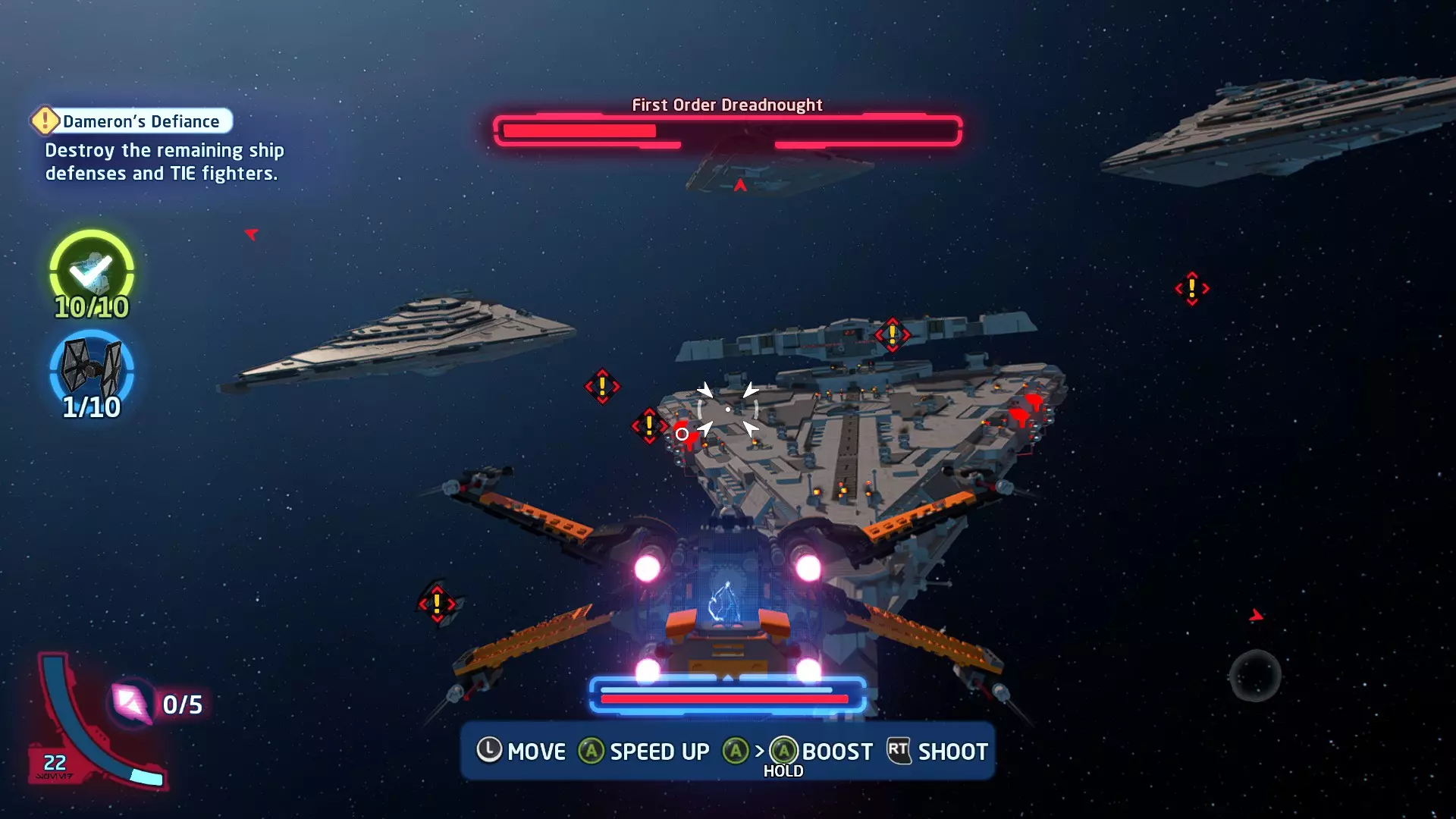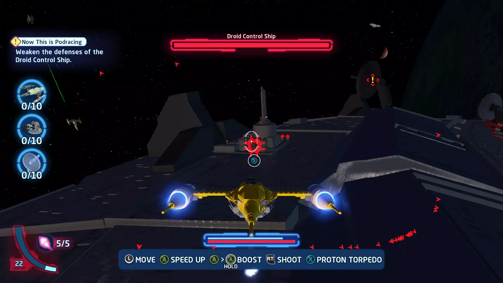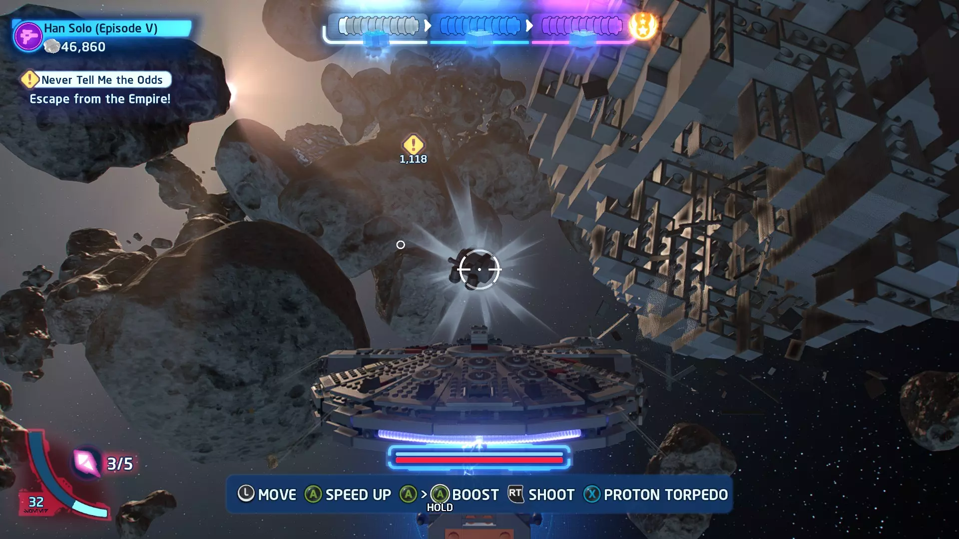 击败TIE战斗机获取质子鱼雷。使用它们摧毁3架TIE战斗机以完成此挑战。 挑战3 - 波式飞行 详情:及时启动超光速引擎完成所有光速跳跃