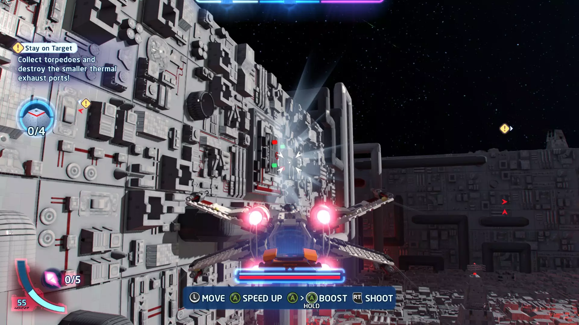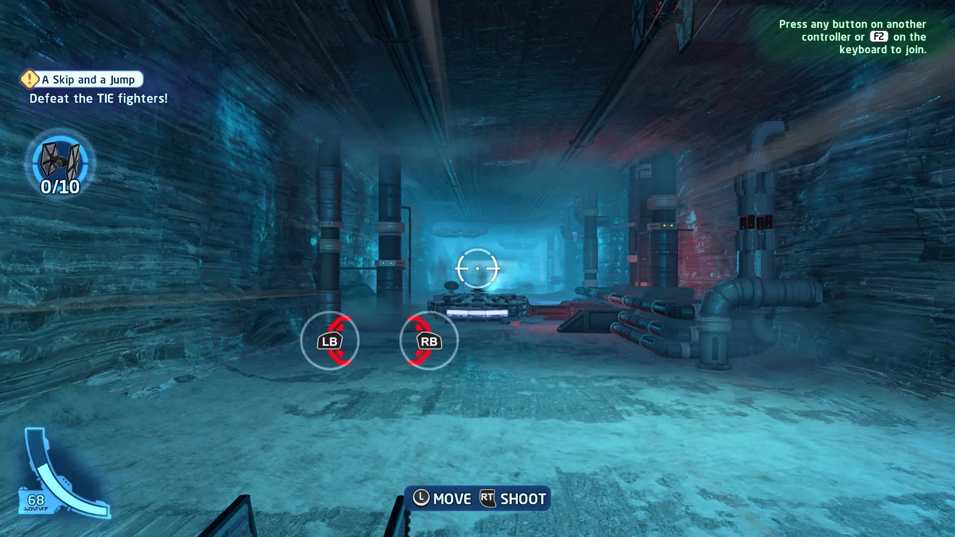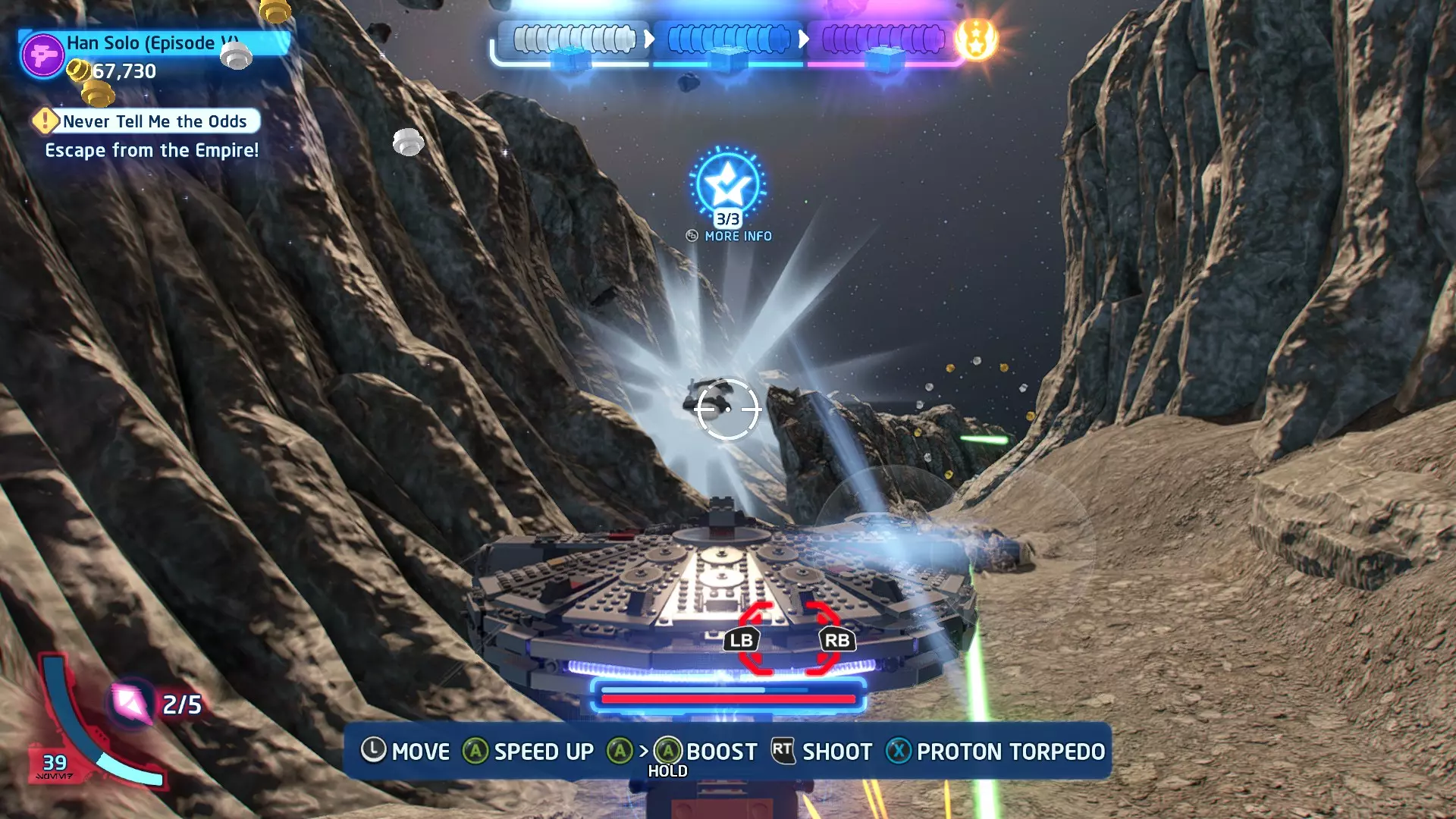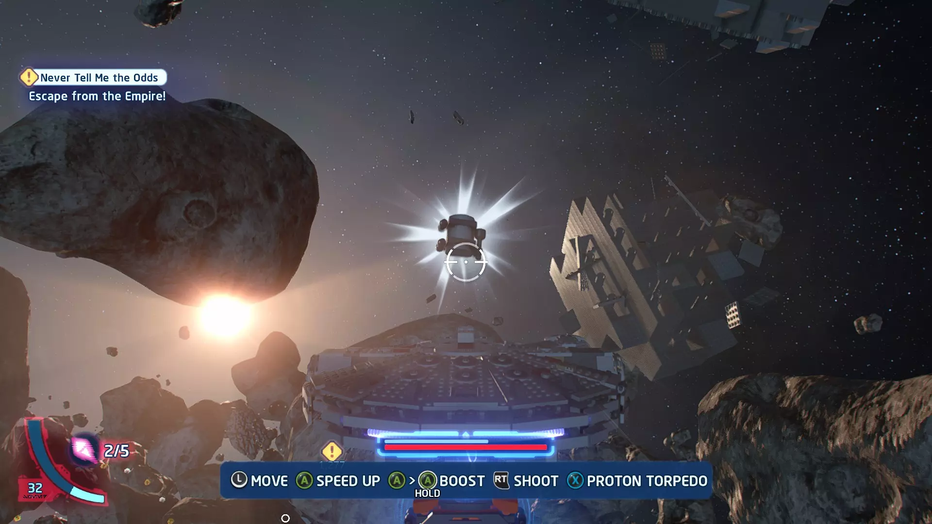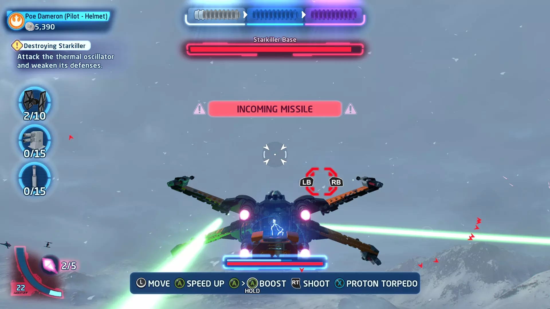 在冰隧道飞行时,TIE战斗机将会尝试锁定你。跟随按钮提示(按下LB或RB)来躲避锁定。连续成功3次即可完成此挑战。 挑战2 - 爆炸来袭! 详情:使用质子鱼雷或火箭消灭3个敌人