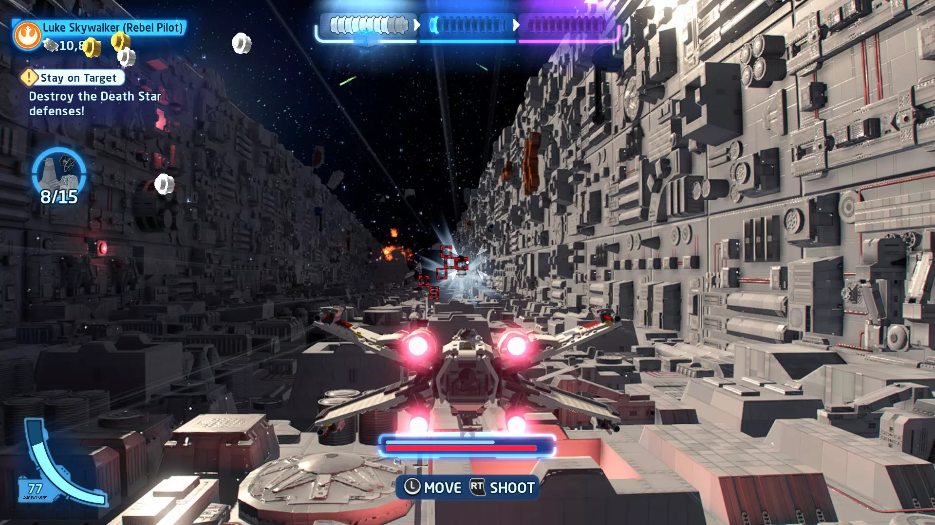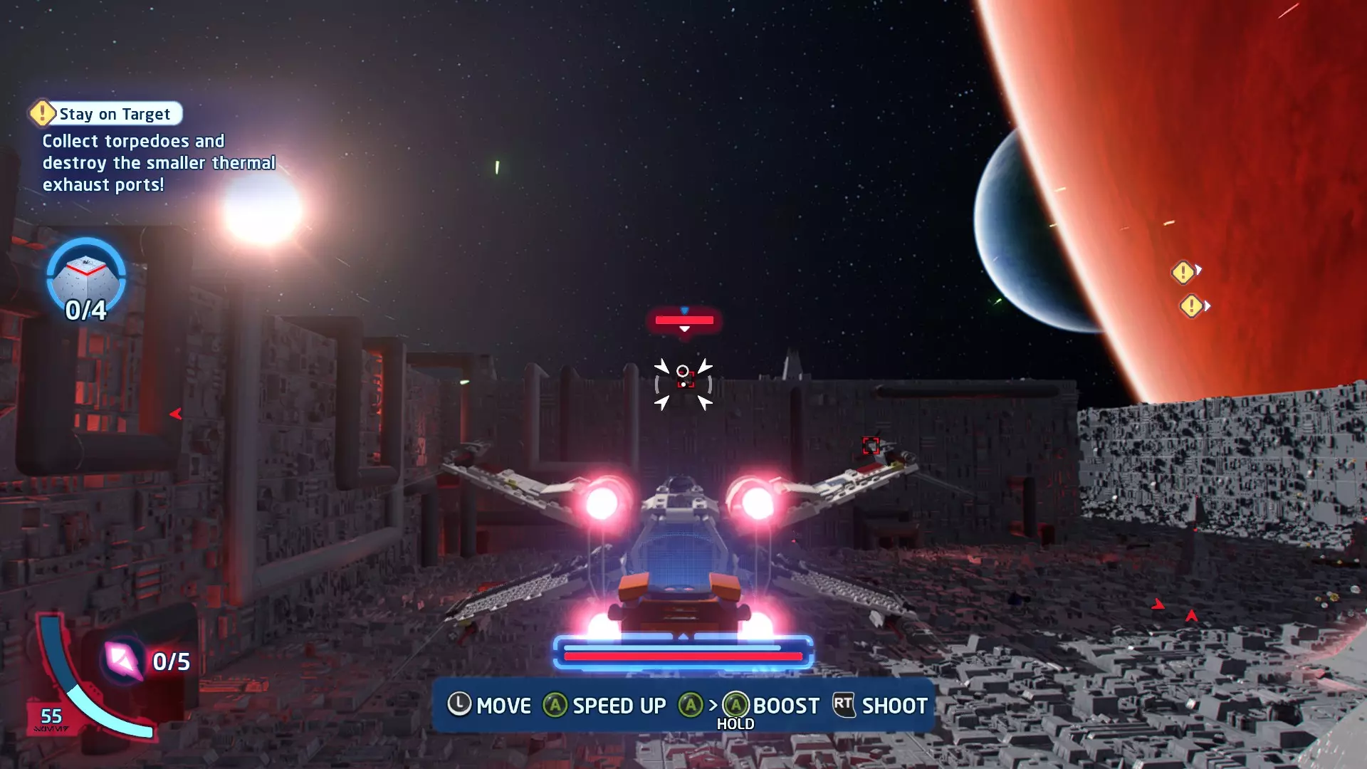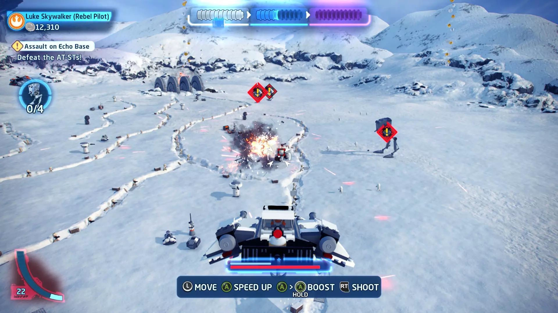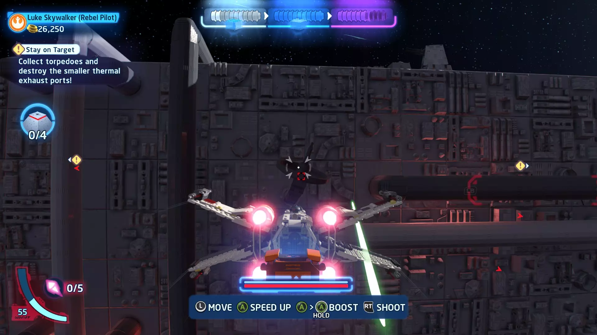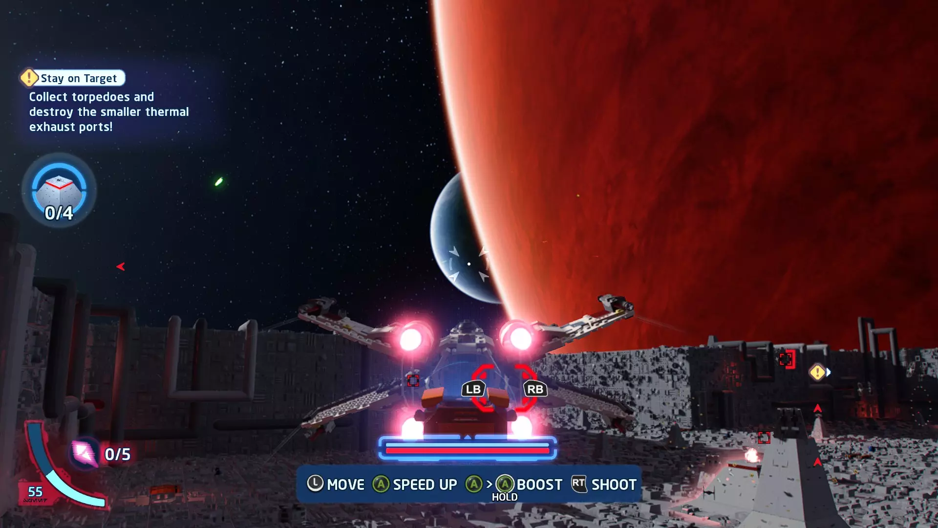 在冰隧道飞行时,TIE战斗机将会尝试锁定你。跟随按钮提示(按下LB或RB)来躲避锁定。连续成功3次即可完成此挑战。 挑战2 - 爆炸来袭! 详情:使用质子鱼雷或火箭消灭3个敌人