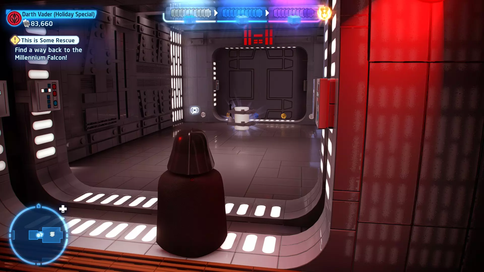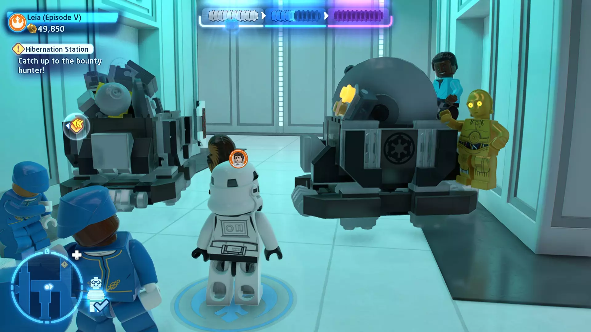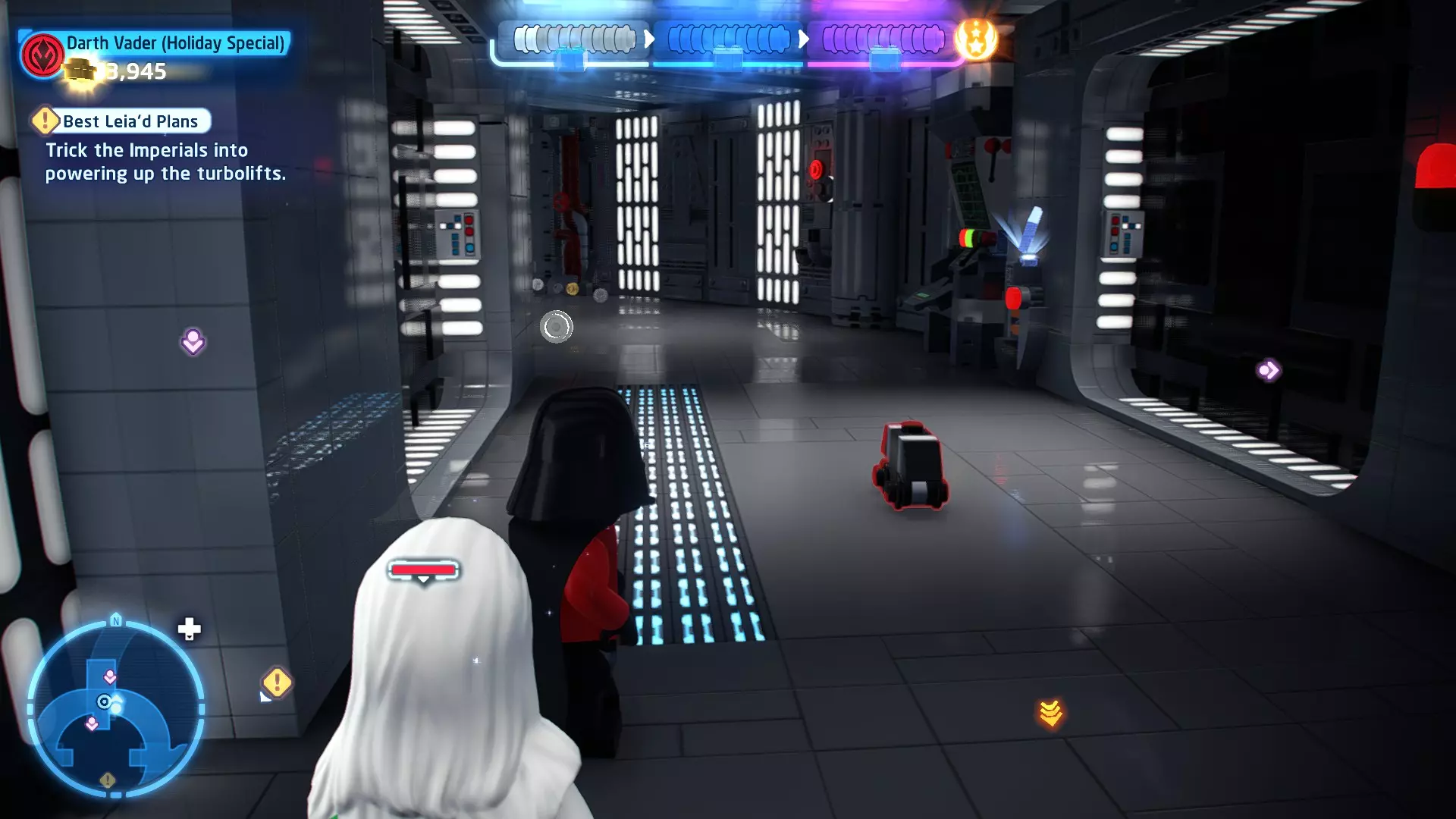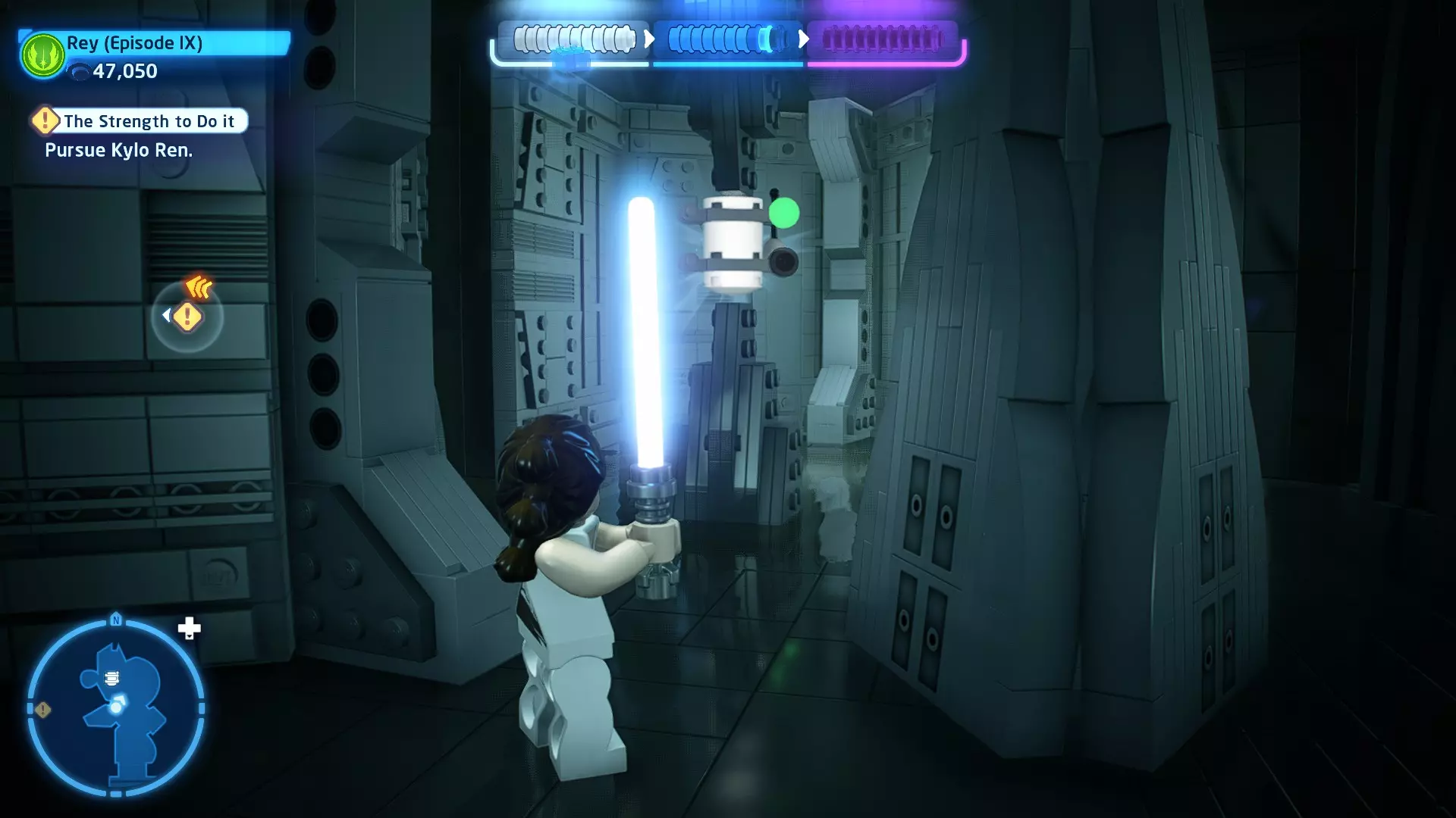 要收集它,需将自己拆解为礼仪机器人,然后切换到你的伙伴。使用原力将机器人抬进窗户,这样你就能拿到这个迷你套件。 微型飞船:TIE匕首(微型) C-3P-哦不!- 关卡挑战 所需能力:精准射击、反派 挑战1 - 要像蕾伊一样安静 详情:在不被发现的情况下完成关卡
