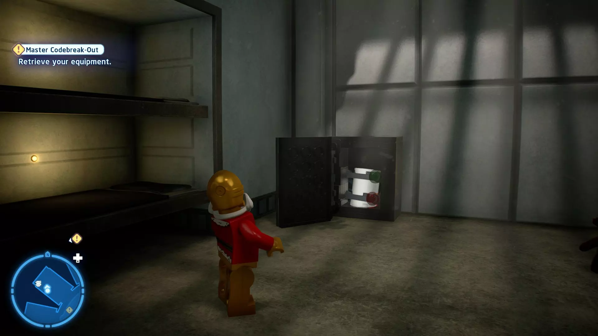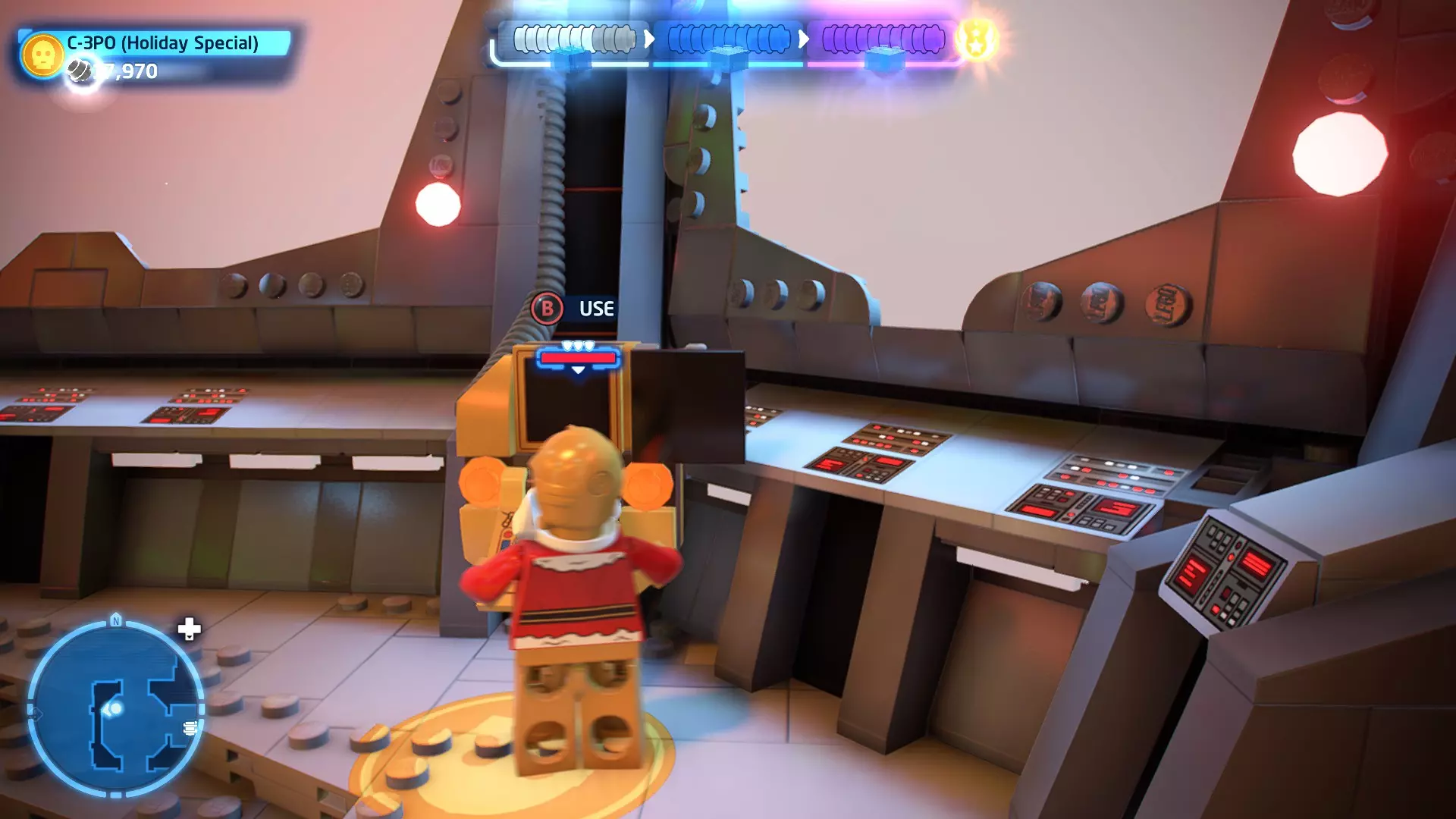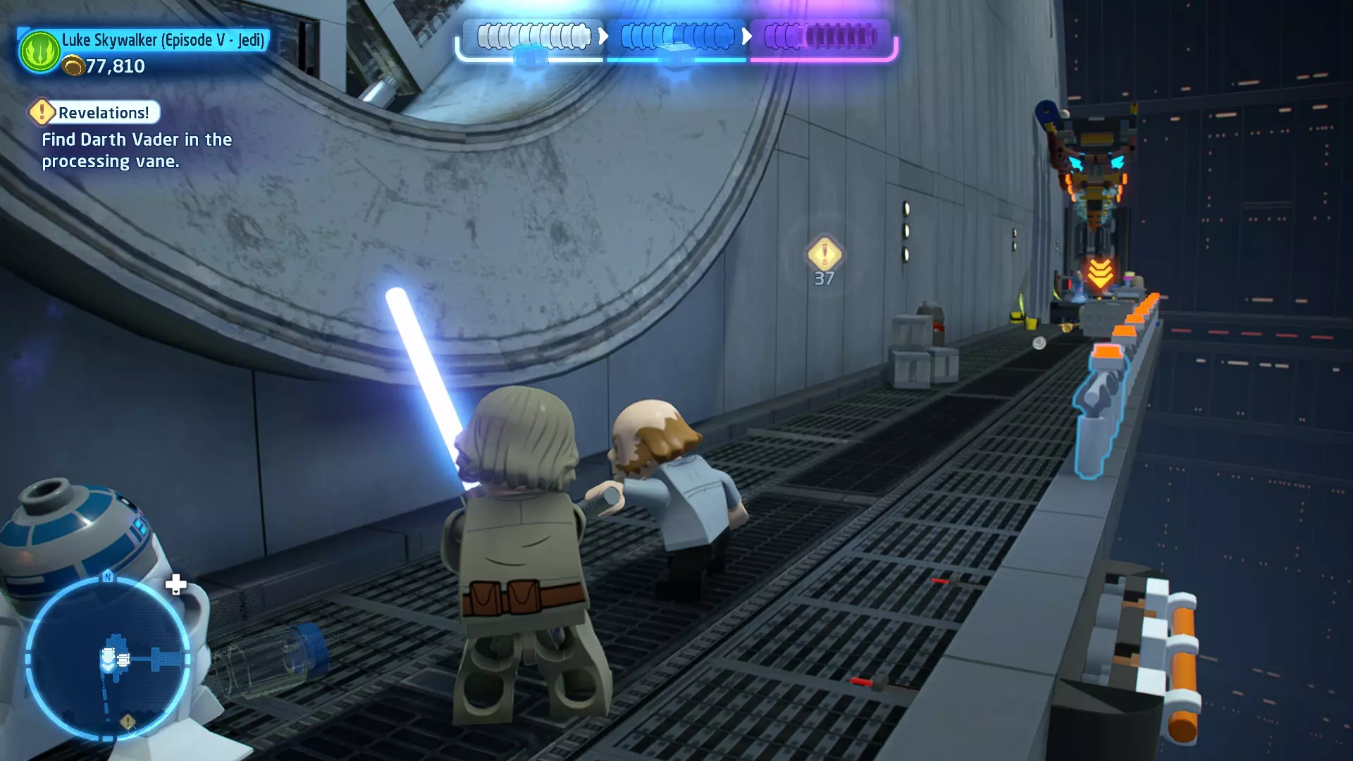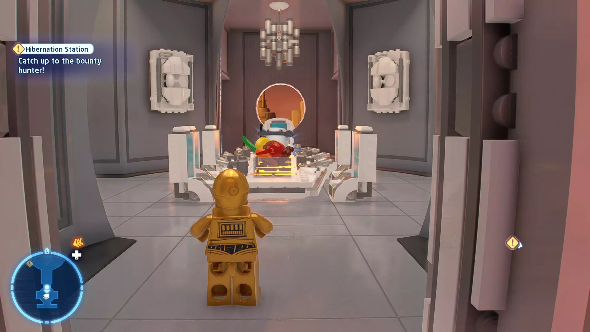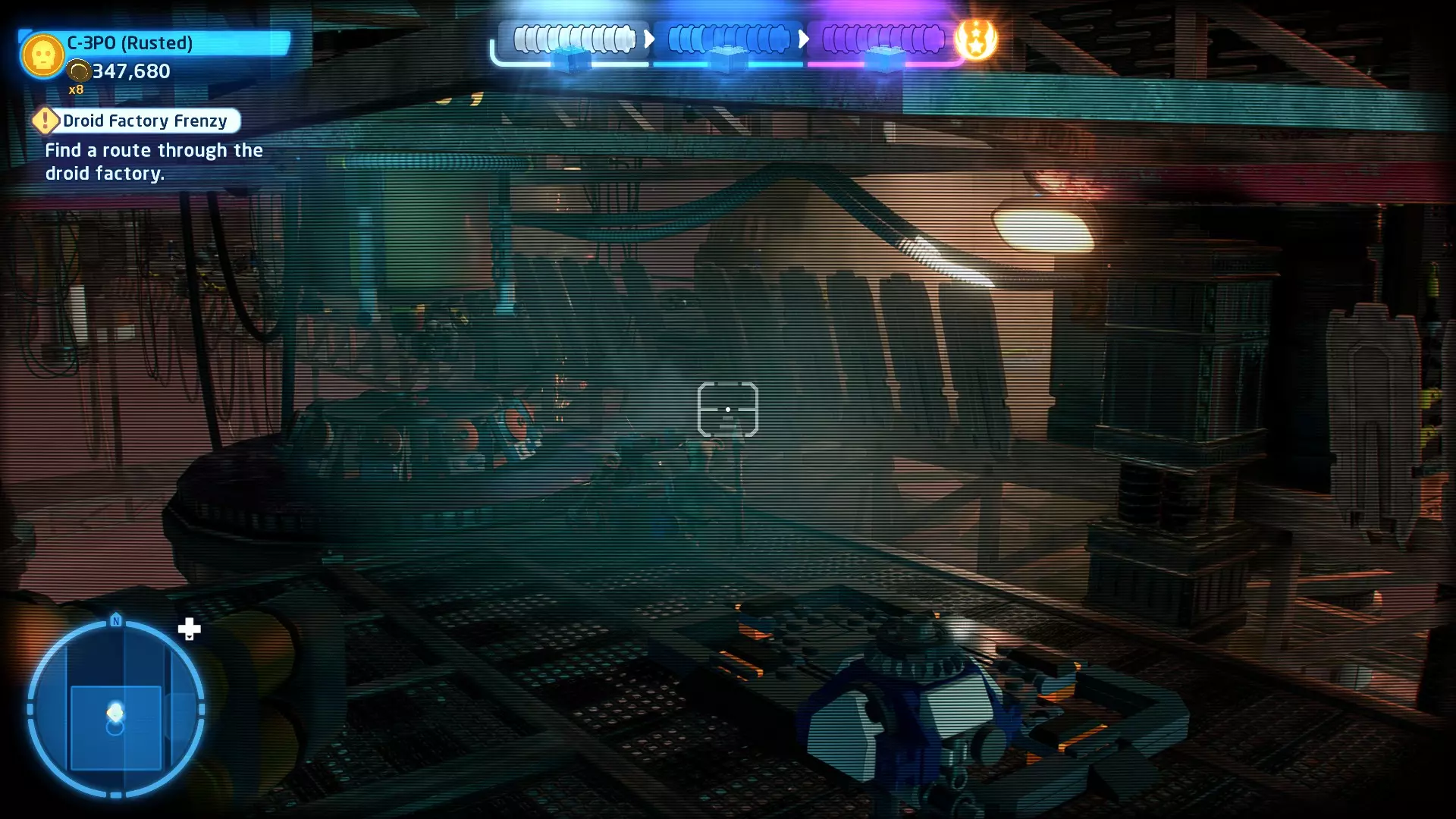 要收集它,需将自己拆解为礼仪机器人,然后切换到你的伙伴。使用原力将机器人抬进窗户,这样你就能拿到这个迷你套件。 微型飞船:TIE匕首(微型) C-3P-哦不!- 关卡挑战 所需能力:精准射击、反派 挑战1 - 要像蕾伊一样安静 详情:在不被发现的情况下完成关卡