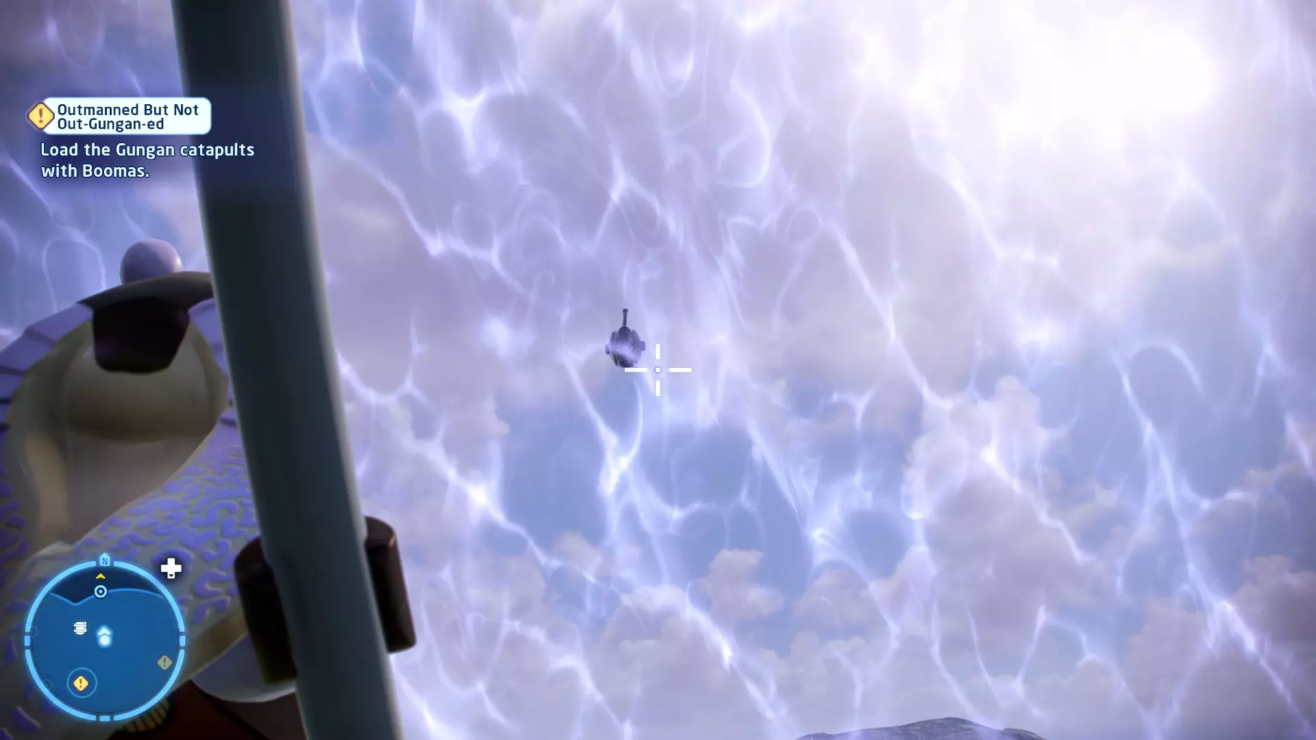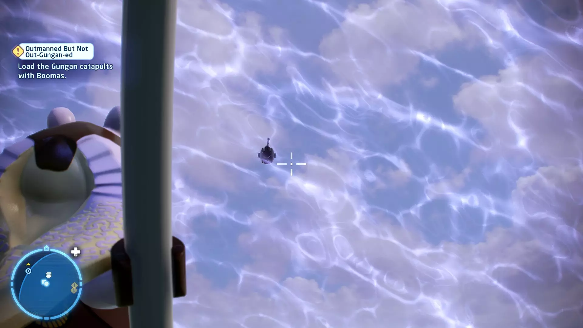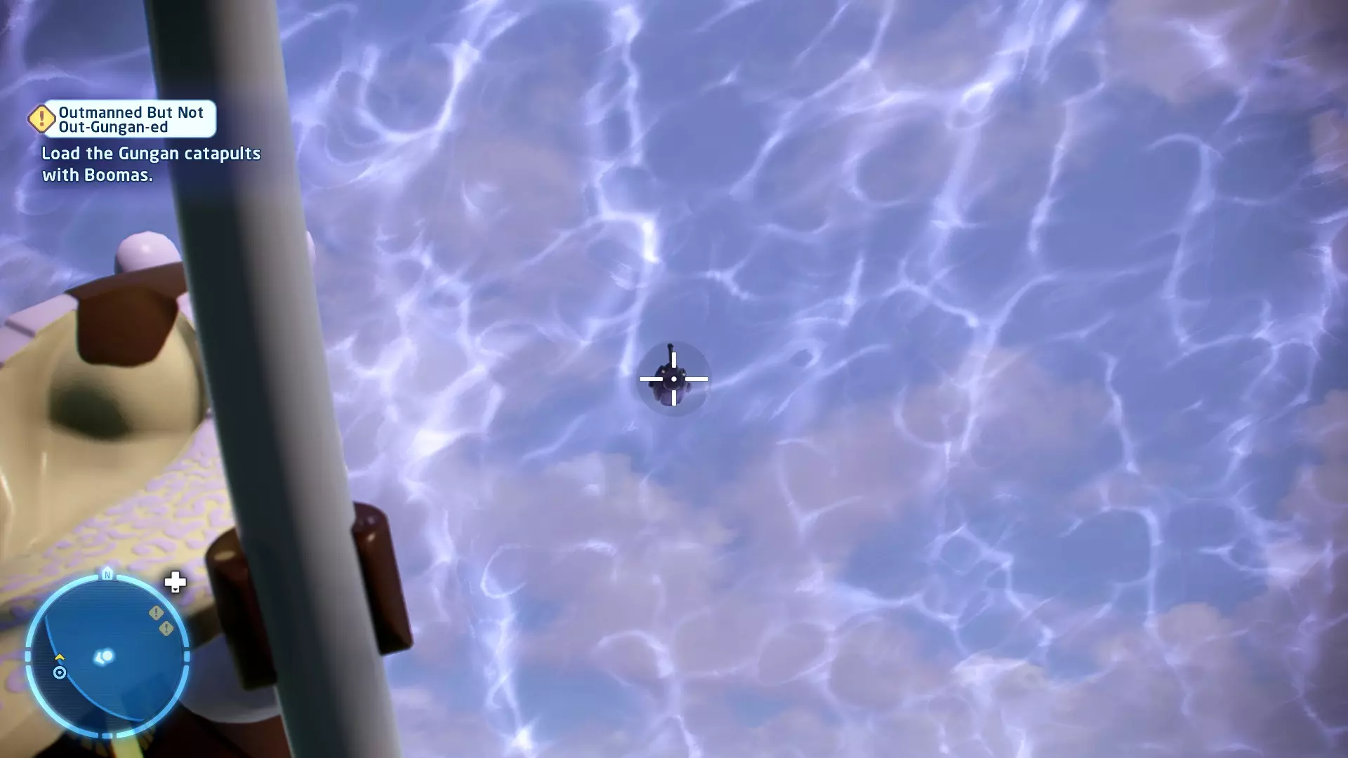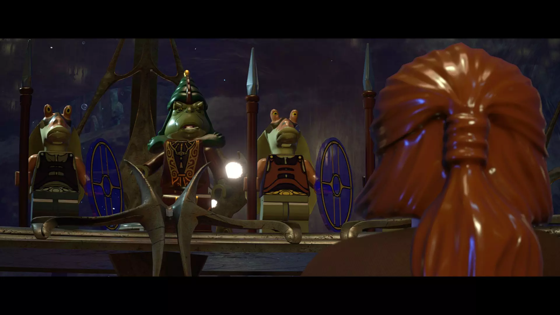 在被克洛爪鱼追逐时,当该生物即将发动攻击,屏幕上会出现按键提示。按下正确的按键以躲避攻击。连续躲避3次攻击即可完成此挑战。 幕间——皇家救援 贸易联盟的谈判迅速演变成战斗机器人的砍杀行动,奎-冈·金和欧比-旺·克诺比深陷其中。他们发现自己正处于纳布星球一场【完全合法】的入侵中心,并冒险从不断逼近的机器人军队手中拯救女王。 一位名叫加·加·宾克斯的聪明且足智多谋的当地人帮助了他们,他带领绝地武士前往自己的水下城市。在那里,长着双下巴的鱼王纳斯头领不情愿地给了他们一艘邦戈潜艇,并允许加·加加入他们。在穿越危险且布满怪物的水域抵达星球首都后,绝地武士现在必须找到阿米达拉女王并将她安全带离…… 角色:魁刚·金(带斗篷)、欧比旺·克诺比(第一部)、加·加·宾克斯 当前任务:从贸易联盟手中营救阿米达拉女王 我们发现女王正被带往4号营地。跟随标记找到她,然后击败战斗机器人以营救她。 幕间休息 - 前往科洛桑