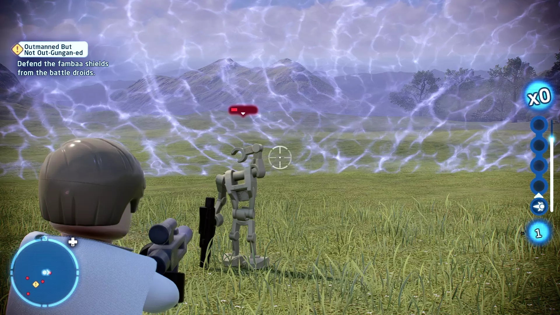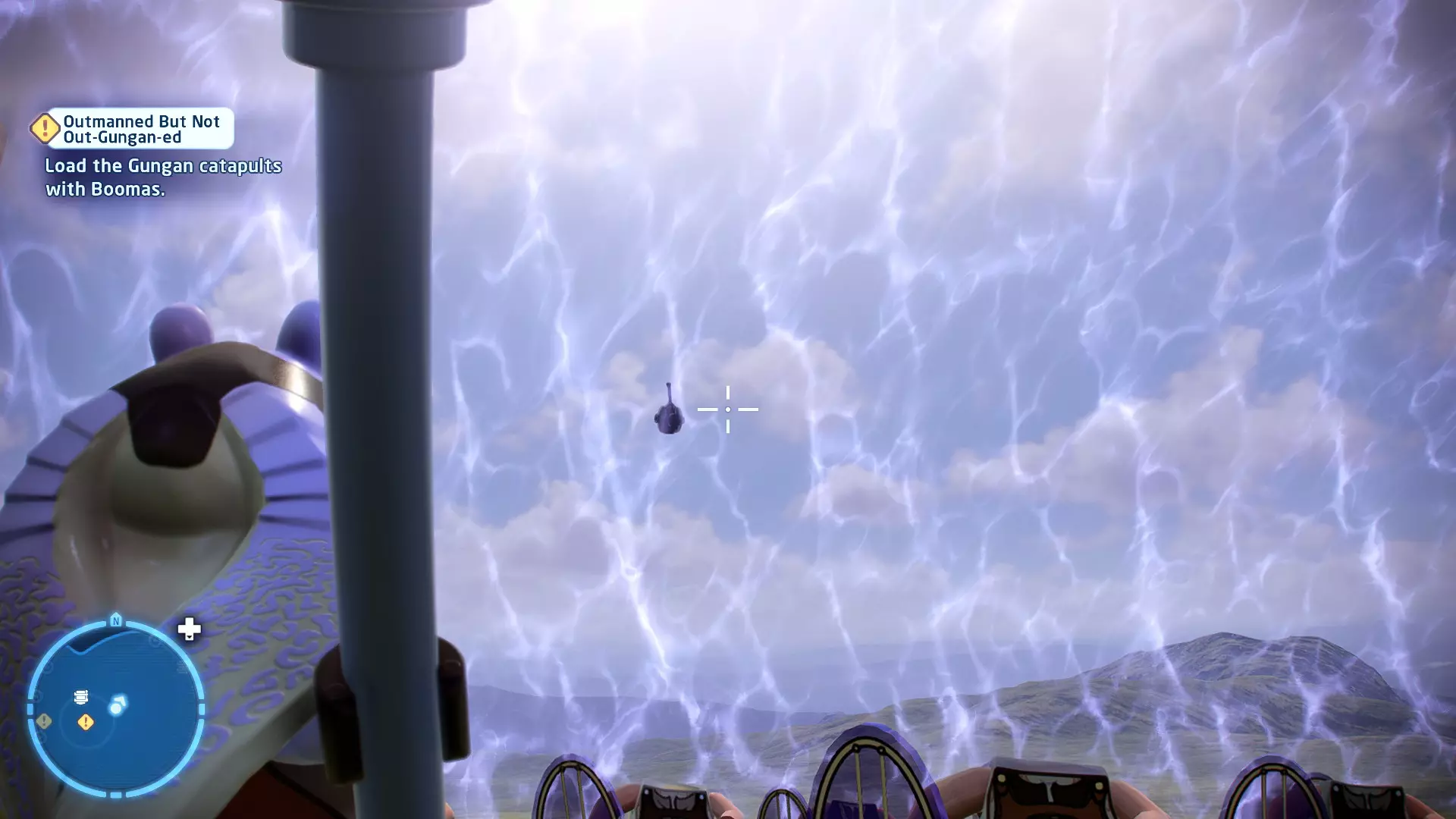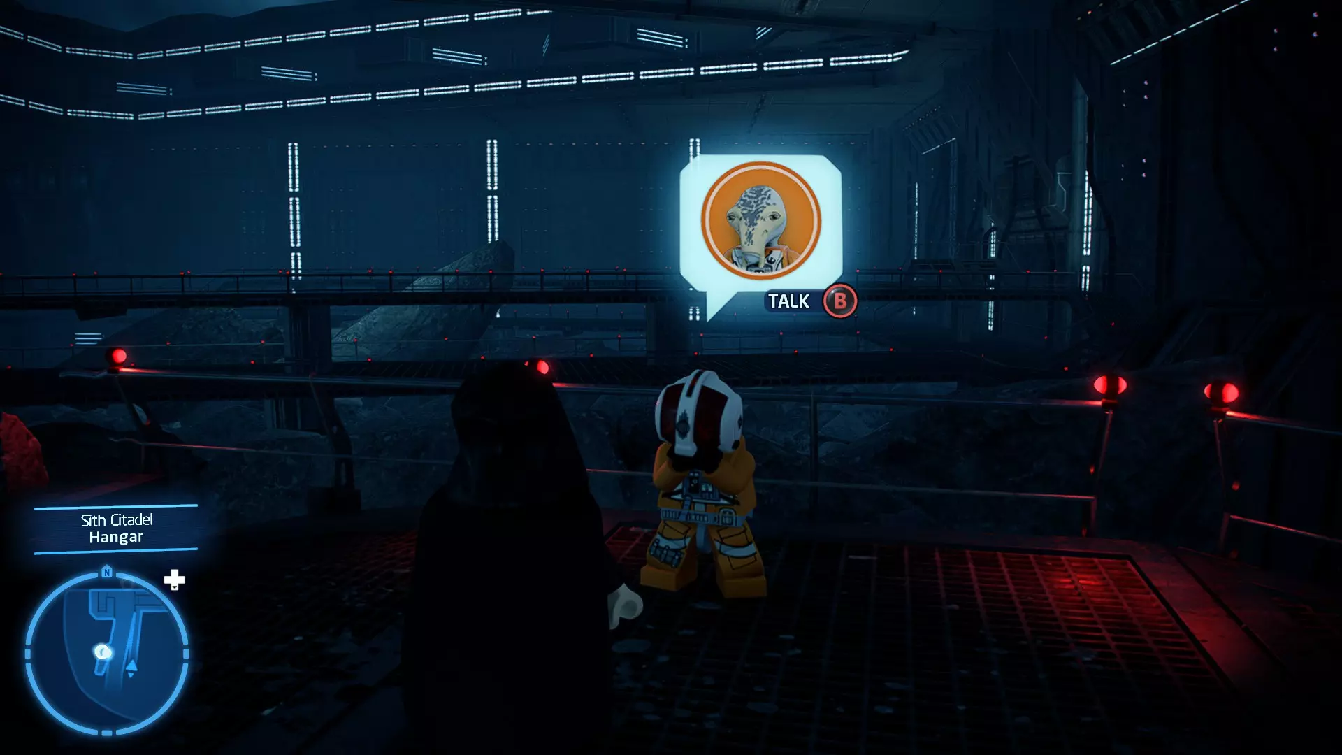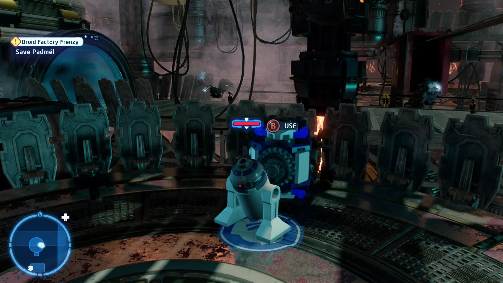 在被克洛爪鱼追逐时,当该生物即将发动攻击,屏幕上会出现按键提示。按下正确的按键以躲避攻击。连续躲避3次攻击即可完成此挑战。 幕间——皇家救援 贸易联盟的谈判迅速演变成战斗机器人的砍杀行动,奎-冈·金和欧比-旺·克诺比深陷其中。他们发现自己正处于纳布星球一场【完全合法】的入侵中心,并冒险从不断逼近的机器人军队手中拯救女王。 一位名叫加·加·宾克斯的聪明且足智多谋的当地人帮助了他们,他带领绝地武士前往自己的水下城市。在那里,长着双下巴的鱼王纳斯头领不情愿地给了他们一艘邦戈潜艇,并允许加·加加入他们。在穿越危险且布满怪物的水域抵达星球首都后,绝地武士现在必须找到阿米达拉女王并将她安全带离…… 角色:魁刚·金(带斗篷)、欧比旺·克诺比(第一部)、加·加·宾克斯 当前任务:从贸易联盟手中营救阿米达拉女王 我们发现女王正被带往4号营地。跟随标记找到她,然后击败战斗机器人以营救她。 幕间休息 - 前往科洛桑