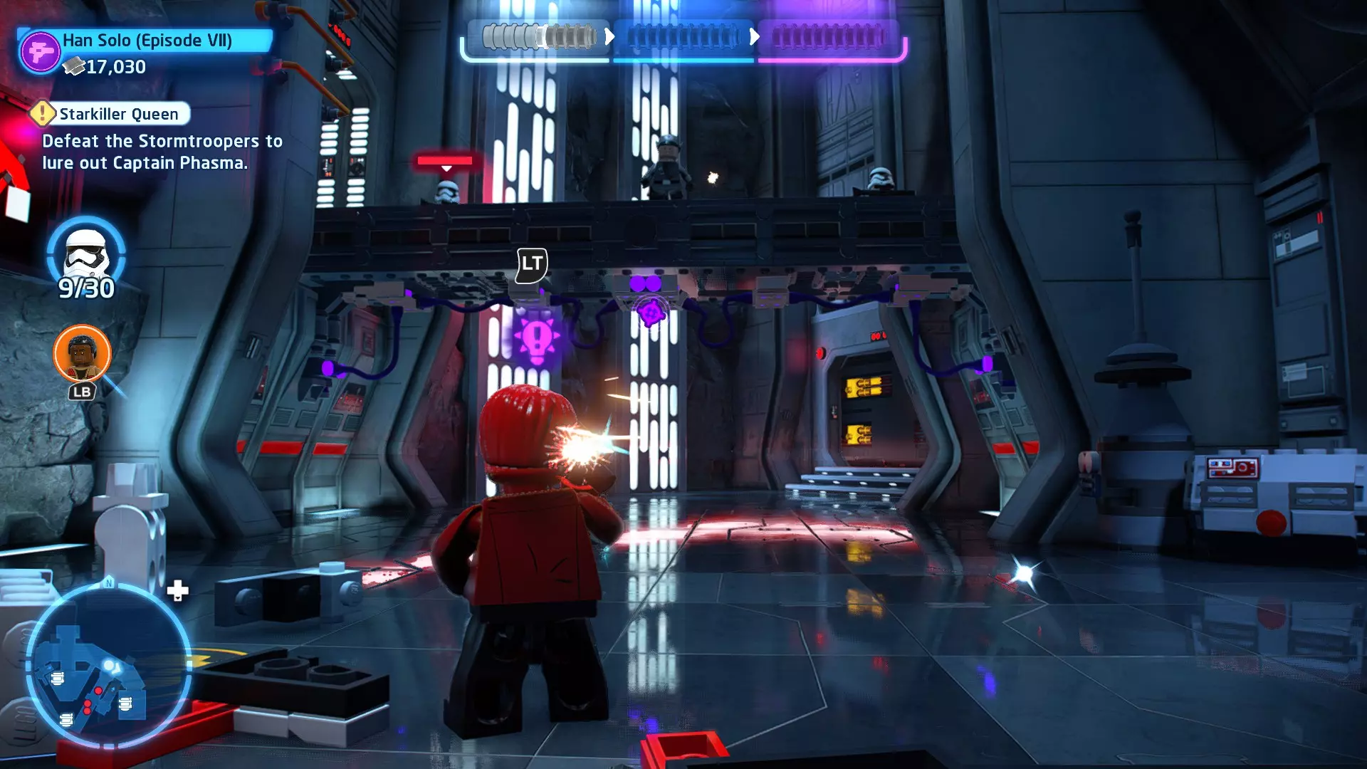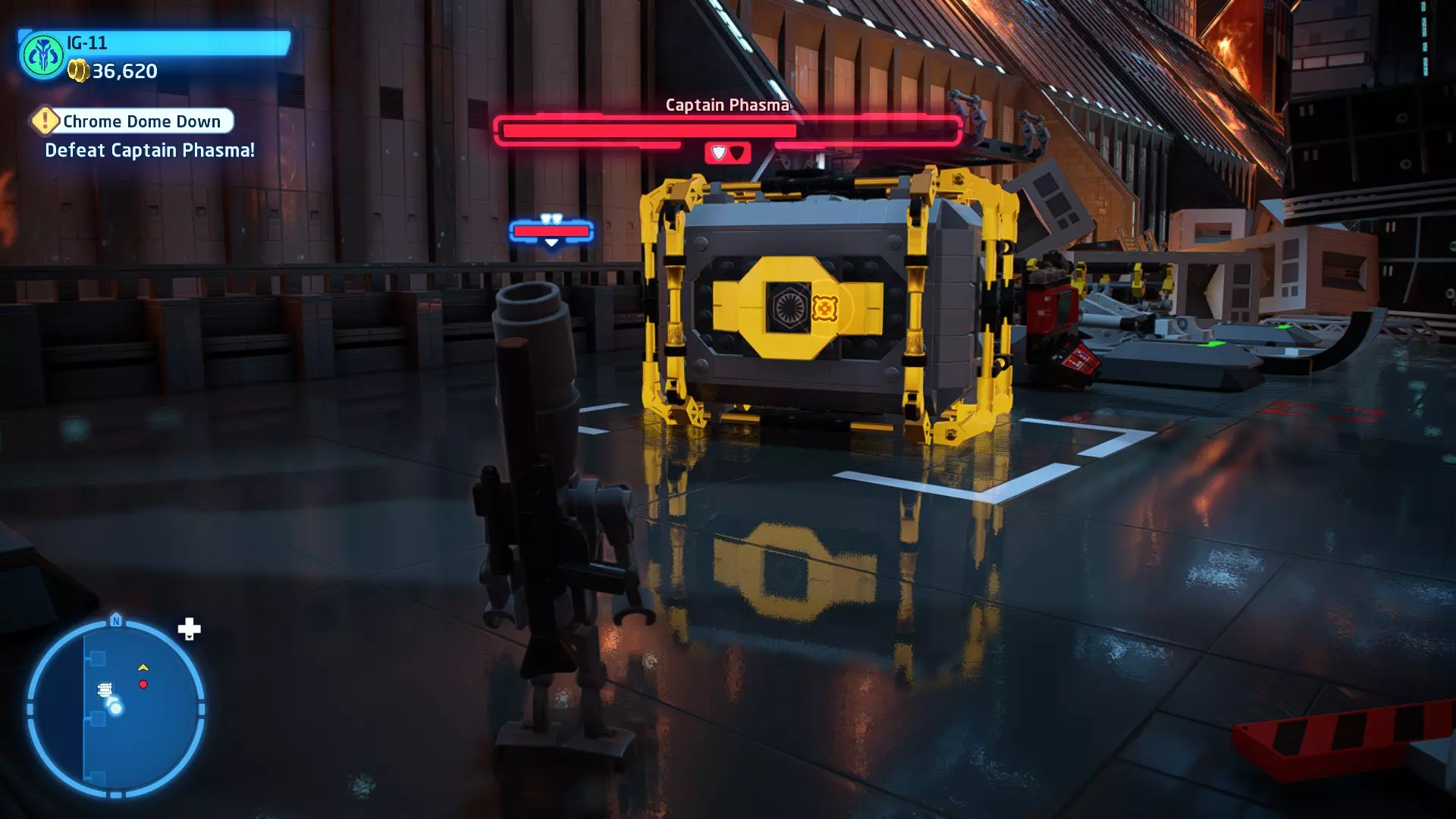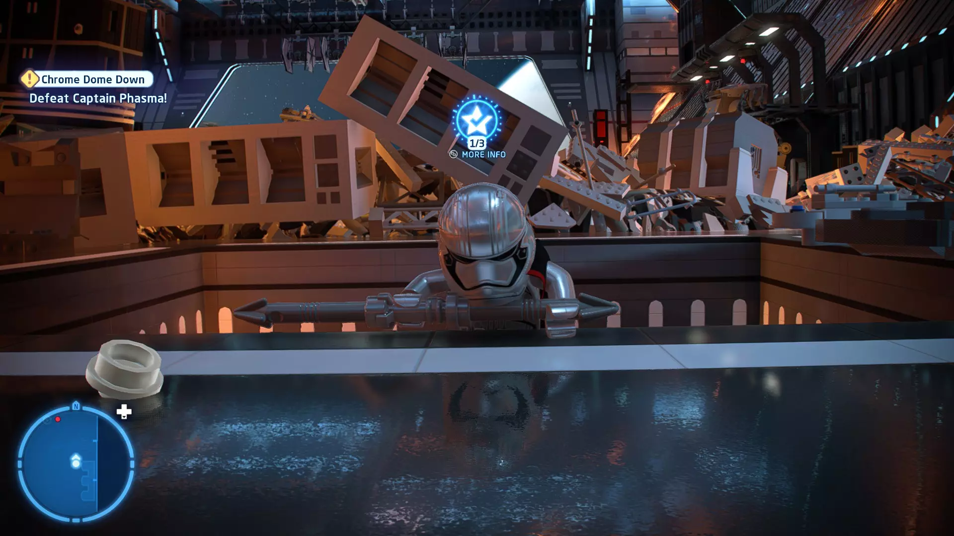 第三个机器人可在法斯马队长战斗的第三阶段找到。爬上法斯马右侧的梯子到达一个平台,你会在那里发现第三个机器人。摧毁所有3个机器人即可获得这个【迷你套件】。 微型飞船:至高无上号(微型) 【铁头功】- 关卡挑战 所需能力:爆破、精准射击、反派、武器库 挑战1 - 小心,铁头! 详情:想办法让一架TIE截击机落到法斯马队长头顶上