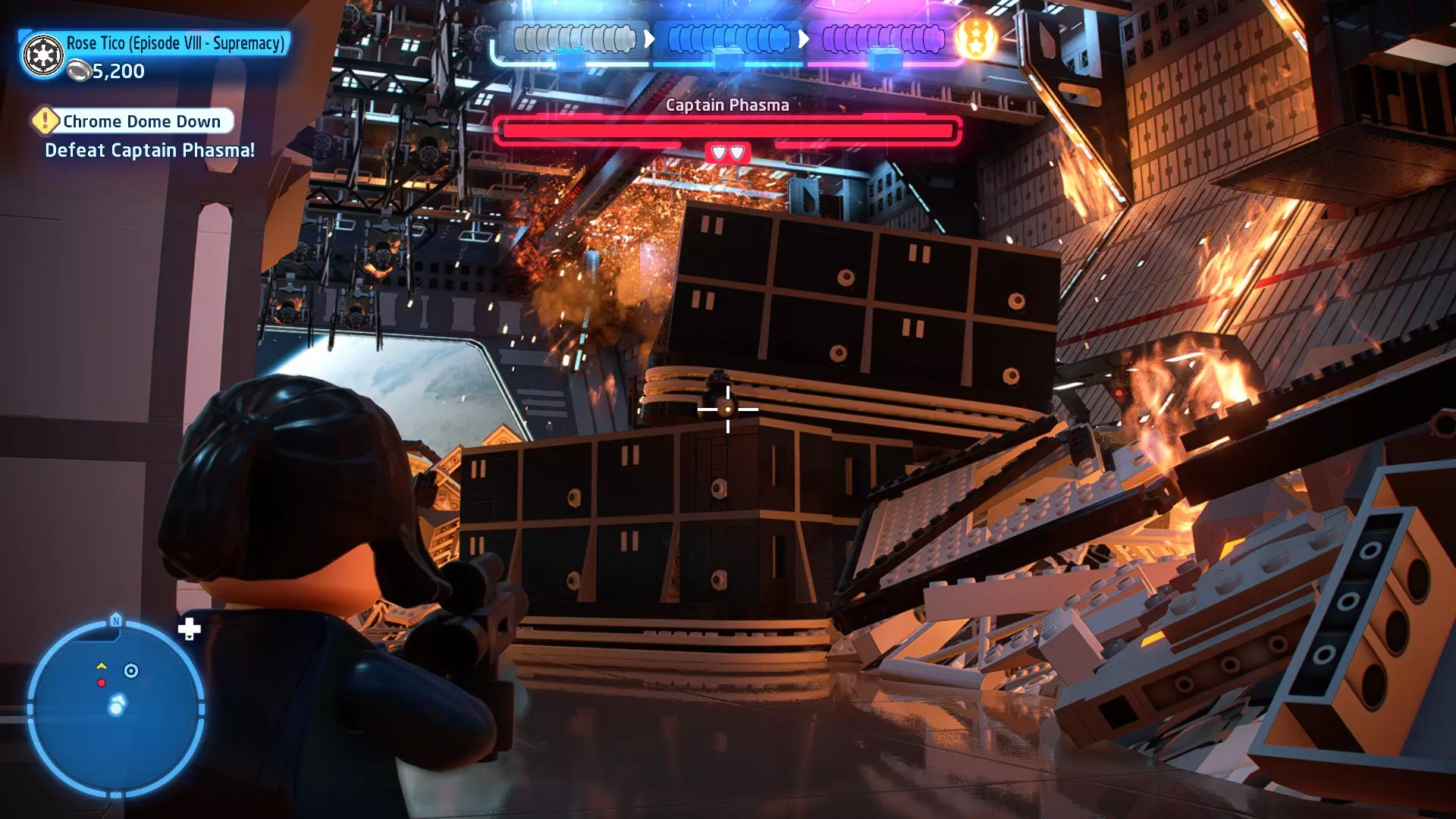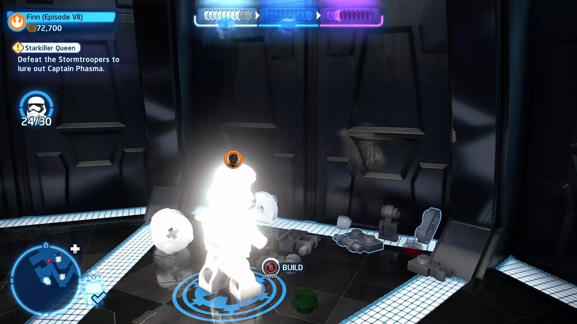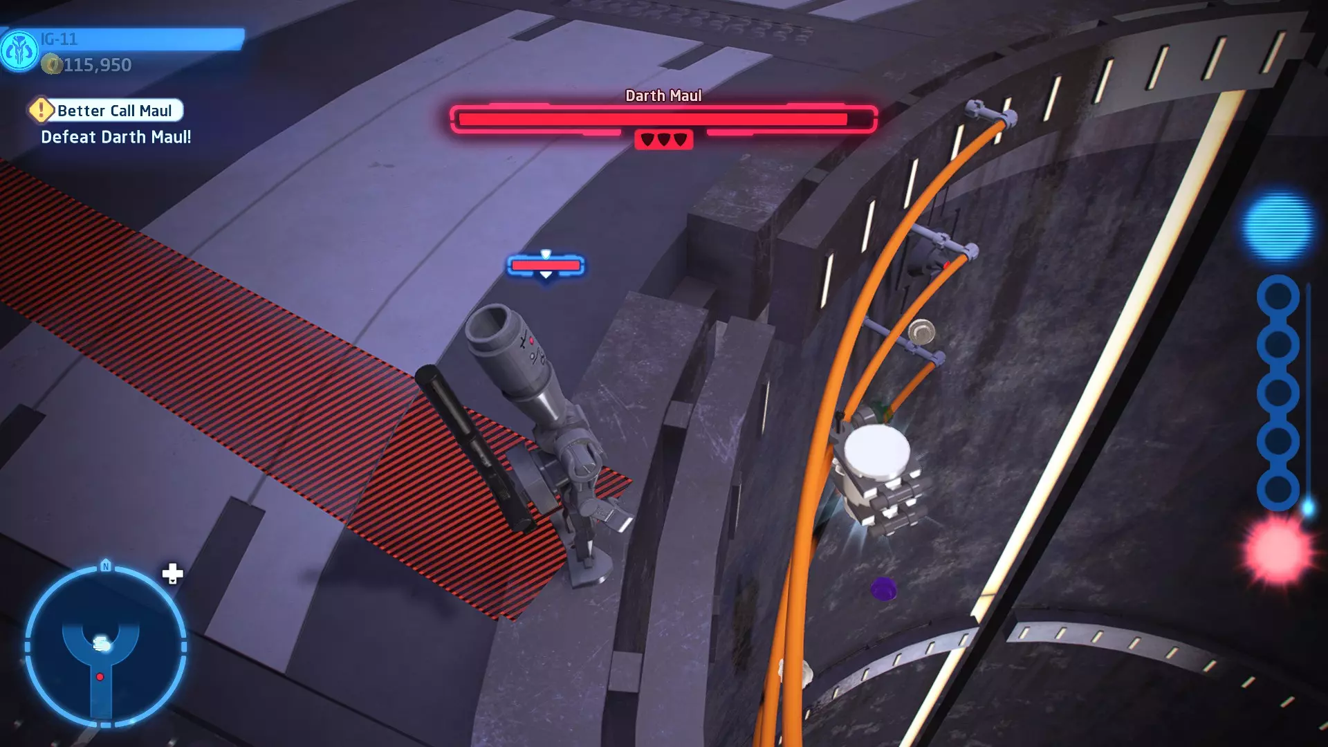 第三个机器人可在法斯马队长战斗的第三阶段找到。爬上法斯马右侧的梯子到达一个平台,你会在那里发现第三个机器人。摧毁所有3个机器人即可获得这个【迷你套件】。 微型飞船:至高无上号(微型) 【铁头功】- 关卡挑战 所需能力:爆破、精准射击、反派、武器库 挑战1 - 小心,铁头! 详情:想办法让一架TIE截击机落到法斯马队长头顶上