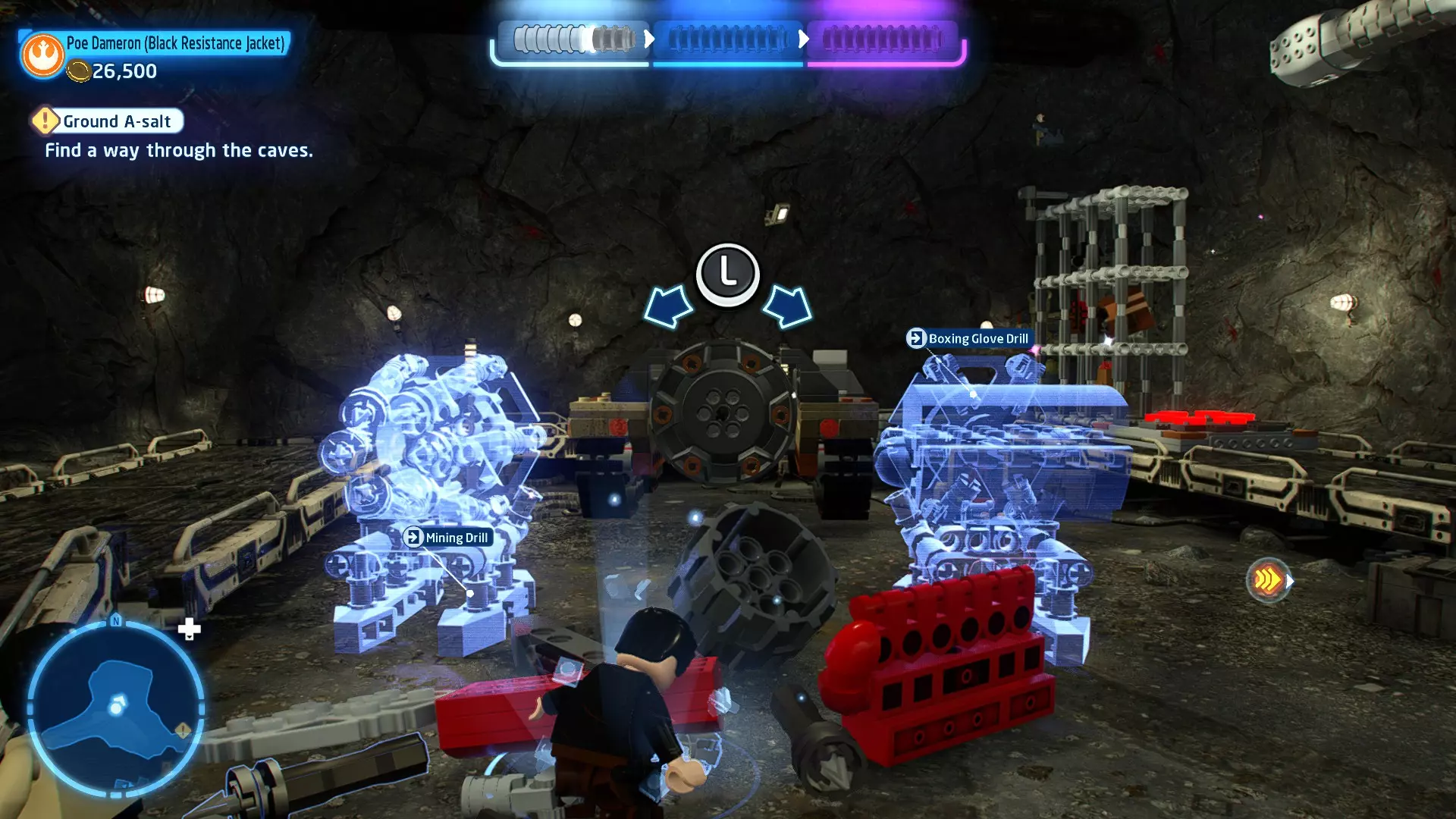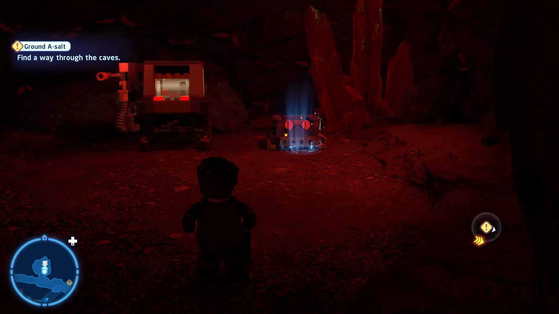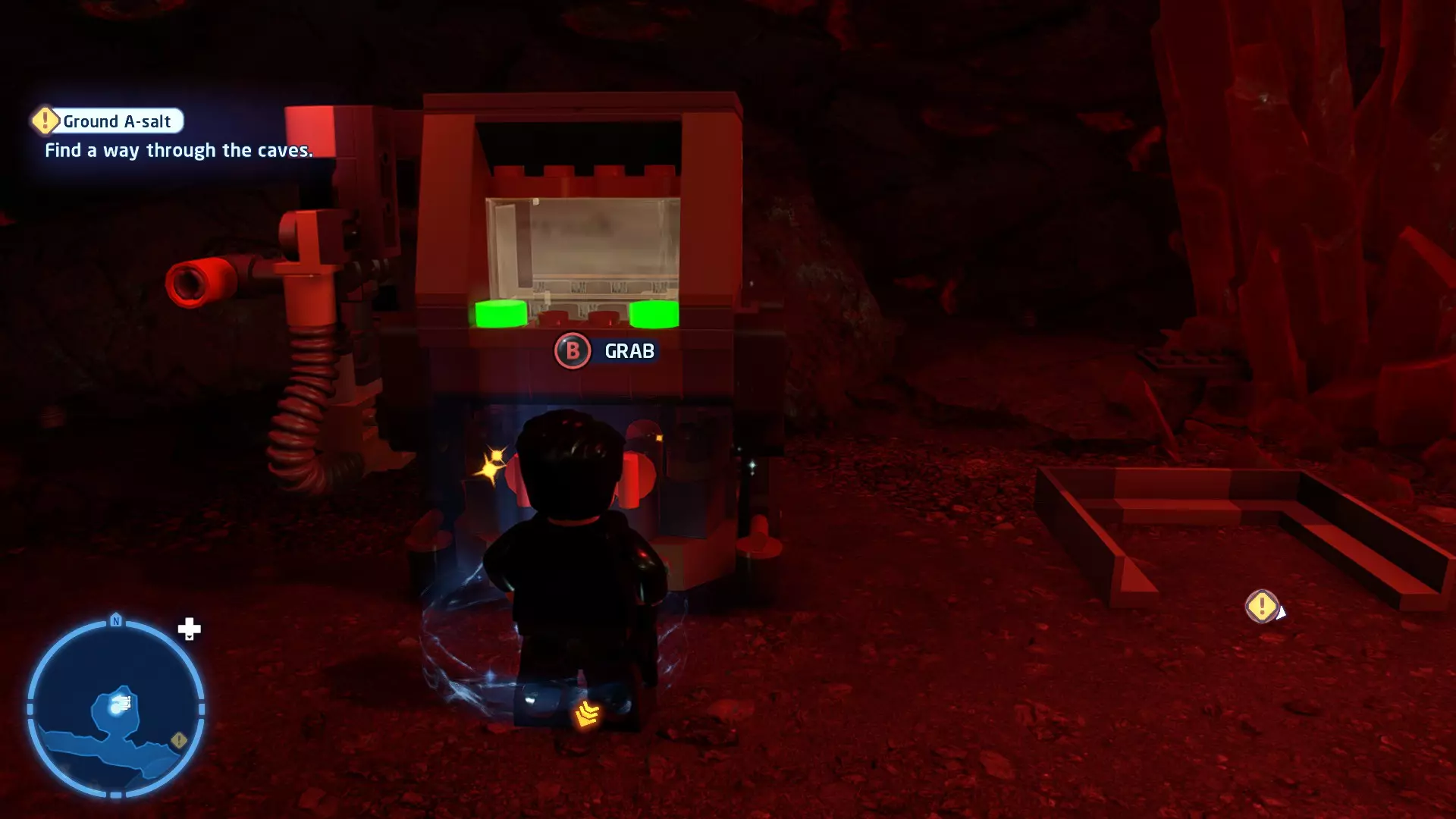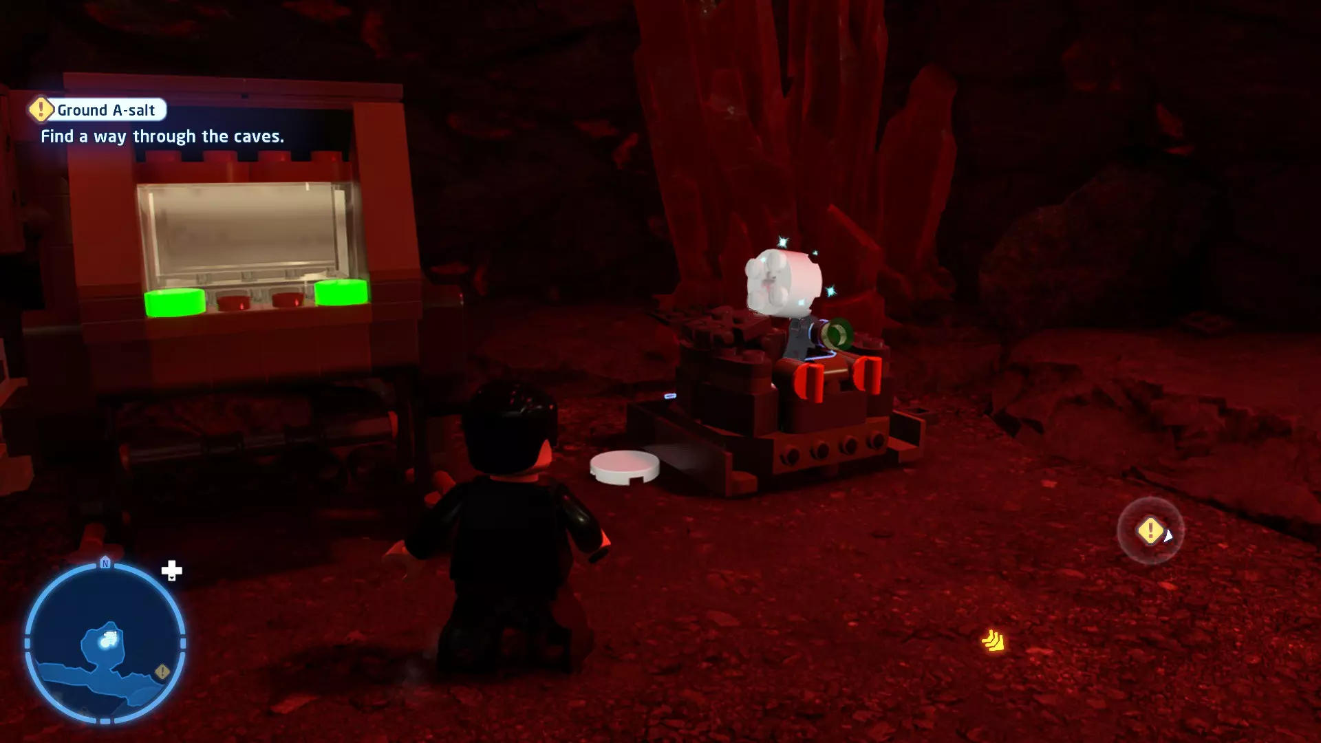 穿过洞穴后,你会在一片空地上追上沃尔普斯兽。在前方路径的左侧,你会发现一面有裂缝的墙壁。使用破拆爆能枪摧毁它,就能找到这个迷你套件。 微型飞船:凯洛·伦的穿梭机(微型) 地面突袭 - 关卡挑战 所需能力:抓钩、英雄、协议 挑战1 - 我能挖! 详情:一路打穿水晶洞穴