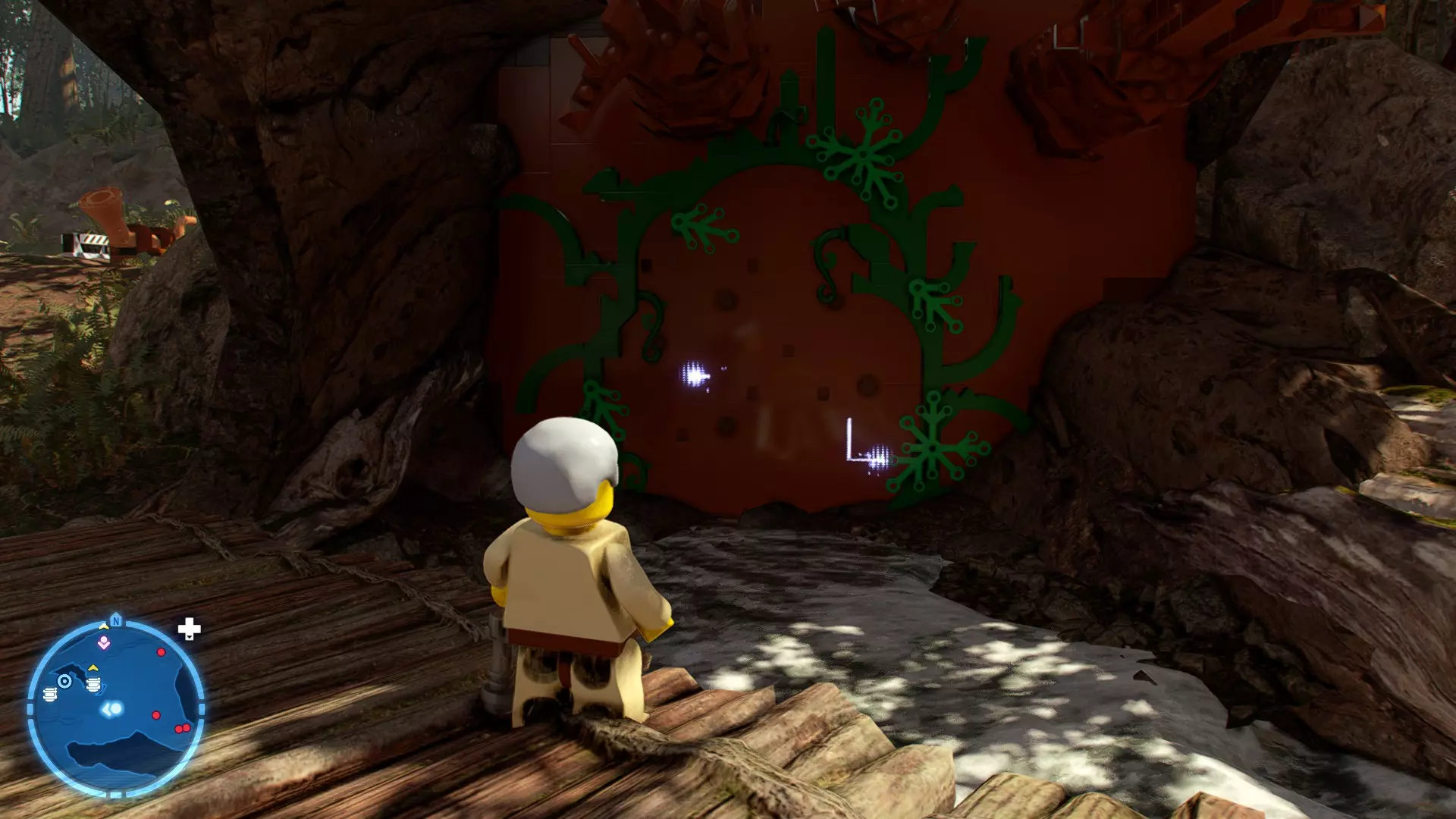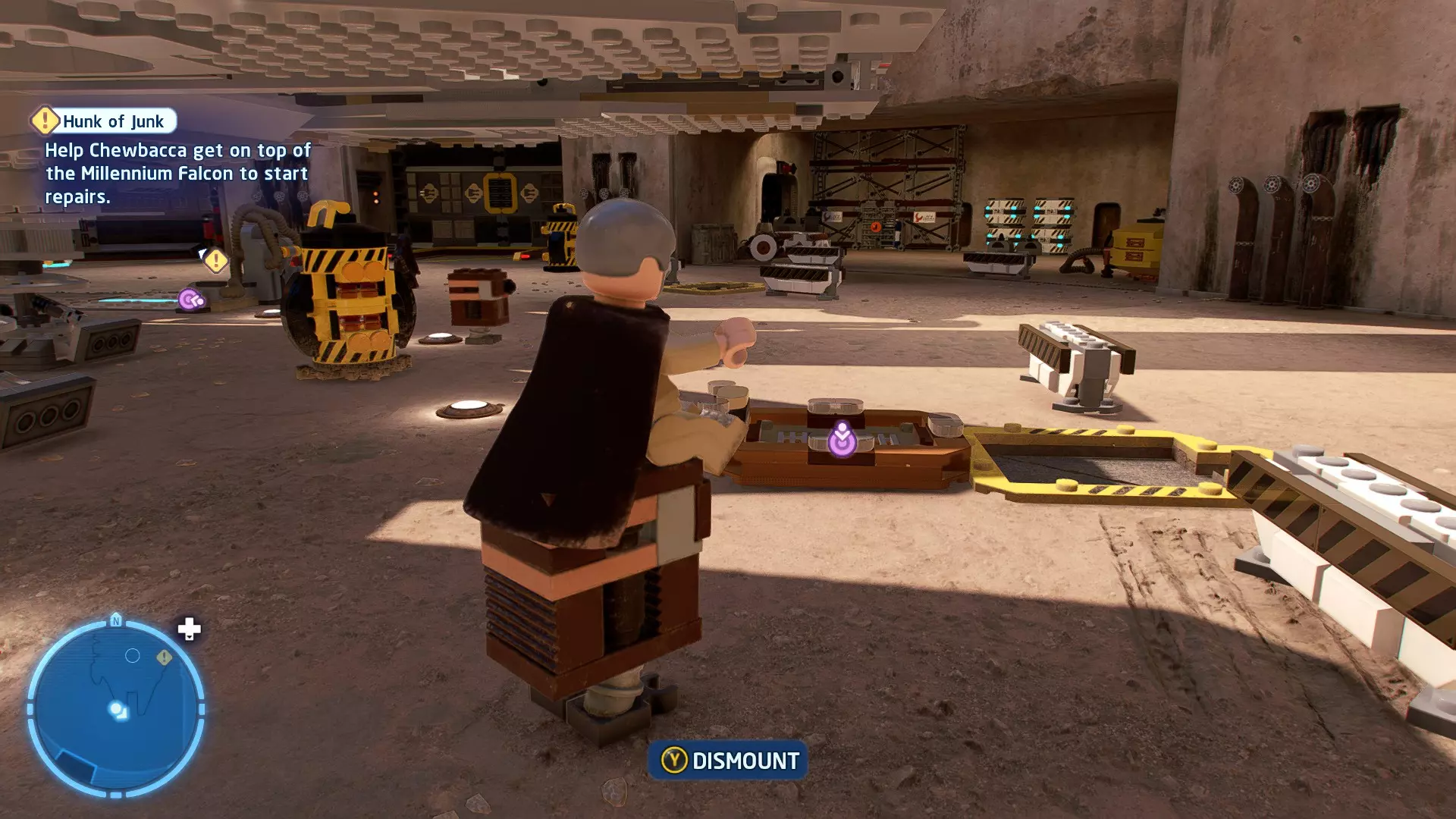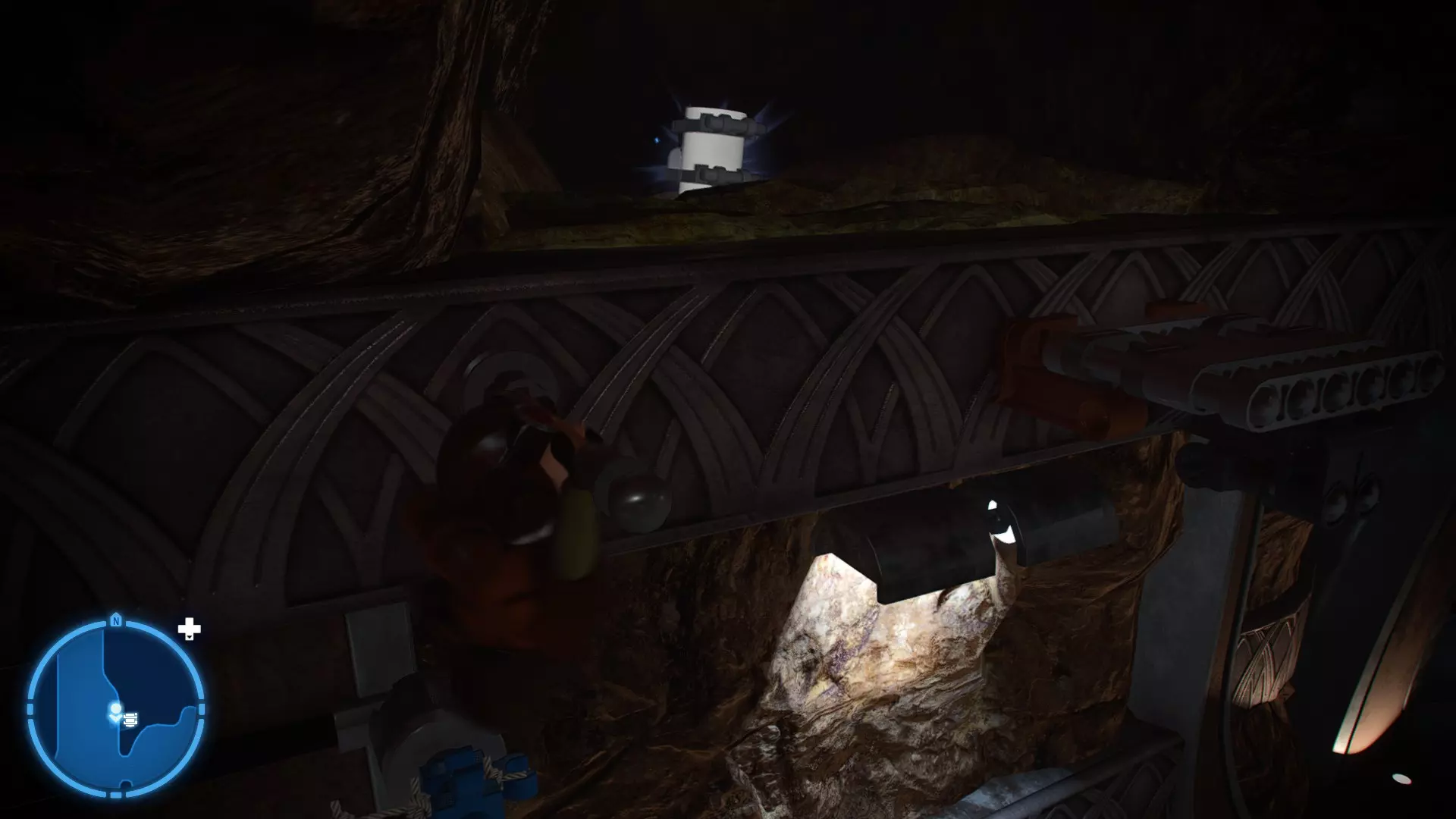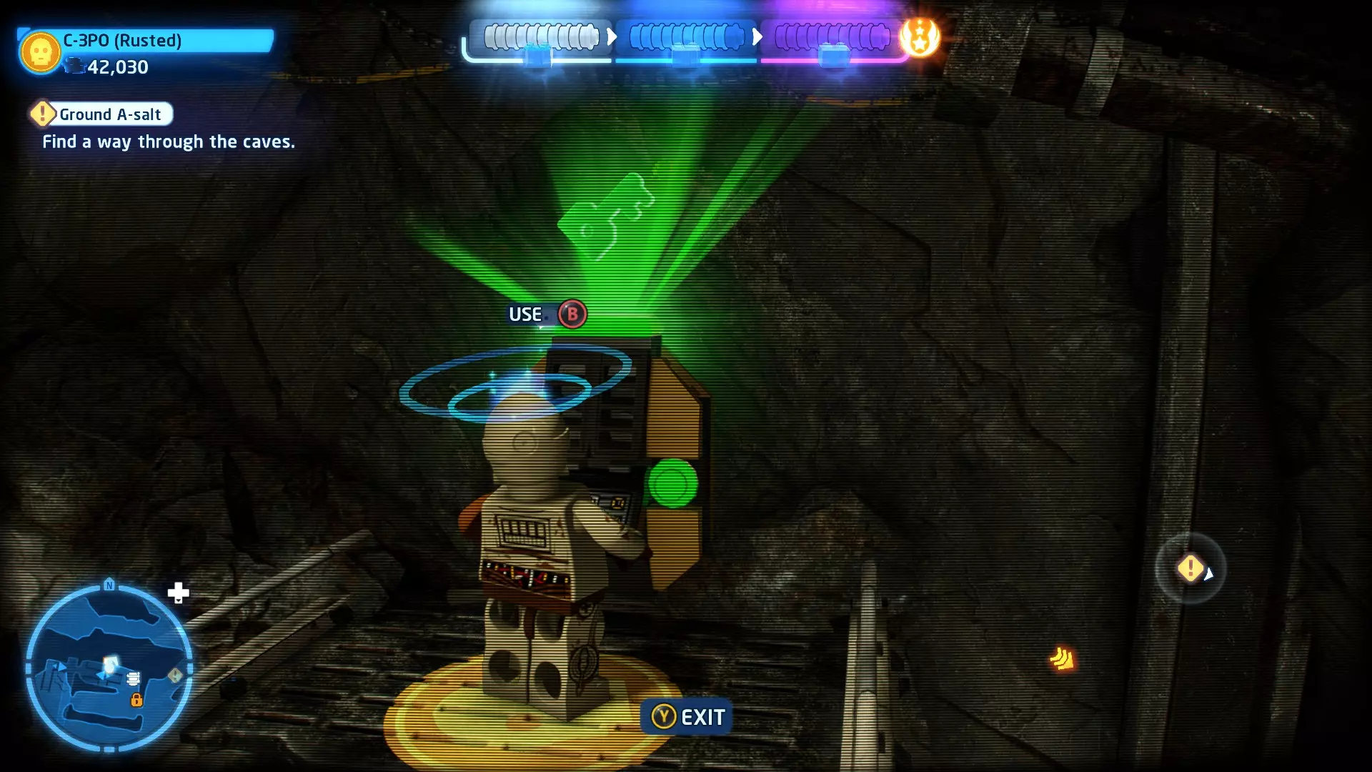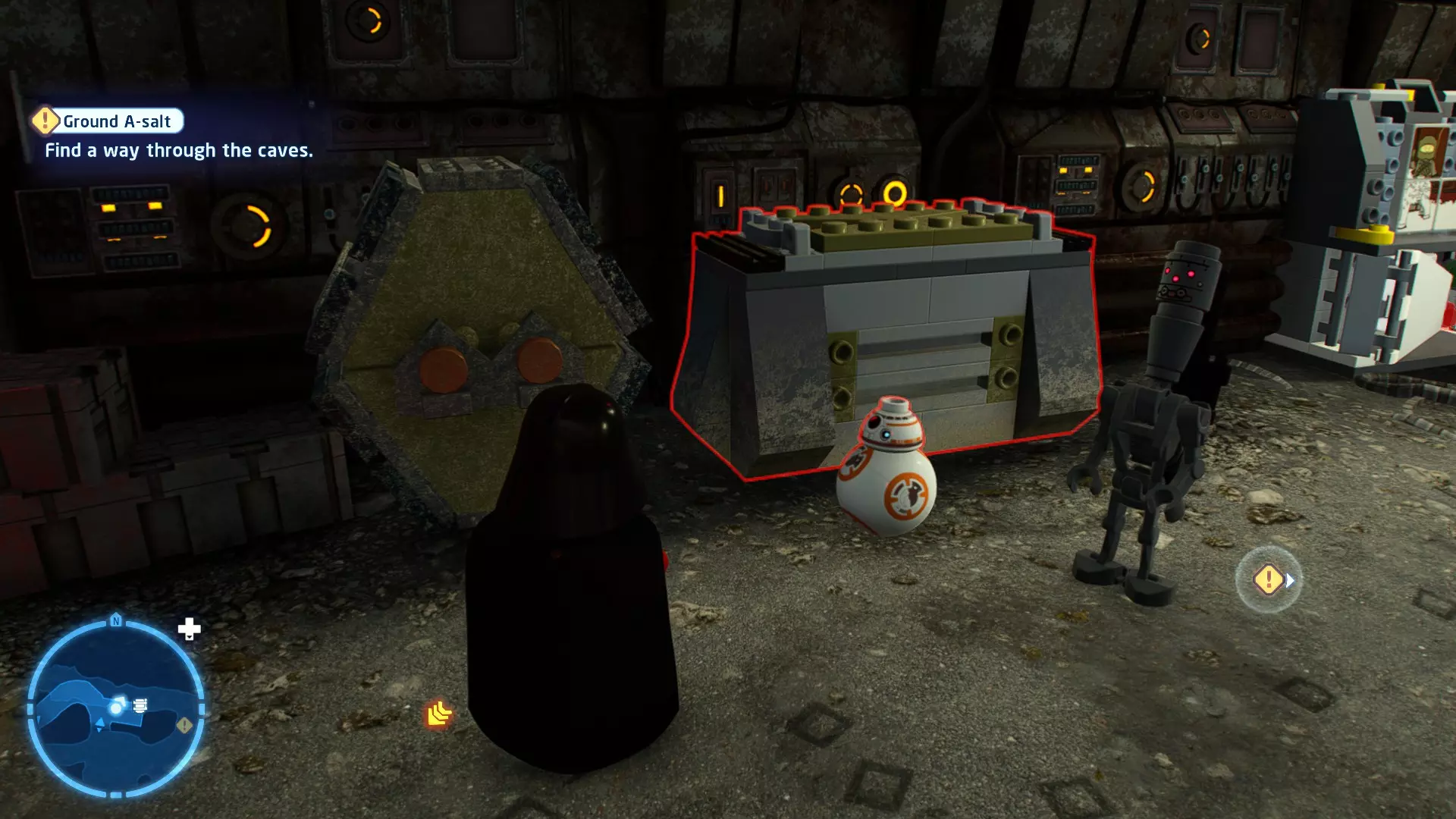 穿过洞穴后,你会在一片空地上追上沃尔普斯兽。在前方路径的左侧,你会发现一面有裂缝的墙壁。使用破拆爆能枪摧毁它,就能找到这个迷你套件。 微型飞船:凯洛·伦的穿梭机(微型) 地面突袭 - 关卡挑战 所需能力:抓钩、英雄、协议 挑战1 - 我能挖! 详情:一路打穿水晶洞穴