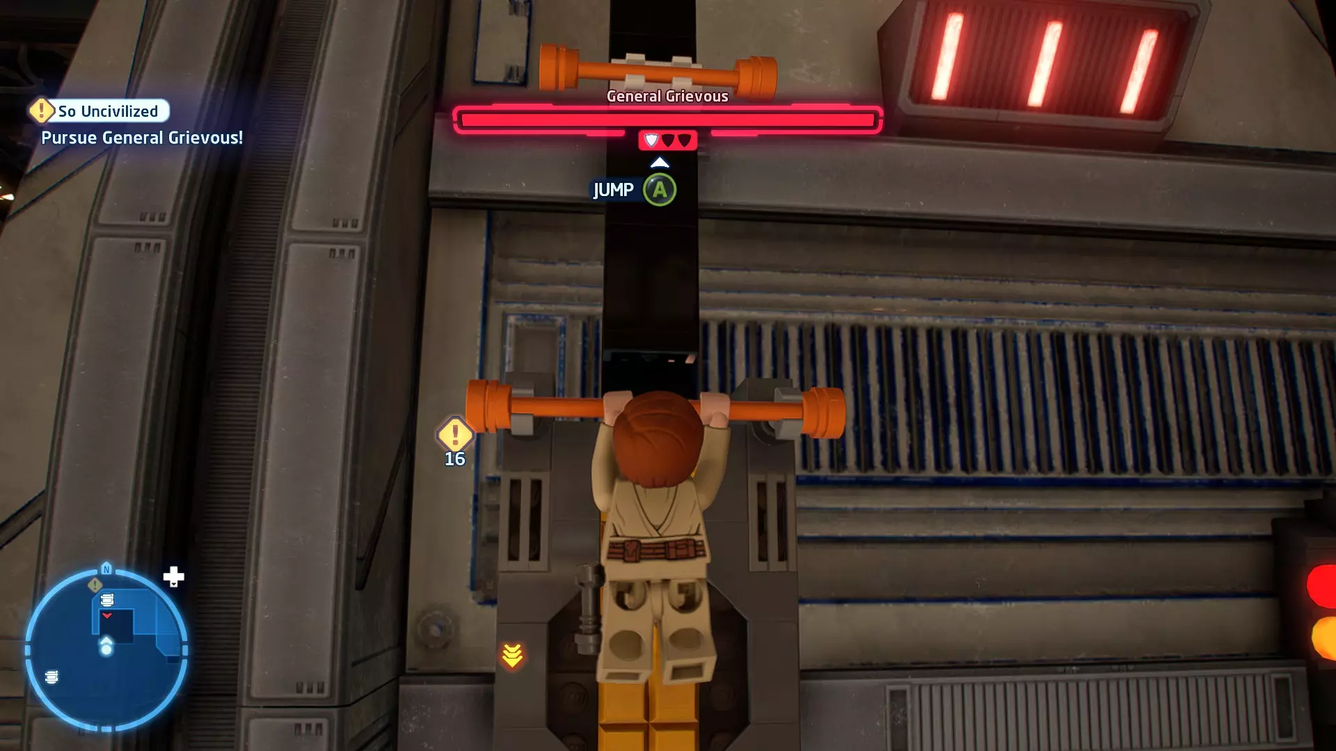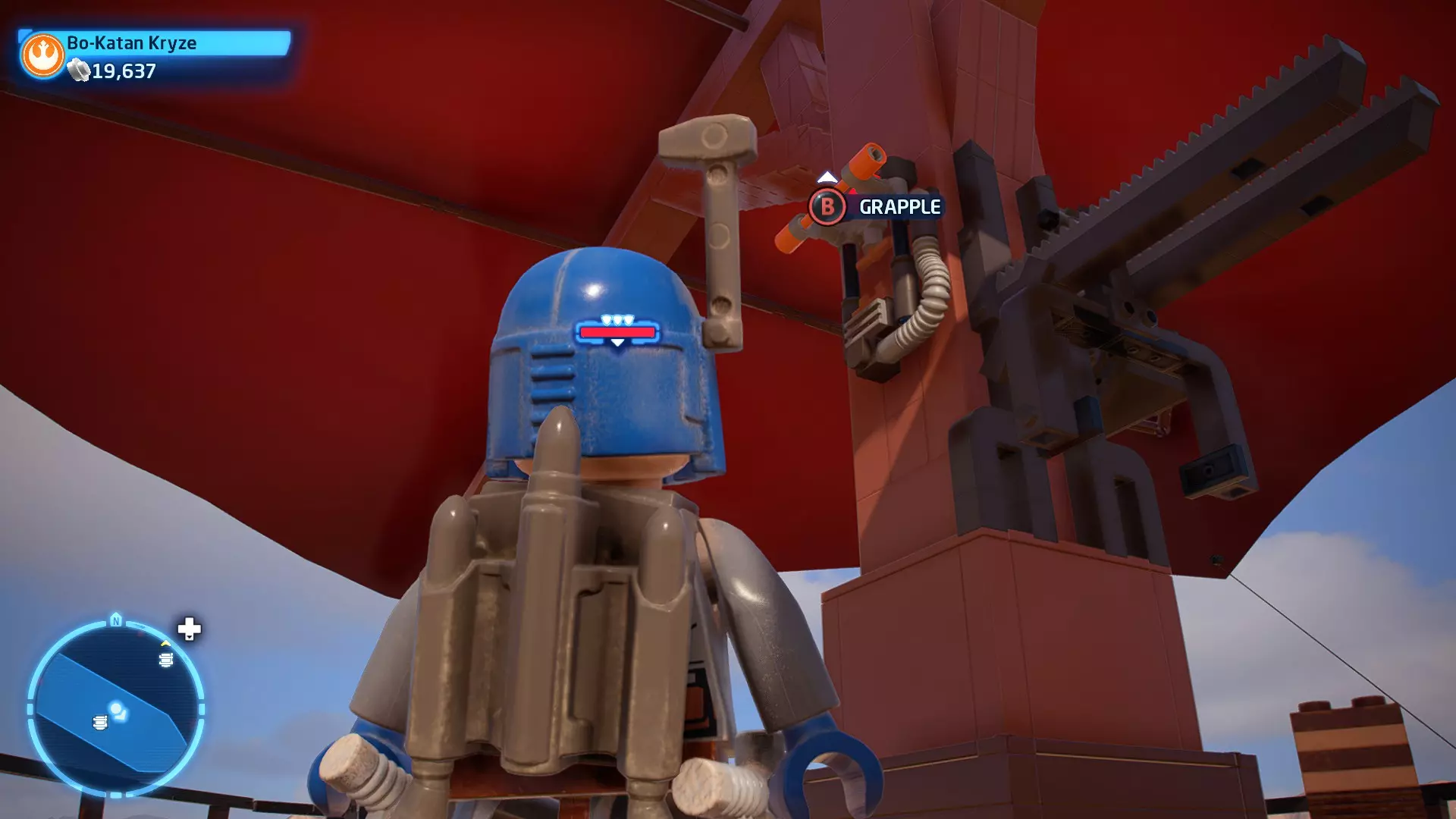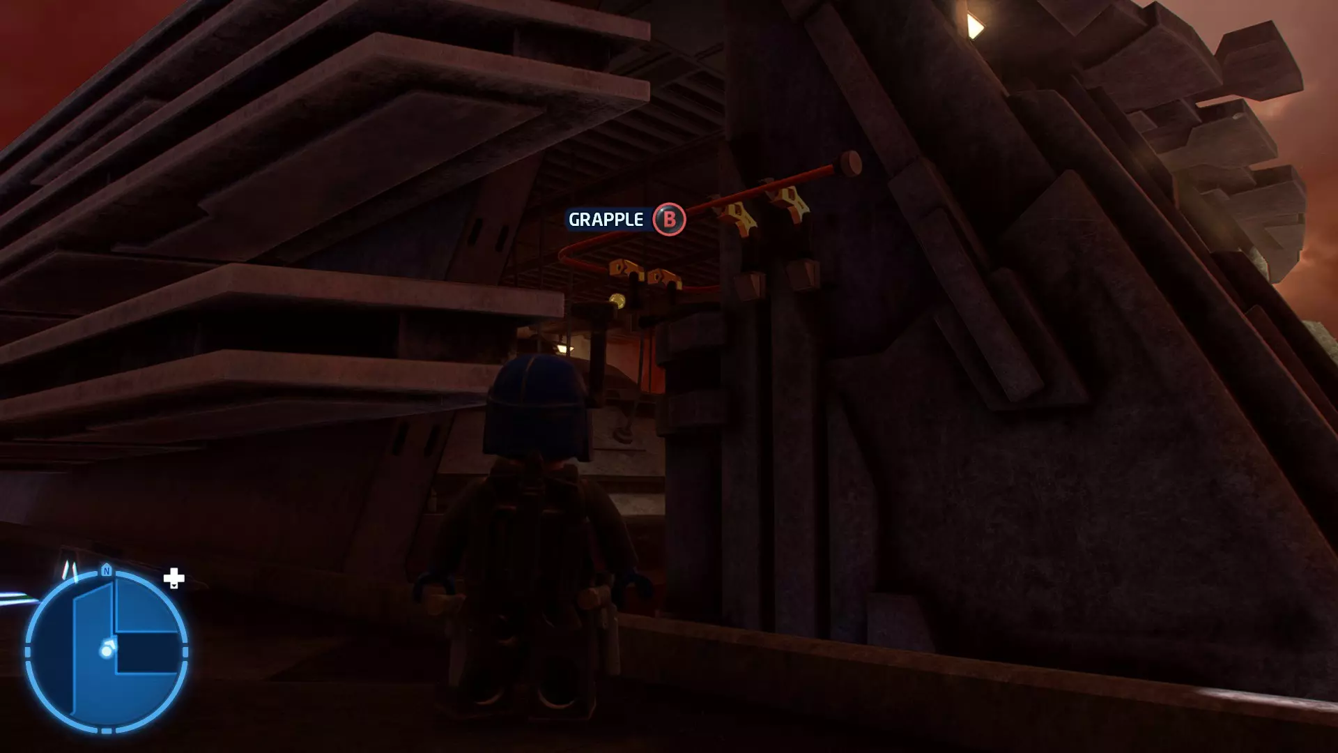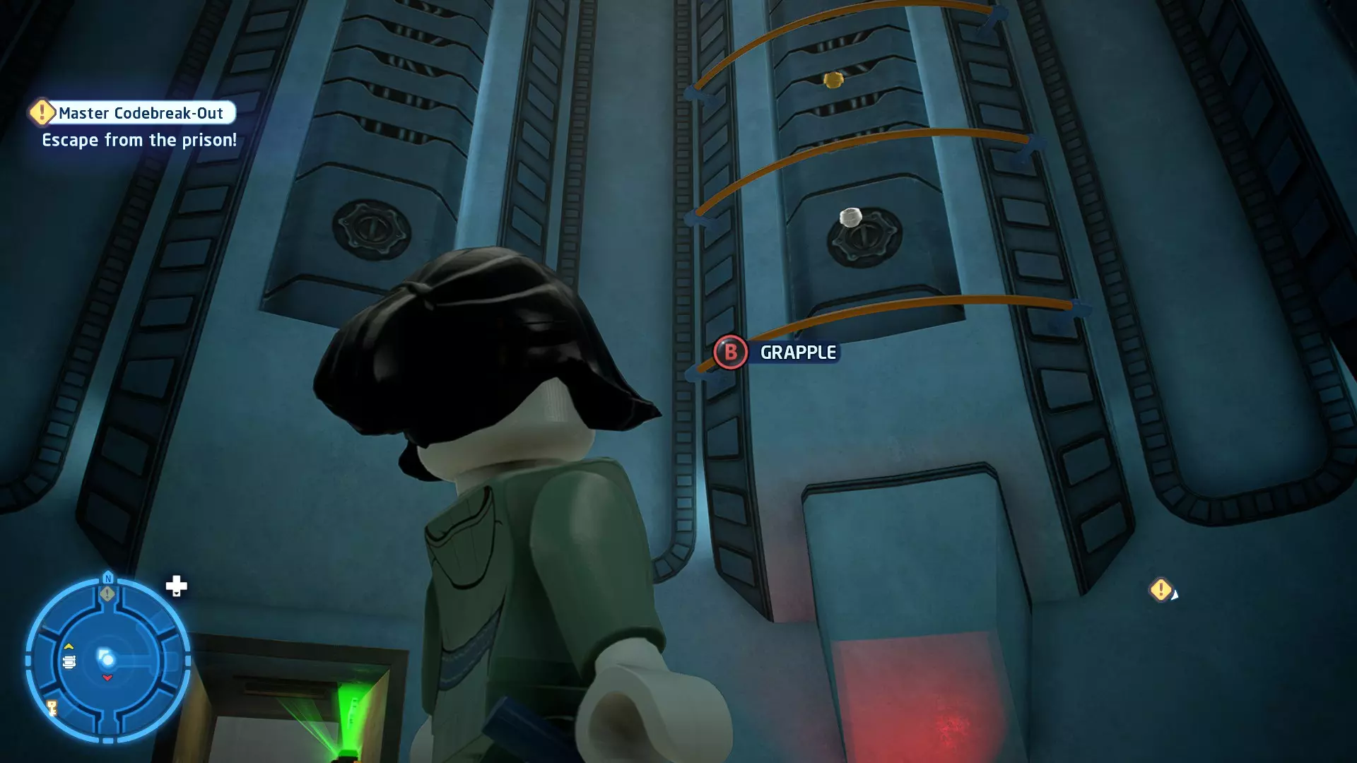 拥有此能力的角色还可以抓住橙色抓钩点。按下【特殊】键进行抓取,然后再次按下【特殊】键进行拉扯。等待圆圈到达绿色区域可获得少量 studs 奖励! 角色职业:英雄、赏金猎人、宇航技工机器人 英雄