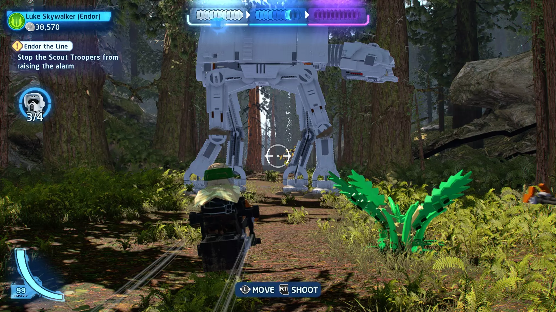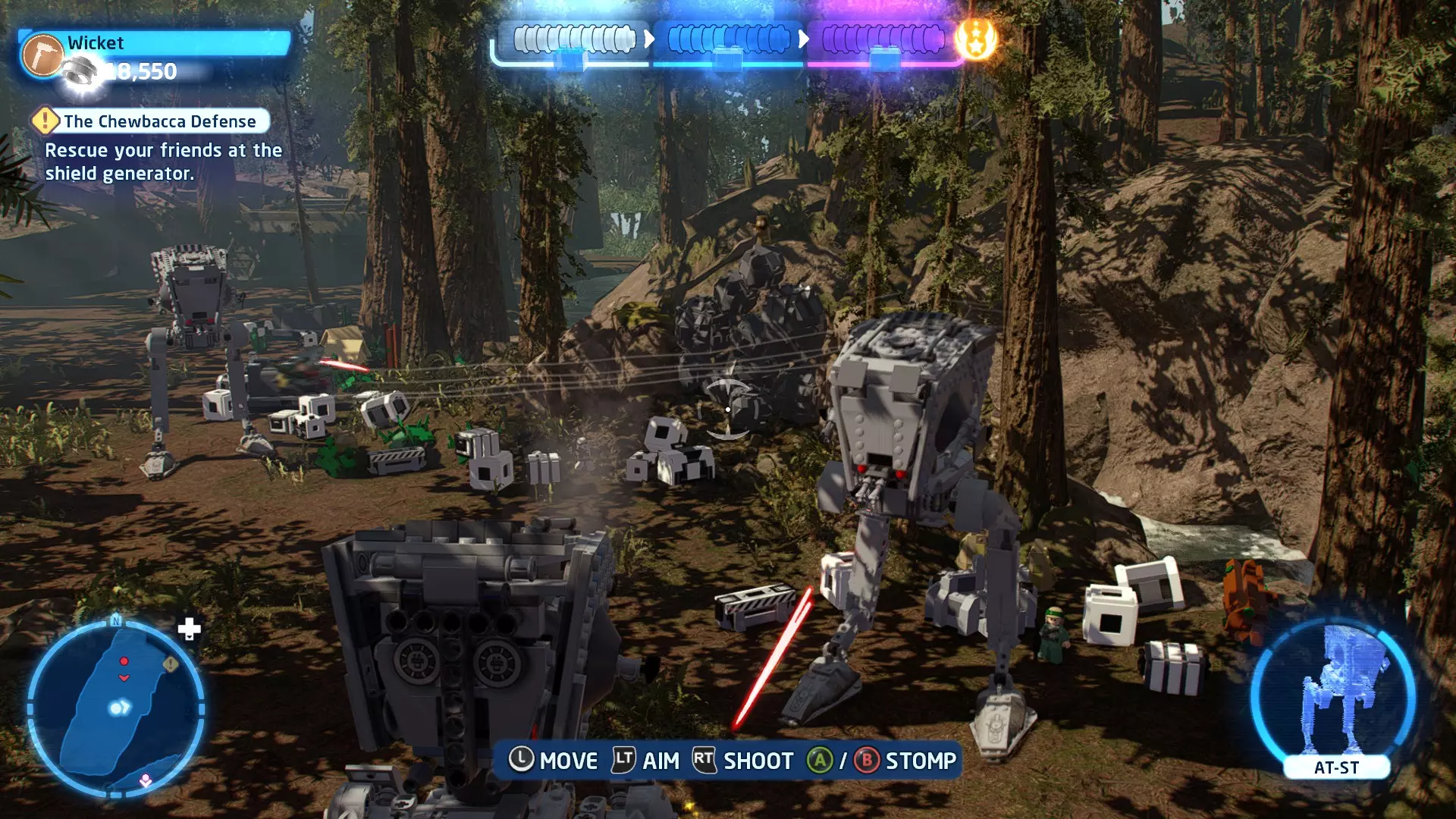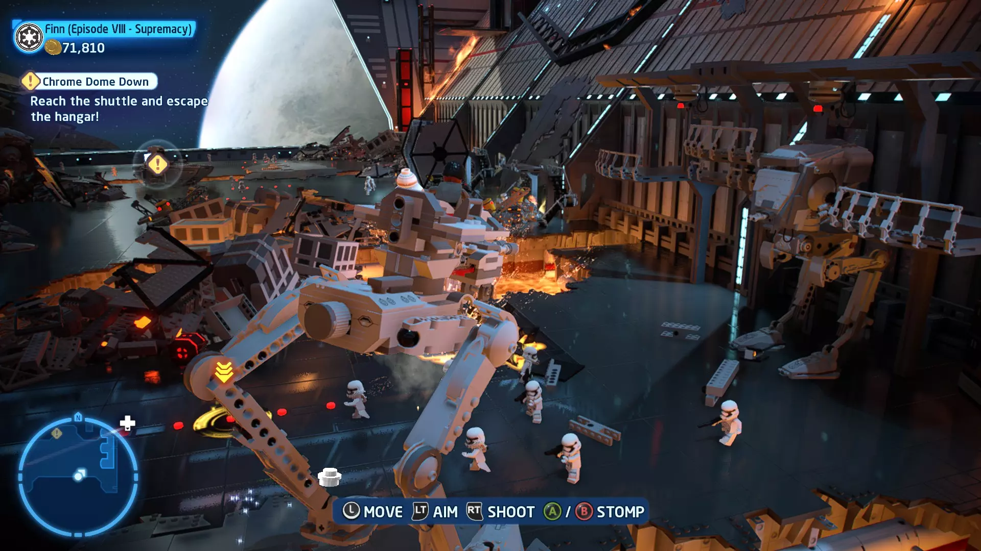 要完成此挑战,你需要用9种不同方式对法斯马造成伤害。大致上,按照我的故事模式攻略进行,并确保不要重复使用同一种方法(比如多次用钛战机或AT-ST机甲砸她)。 挑战3 - 脚下生乱 详情:驾驶AT-ST机甲踩踏10名冲锋队员