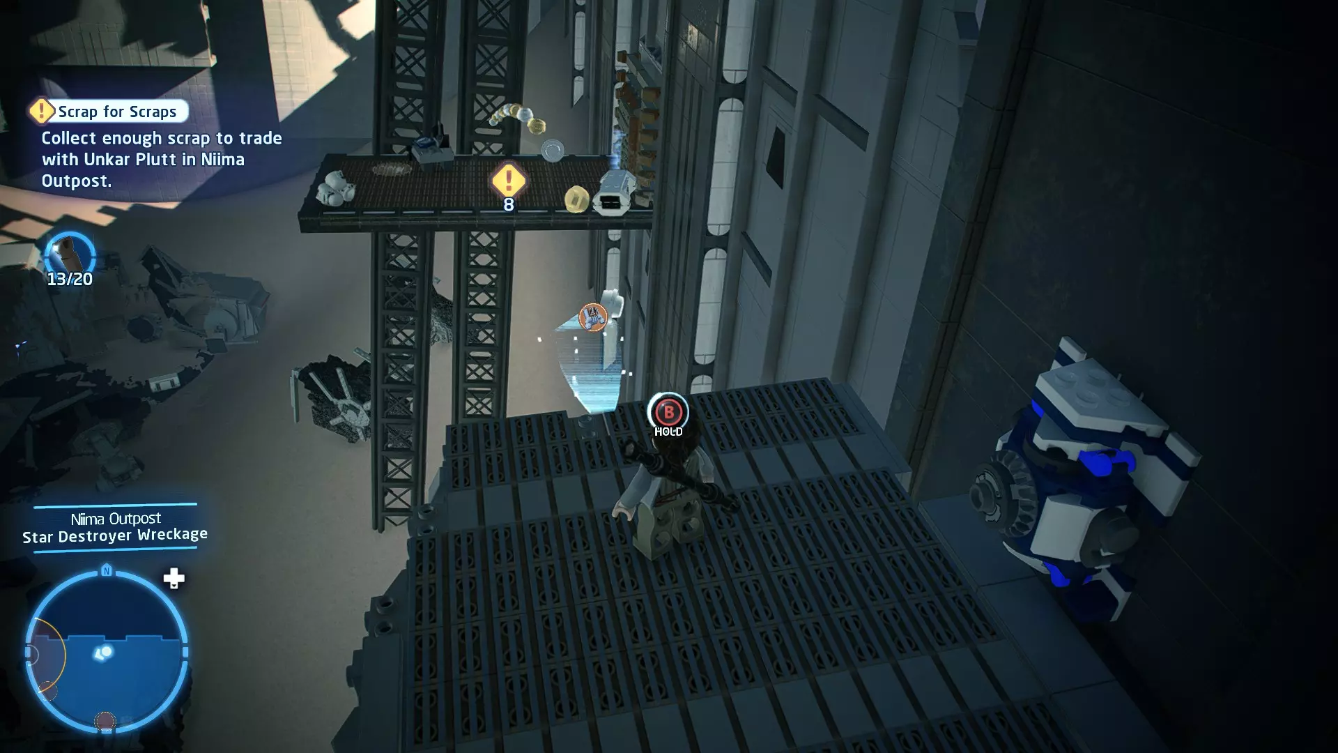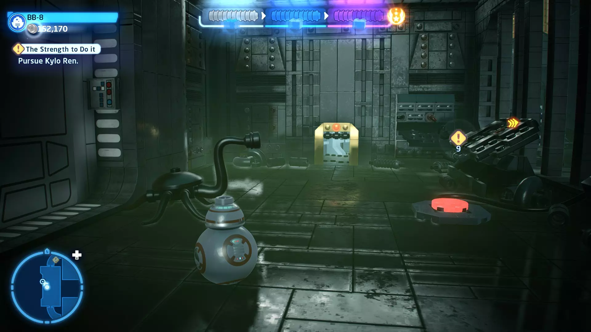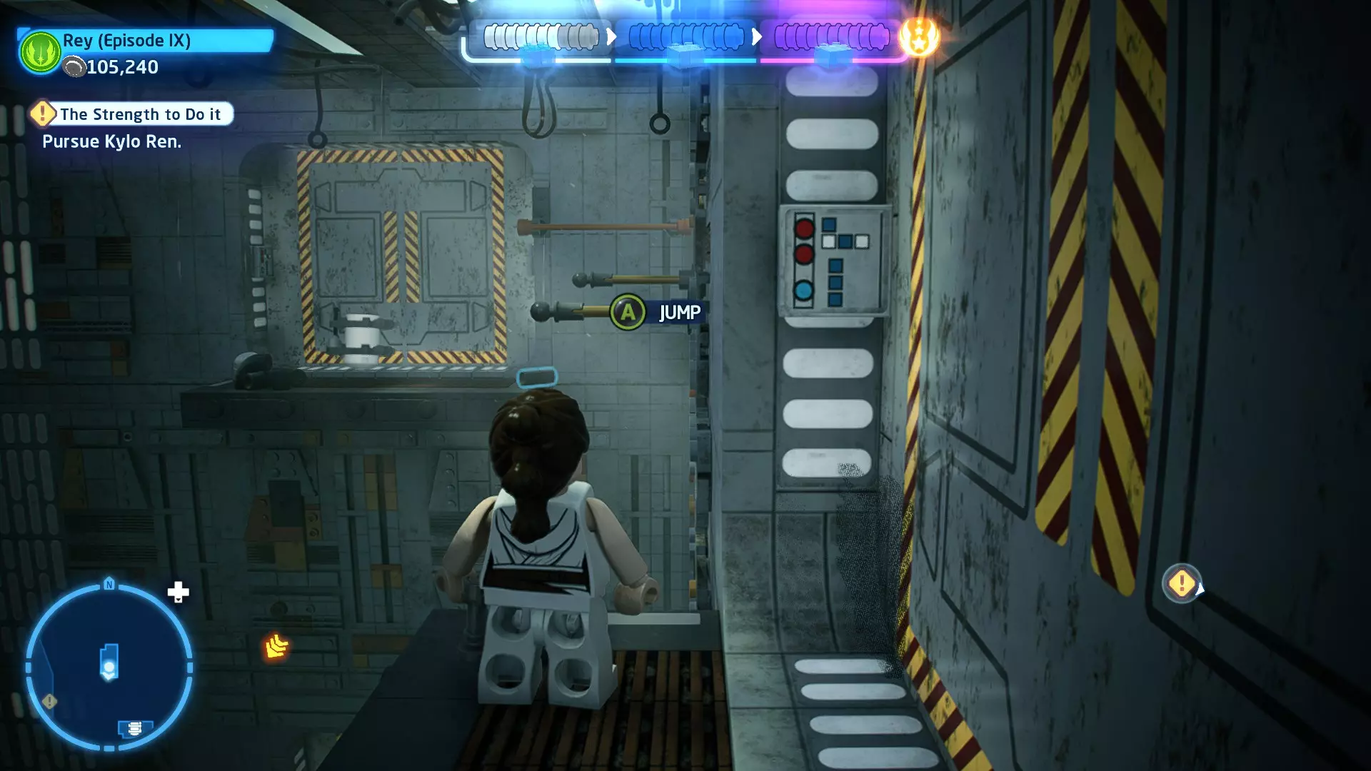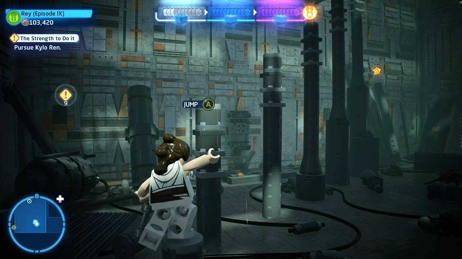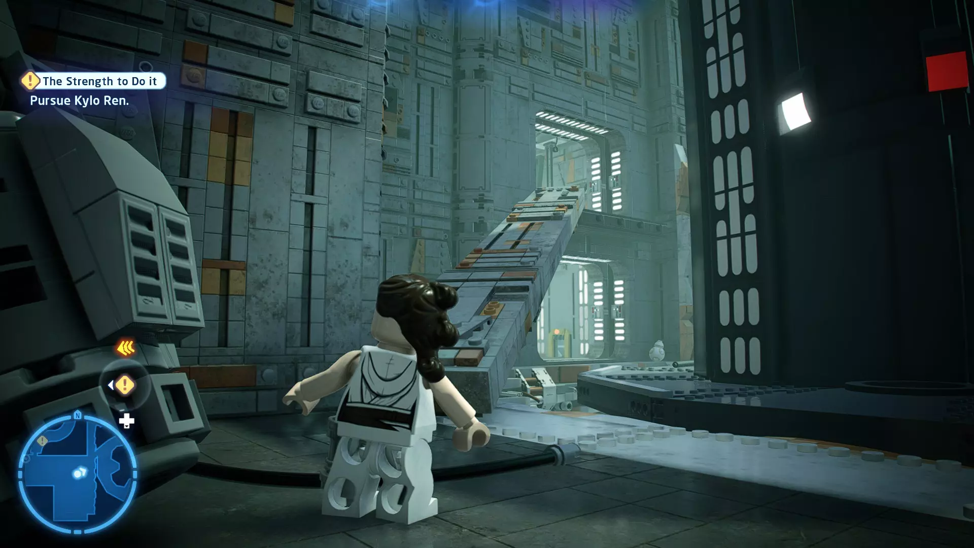 角色:蕾伊(第九部)、BB-8 当前任务:在死星二号废墟中寻找寻路者 詹娜让我们先等一下再过河,但我们没时间了!前往冲浪摩托,乘坐它前往死星二号废墟。 到达后,沿着标记穿过大厅,到达中央峡谷。抓住对面的抓钩点,然后拉动以创建一座桥,以便继续前进。跳上尖塔侧面的平台,到达第二层。 跟随标记,然后抓住绳索爬上去到达第三层(BB-8可以抓住橙色栏杆爬上来和你会合)。当你们都到达第三层后,继续跟随标记,找到一个宇航技工机器人接口。使用它来延伸一些平台,让你能够跳到第四层。 到达第四层后,跟随标记前往中央尖塔。跳上橙色方块,然后沿着橙色横杆移动以到达更多方块。跳上这些方块,接着跳到悬挂的大型碎片上。穿过碎片,然后跳进对面的走廊。沿着走廊继续前进,即可到达下一个故事关卡的标记。 The Strength to Do it - Story Mode