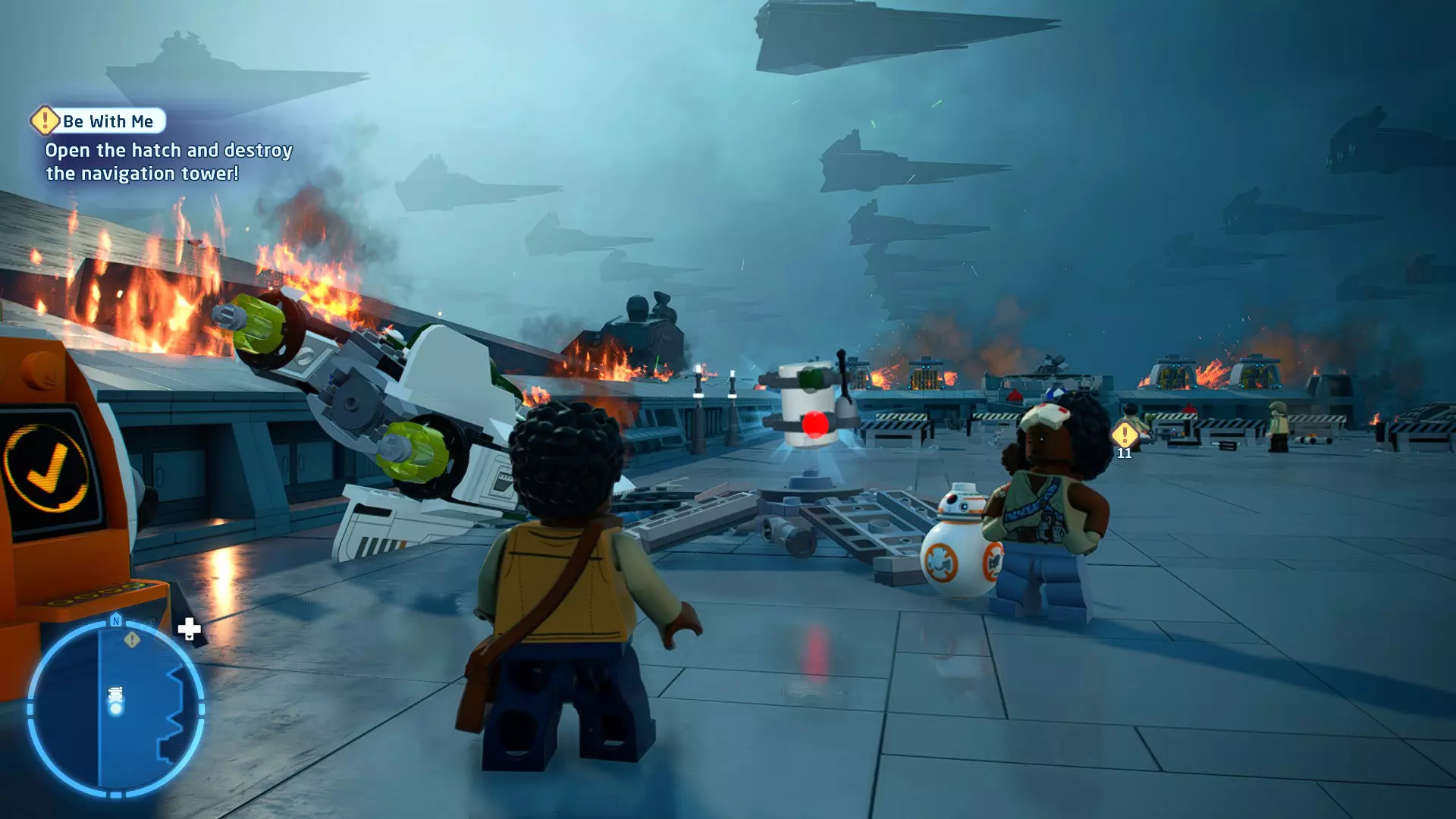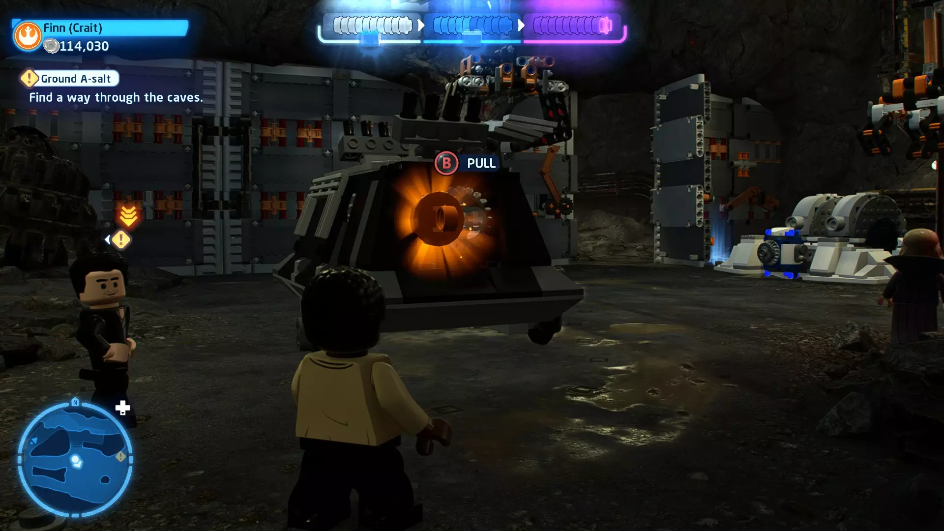 在关卡最后部分驾驶AT-ST时,从10名冲锋队员身上走过(不要踩踏)以击败他们,完成此挑战。 幕间 - 克瑞特的危险 最高领袖及其座舰均已被摧毁!霍尔多海军上将驾驶一艘星舰加入光剑对决,并将拉杜斯号直接撞穿了至尊号。场面看起来非常壮观。 在试图逃离残骸并与抵抗组织重新集结的过程中,芬恩在罗斯和BB-8的帮助下,终于向法斯马队长报了仇。 不出所料,第一秩序目前对此非常不满,抵抗组织则计划前往克瑞特避难。他们将在那里的一座旧义军基地等待第一秩序的到来,并进行最后的抵抗……角色:芬恩(克瑞特星)、罗丝·蒂科 当前任务:与波伊对话 前往波伊处,找到继续剧情的标记。 新任务:发送求救信号请求支援 与波伊对话后,他会交给你修复损坏雷达碟的任务。跟随标记前往指挥室内的雷达碟。你会在碟形装置右侧发现一个抓钩点。抓住它并拉动以打开箱子,露出能量核心。拿起能量核心并将其放入插槽,为雷达碟供电。 使用出现的英雄终端激活雷达碟。不幸的是,碟形装置也损坏了。跟随标记前往屋顶,在碟形装置旁会发现一个宇航技工机器人接口。我们需要想办法让BB-8来到这里,以便它使用该接口。在雷达碟右侧你会发现一些脚手架。抓住脚手架上的抓钩点,然后拉动使其倒塌,露出乐高积木。将积木搭建成蹦床,让BB-8能弹到屋顶上。使用雷达碟上的宇航技工机器人接口来修复它。 新目标:与波对话 修复完雷达碟后,波会告诉你有东西需要你去看看。跟随标记找到波,在那里你会发现开启最终故事关卡的标记。 Ground A-salt - 故事模式