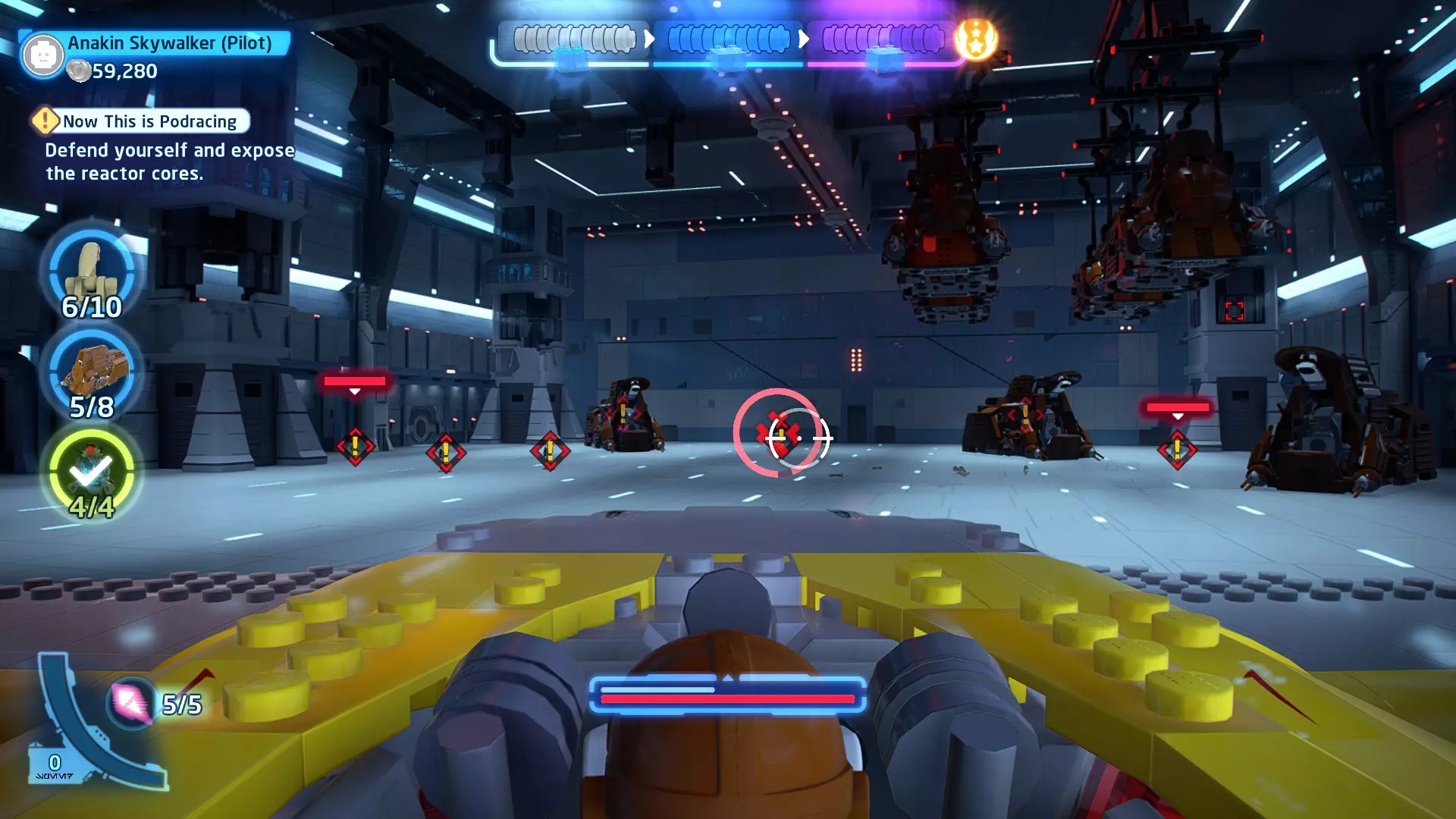 一架Y翼星际战斗机会飞过并投下一个容器,容器打开后会露出这个迷你套件。 微型飞船:坦蒂夫四号(微型) 与我同在 - 关卡挑战 所需能力:幸运射击 挑战1 - 西斯爆破 详情:利用环境击败西斯士兵