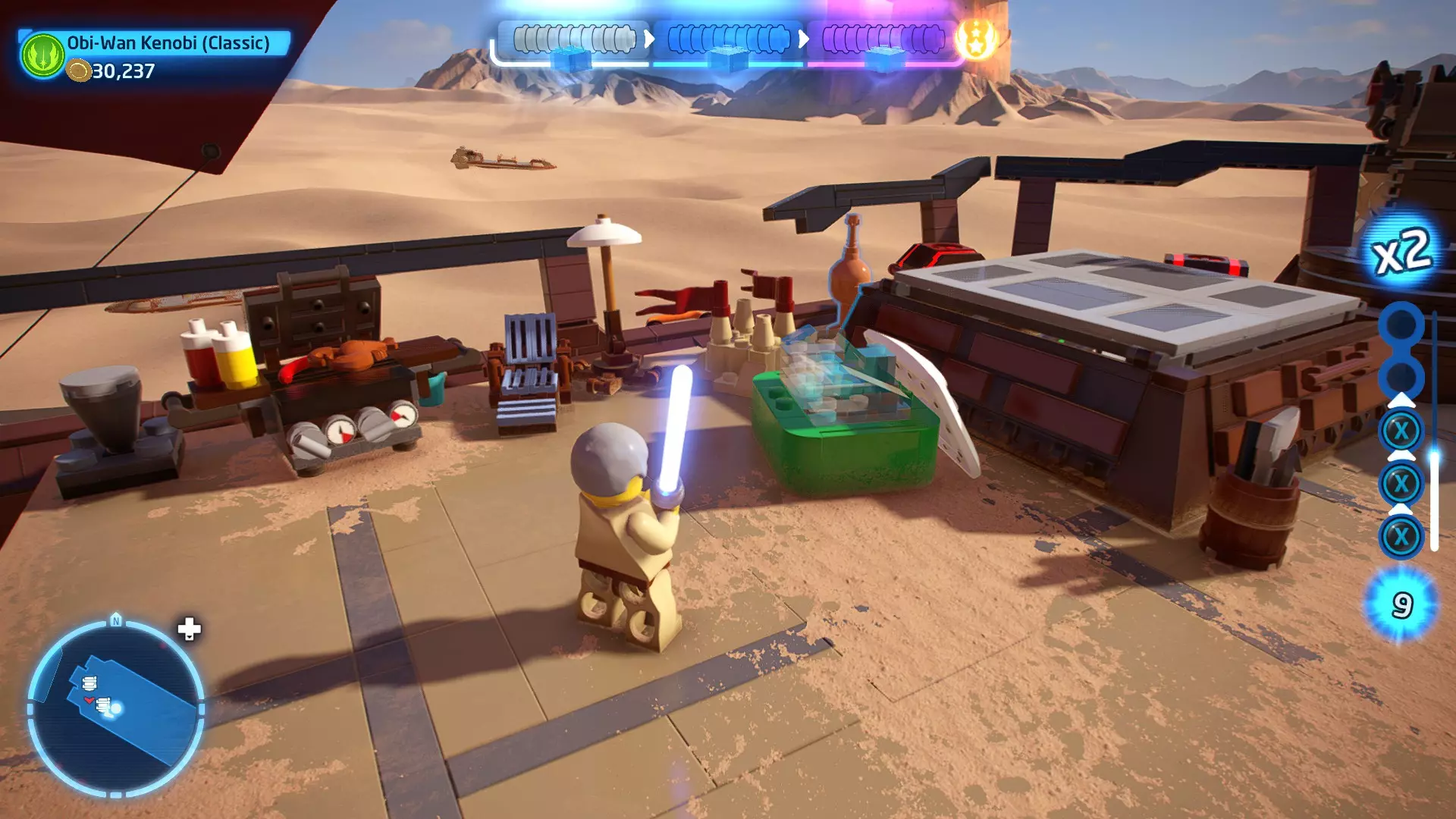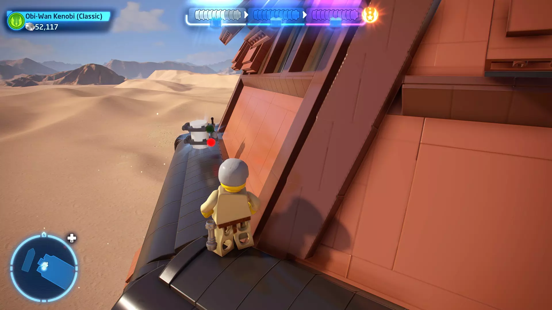 敌人:轮式突击摩托、第一秩序喷气兵 初始角色:蕾伊(第九部)、丘巴卡、BB-8 新增角色:波·达默龙(第九部)、芬恩(第九部) 真绝地:30,000 第一部分 - 沙漠追逐 当前目标:击败追击的第一秩序士兵! 本关卡非常简单。向追击的轮式突击摩托和喷气兵射击。击败所有敌人即可完成关卡。 解锁角色:兰多·卡瑞辛(隐士)、兰多·卡瑞辛(第九部)(100,000) 他们飞起来了!- 迷你套件 迷你套件1 - 鬼祟的回收机器人