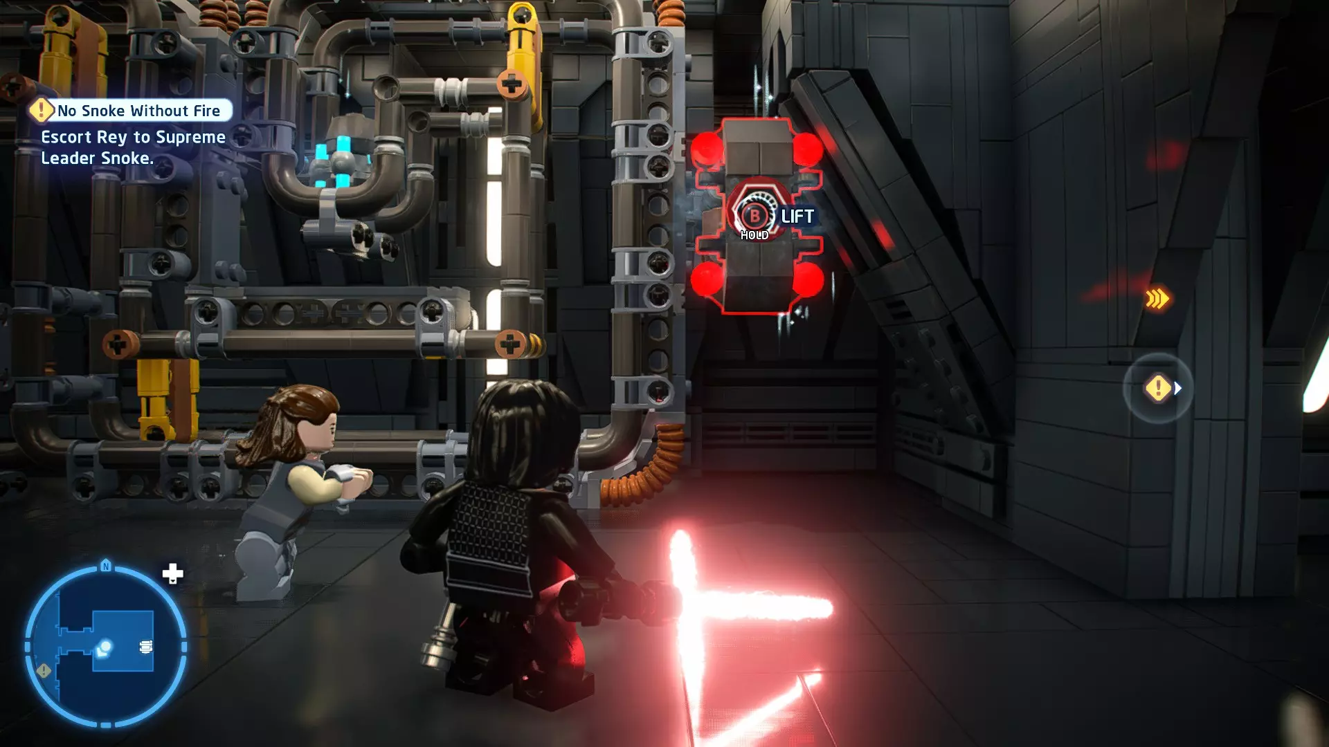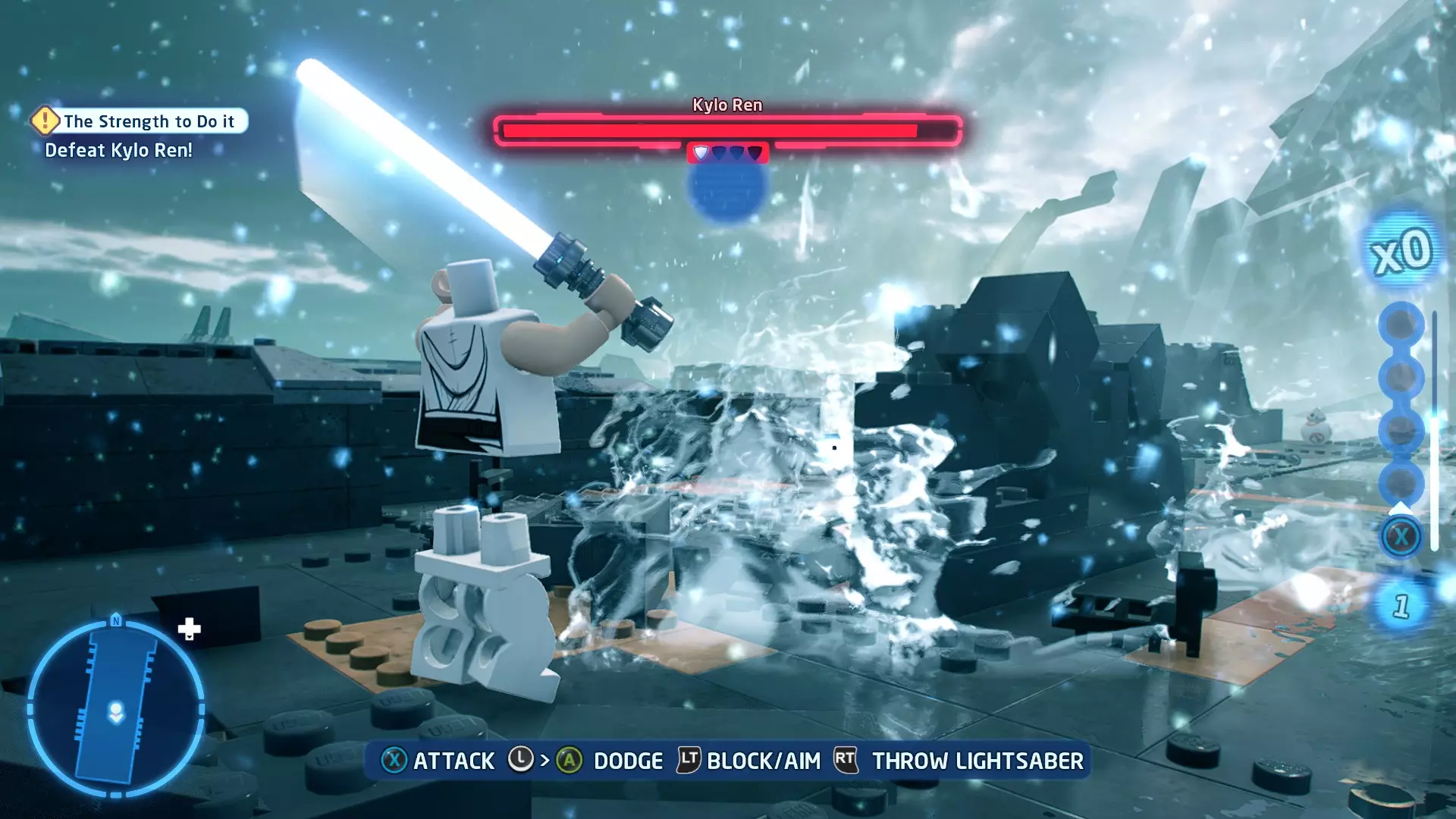 首领:凯洛·伦 初始角色:蕾伊(第九部)、BB-8 真绝地:75,000 第一部分 - 死星废墟 当前目标:击败凯洛·伦! 与凯洛决斗以削减其生命值。一旦打掉他第一条血条,他就会撤退。 新目标:追击凯洛·伦 随后凯洛会沿着走廊逃跑,我们需要追上他!蕾伊可以沿着左侧墙壁奔跑,而BB-8可以通过右侧的协议通道。当你们俩都越过缺口后,继续沿着走廊前进。 你们会到达一个峡谷,蕾伊无法跳过去。将附近的箱子推入峡谷,移动一些残骸。这会在西侧墙壁上露出一个抓钩点。操控BB-8抓住它,然后拉动以露出一个协议通道。 穿过通道后,你们会到达一个有两个按钮的房间。踩下右侧的按钮以露出一根柱子,然后切换至蕾伊。跳上柱子,接着荡到峡谷中的第一根支柱上。切换回BB-8,踩下左侧的按钮以露出另一根支柱。再次切换回蕾伊,跳过这些支柱到达峡谷的另一边。 用你的光剑切开左侧的墙壁,露出一个协议通道,以便BB-8能与你会合。摧毁右侧的残骸以获得乐高积木,然后将它们搭建为一个宇航技工机器人接口。使用该接口打开门,继续前进后会遇到凯洛·伦。 新目标:击败凯洛·伦! 与凯洛决斗以消耗他的生命值。消耗掉他的第二条生命值后会触发过场动画。第二部分 - 海滨对决 当前任务:追击凯洛·伦 沿着小路前进,你会看到凯洛·伦的TIE战斗机。 新任务:寻找抵达凯洛·伦的TIE战斗机的方法 继续沿着小路走,你会遇到一个缺口。跳上附近圆形建筑上的橙色方块,然后走到横梁上。跳过缺口,接着爬上橙色栏杆,继续沿着小路前进,就能找到凯洛·伦。 新任务:击败凯洛·伦! 与凯洛对决,削减他的生命值。打掉他最后三格生命值即可完成本关卡。 解锁角色:D-O、蕾伊(西斯)、凯洛·伦(第九部)(200,000) 完成的力量 - 迷你套件 所需能力:敏捷、光剑、小型 迷你套件1 - 我来的时候就是这样了