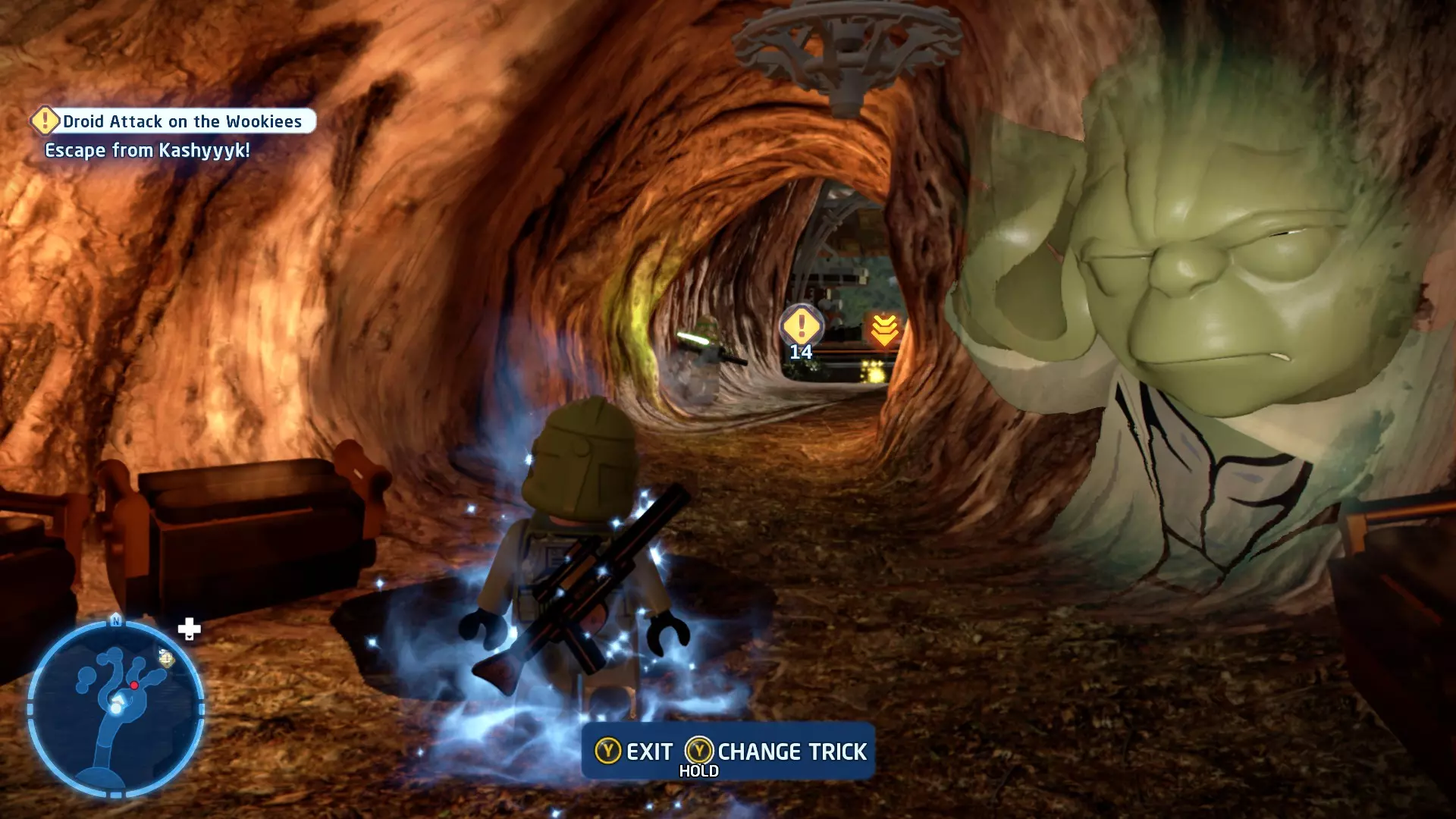 拥有此能力的角色可以使用光剑切开带有彩色线条的墙壁。站在墙壁前,按下【特殊】按钮附着在墙上。使用方向键移动,在墙上切割出一个洞。一旦你切出一个洞(大小可随意),墙壁就会倒塌。黑暗面使用者也可以按住【特殊】按钮使墙壁倒塌。 角色职业:绝地、黑暗面 Lucky Shot