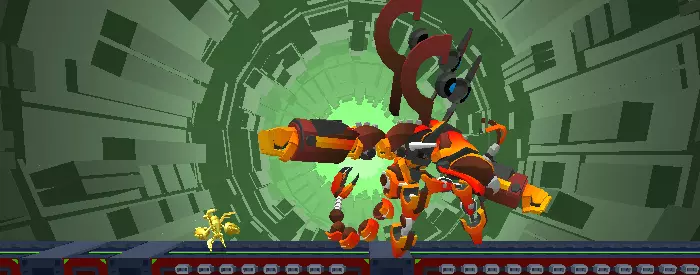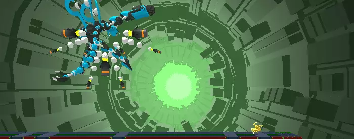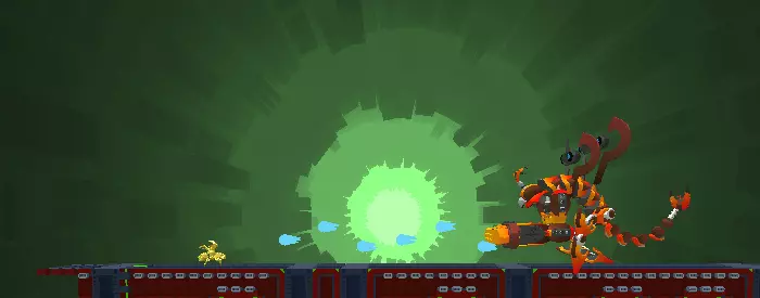 弹幕射击 - 向前发射20发冲击波弹,随后以45度角发射3枚火箭,攻击总伤害为130点。通过二段跳可以轻松躲避子弹,而火箭则可以躲在 Boss 下方或身后规避。