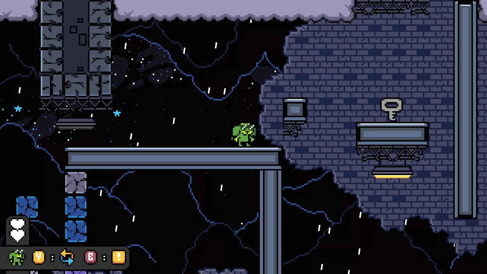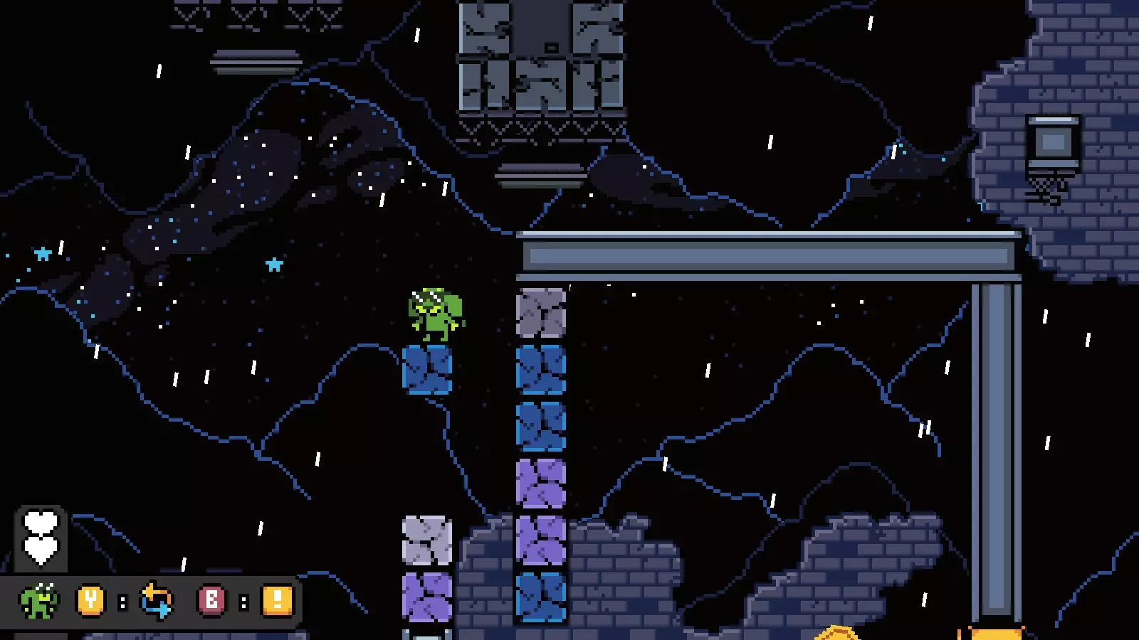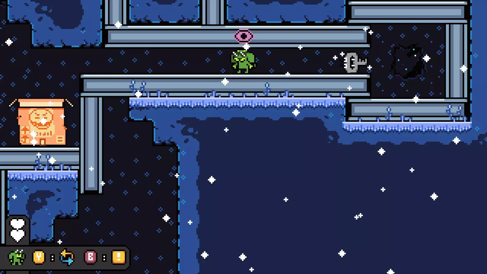 然后向右走进入下一个房间,爬上一些可破坏的方块,到达宝箱所在位置的上方。