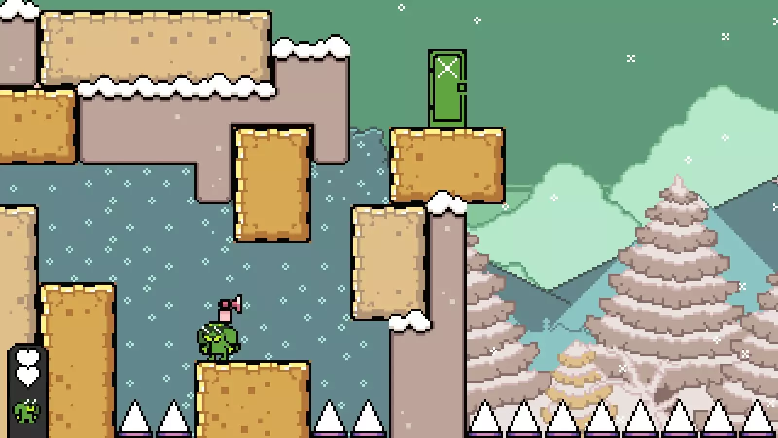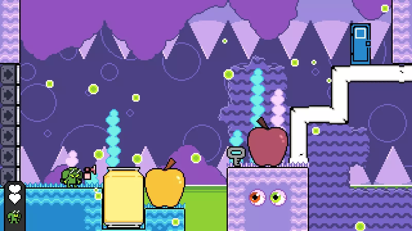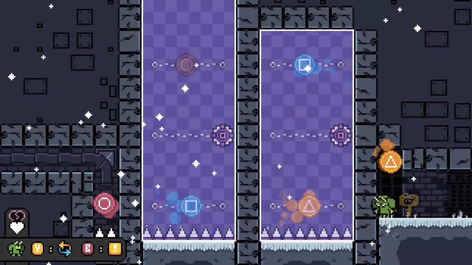 然后走向绿色的门,跳落到一个两端有尖刺的平台上。
