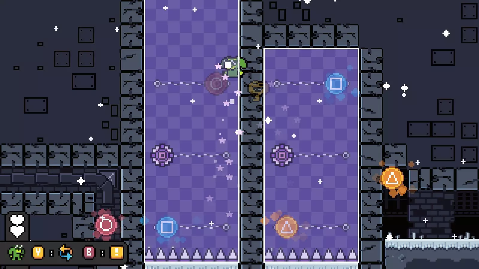 世界5/恐怖地狱 一种新的通勤方式: 前往第四个房间,在上升到右侧的某个重力开关时,不要触碰它,而是向左跳进1格宽的洞口。