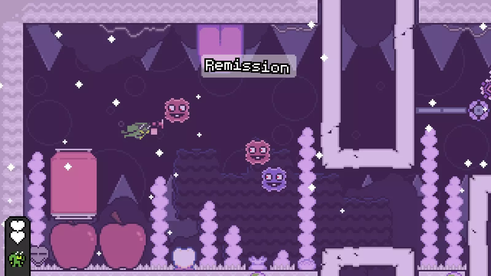 然后向左射击心脏并通关,以获取【Resignation】的钥匙 折衷路线: 从出生点向左跳至洞穴,向左射击心脏,然后通关以开启通往【Remission】的路径