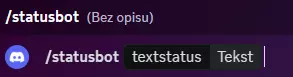原始数据: { "名称": "statusbot", "权限": "无", "权限2": "无", "限制": "1", "_id": "nFeqZ", "操作": [ { "游戏名称": "${slashParams( \"textstatus \")}", "游戏链接": "", "活动类型": "正在玩", "名称": "设置机器人游戏" } ], "通信类型": "4", "参数": [ { "名称": "textstatus", "描述": "textstatus", "类型": "字符串", "必填": true, "选项": null } ] } 机器人游戏状态命令!