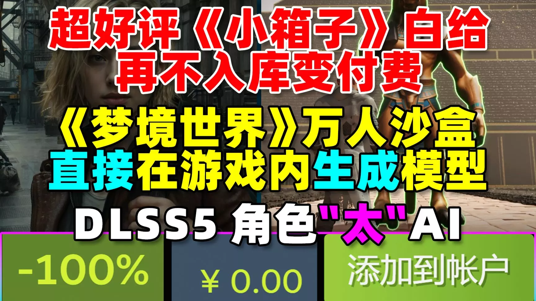 再不入库就转付费啦!Steam超好评白给《小箱子》!|《梦境世界》万人沙盒!直接在游戏内生成建筑部件!|DLSS5角色效果"太"AI!|乐高蝙蝠侠新作反向跳票!