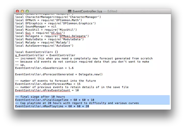注意:如果你想先组建一支更强大的安保团队,再去废弃空间站搜寻战利品和殖民者,建议将GameRules.elapsedTime的值设置为大于10*720(两小时)或10*1080(三小时)。你推迟废弃空间站出现的时间越晚,就越有可能研发出更好的防弹衣或等离子步枪来装备你的安保团队,同时如果废弃空间站中有会爆头击杀新手团队的突袭者和杀戮机器人,你也能有替补的安保人员。 推迟可怕的最终围攻!(EventController.lua) 你知道Double Fine为游戏设置了一个“结局”吗?除了教程和目标列表外,游戏还编入了一个“结局”。实际上,是两个结局。关于各种难度提升(如陨石撞击、突袭者等),它们会在游玩约八小时后停止(你很快就会亲身体验到)。但更为重要的是最终围攻,它由多波突袭者同时突破组成(玩家称之为“超级舰队”)。这个基地的“终结”设定在仅游玩四小时后就会开始(搞什么啊?)。 我还没见过这个超级舰队,因为当《太空基地DF-9》1.0版本发布时,在默认设置下,我的基地没有一个能坚持到一小时。现在我有了一个到处都是炮塔且安保严密的基地,几乎已准备好迎接“终结”。但我希望有更多时间来研发更好的武器和炮塔。 这就是这个技巧的用武之地。Double Fine的默认规则存在不公,我们不应再遵循这些规则。为了延缓你的基地走向末日,我们需要找到那个事件并对其进行修改。 与前两个脚本文件不同,EventController.lua并未隐藏,它位于Scripts文件夹目录中,你只需向下滚动即可找到它。