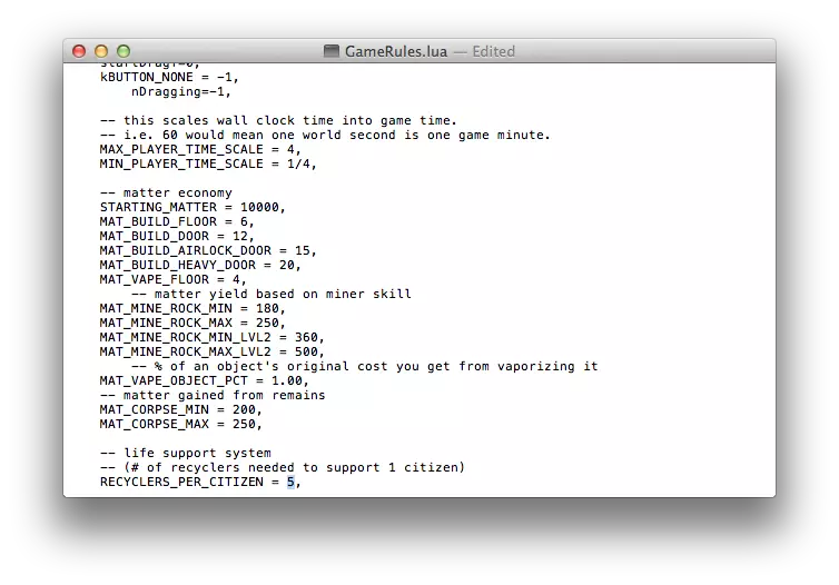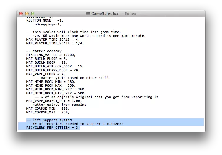 关闭窗口并运行游戏。注意:在接下来的部分中,我会展示如何调整数值来降低失去朋友的剩余殖民者或因周围有尸体而感到不适的殖民者的悲伤等级……一旦我记起正确的.lua文件。 默认游戏设置修改 - 循环器/殖民者比例(GameRules.lua) 氧气循环器容量(循环器/殖民者比例) GameRules.lua文件中还有一个值得注意的调整项,那就是氧气循环器(文件的其余部分涉及教程、全屏选项、游戏规则元数据和鼠标功能 - 不要改动这些,除非你想(例如)更改游戏开始时是否全屏的选项)。但对于那些厌倦了“每三名殖民者配备一个回收器”规则的玩家,我们也可以调整这些设置。在“--遗体获得的物质”条目正下方,有一个关于默认生命维持系统行为的条目。
