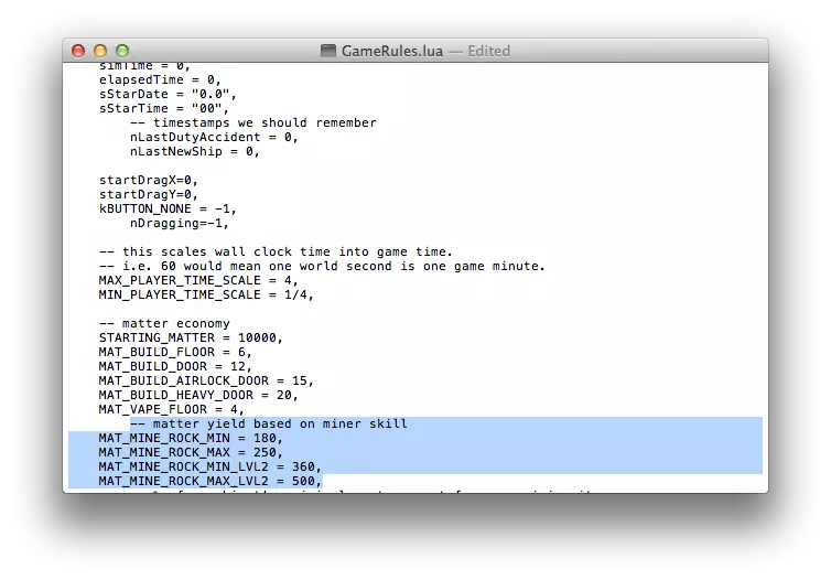 关闭窗口。不要保存或进行任何操作。只需直接关闭窗口。 正常运行游戏。当你选择新建基地时,你会发现初始物质不再是2000,而是10000。在你的前三位殖民者能够正常呼吸之前,不要急于建造最初的房间。我强烈建议在建造SEED舱室、气闸室和生命维持室之后,再建造居住室,这样这些糊涂的殖民者就能把他们的物品放在架子和梳妆台上了。另外,如果你想让室友和他们的朋友住在一起(如果你喜欢的话),也可以这样做。 默认游戏设置更改 - 采矿获得更多物质(游戏规则。更多采矿物质 当你选中一组岩石进行物质开采时,会显示一个较大的数值,但当矿工将物质碎片送到精炼厂后,你得到的数量却有所减少?这似乎不太公平,对吧?不过我们也可以对此进行修改,而且相关设置同样在GameRules.lua文件中! 1. 按照前面章节所述的方法打开GameRules.lua文件。 2. 在文本编辑器中,你会看到--物质经济条目下方的数值,它们看起来像这样: