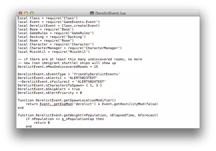 请注意:我记不清在开始当前基地后多久更改了设置,因为在我更改设置之前或重新加载游戏之后,确实发生过一次流星雨(可能是在我退出游戏并修改文件之前就已安排好的脚本事件)。不过,之后过了很长一段时间流星才再次出现,所以至少我知道这个方法是有效的。 无论如何,这样你就有更多时间来设计基地和完善设施,减少灭火和治疗愚蠢烧伤患者的时间。只需明智地利用时间,规划备用路线,在各处放置灭火器和警报器,并且一定要准备好备用的反应堆和氧气循环器,以防其中一个甚至几个被摧毁。延迟废弃飞船出现(DerelictEvent.lua) 对于阅读本指南的部分玩家来说,这听起来可能有些奇怪。为什么会有人想要延迟废弃飞船的出现呢?废弃飞船可能意味着更多殖民者、突袭者、杀戮机器人,或者最重要的奖励——数据立方体!然而,众所周知,要让救援、清剿或数据立方体回收任务成功,你需要一支装备精良、全员武装的三人安保小队来清理威胁、解救人质,以及/或者为你脆弱的研究员清理每个房间,让他/她能在飞船消失前拿到数据立方体。而且,嘿,如果飞船还在那里,就能为你的殖民者提供更多物质……前提是你能腾出人手开始分解这艘旧飞船。不过,就像流星雨设置一样,废弃飞船遵循相同的默认脚本规则:它们会在殖民地居民达到4人以上或游戏开始后的前10分钟内出现。根据这些规则,可能带有数据立方体的废弃飞船会出现,但你可能正忙于应对6人船员的事务,以至于无法抽出唯一的安保人员去探索——他可能在到达废弃飞船受损的舱门前就已经牺牲了。而我们不希望数据立方体被浪费! 废弃飞船事件脚本文件(DerelictEvent.lua)与我们在上一节中找到的流星雨事件脚本文件(MeteorEvent.lua)位于同一文件夹中(在Scripts目录下的GameEvents子文件夹内,如果你需要查找位置,请参考上一节)。用文本编辑器打开此脚本会看到以下内容: