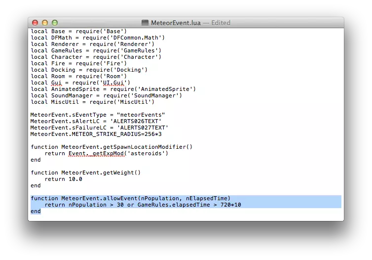 这里的重点内容是指,当殖民者数量(nPopulation)超过4人,或游戏开始后10分钟(GameRules.elapsedTime > 60*10),陨石撞击就会开始。但我们希望专注于基地建设,并确保有多种路径,以防Double Fine重新引入陨石雨造成的船体破裂,所以我们把它改成简单的设置。我将陨石撞击设置为在人口超过30人或游戏开始后两小时才开始。