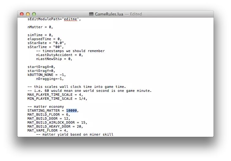 看到“STARTING_MATTER = 2000”这一行了吗?那么,如果我们想初始拥有10000单位物质该怎么办呢?选中并修改数字,使其看起来像这样: