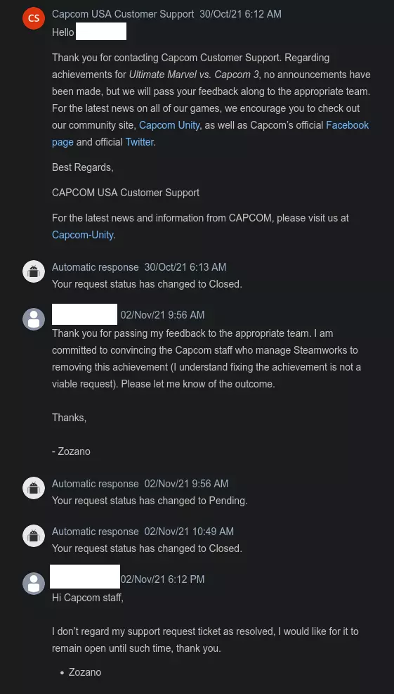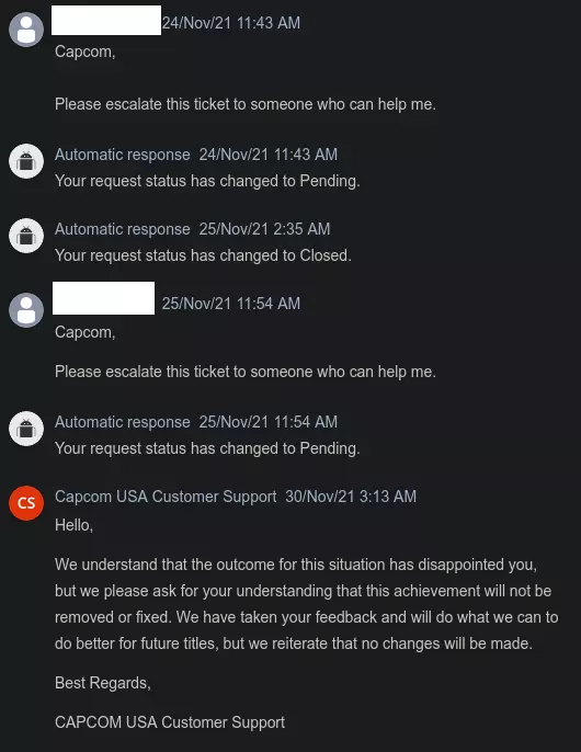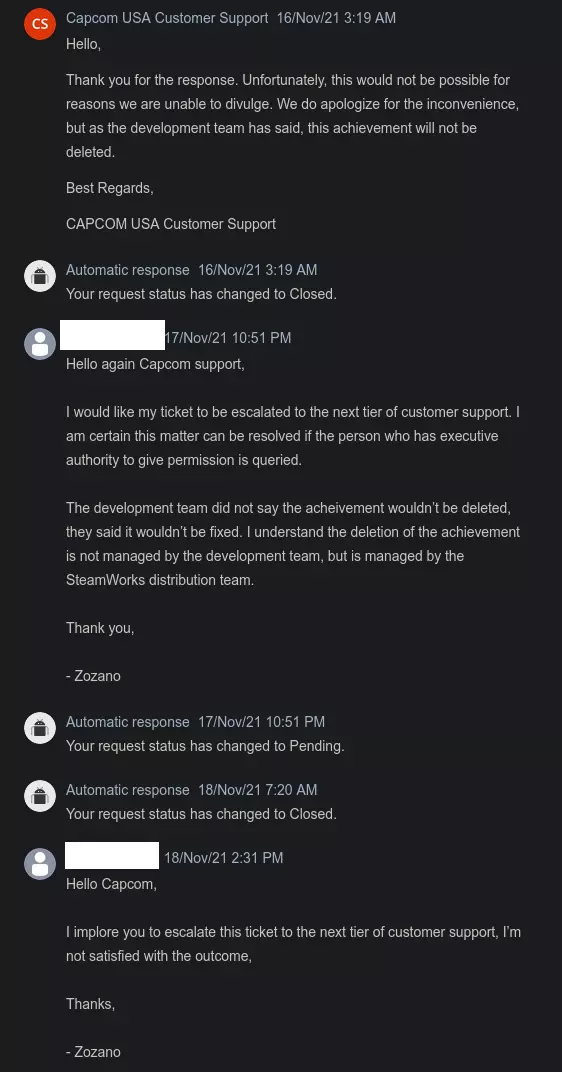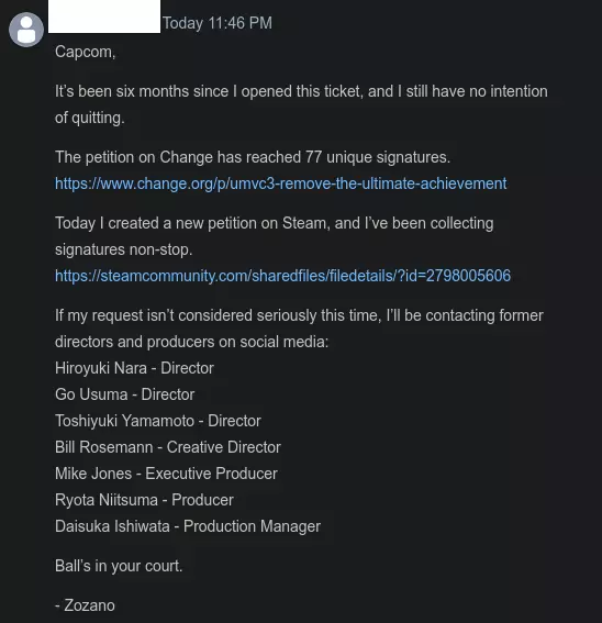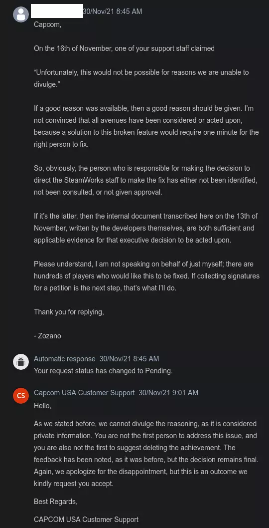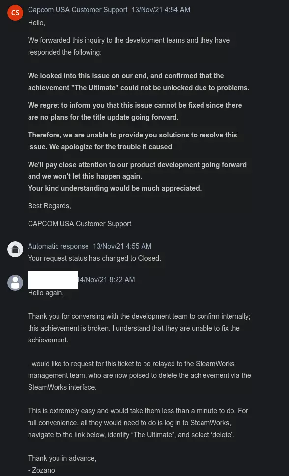 我需要一名日语翻译! 一旦这份请愿书获得100个评分,我将通过一些游戏总监和制作人的社交媒体账号(请愿书末尾有联系方式)向他们提交。 如果有人能专业翻译这份请愿书,那将意义重大!请告诉我! 卡普空知道它坏了! 开发者自己也承认它存在问题且无法获取,但拒绝采取必要措施来纠正这个问题。在联系卡普空客服两个多月并尝试沟通后,我终于收到了如下回复: 引用自CAPCOM USA Customer Support:你好, 我们已将此问题反馈给开发团队,他们回复如下: 我们已在我方对该问题进行了调查,确认成就【The Ultimate】因存在问题而无法解锁。 很遗憾地通知你,由于该游戏目前没有更新计划,此问题无法修复。 因此,我们无法提供解决该问题的方案。对于由此带来的不便,我们深表歉意。 感谢你的理解。期望开发者修复一款十年前的游戏是不现实的。不过,Capcom Steamworks团队如果接到指示,完全可以在不到一分钟内移除成就。 Steamworks Steam有一个开发者界面,即Steamworks。 开发者可以通过Steamworks轻松移除成就。 去年,我说服了《Ravaged Zombie Apocalypse》的开发者移除了一个存在问题的成就。他们在几分钟内就完成了移除操作。 网站上显示的内容如下: