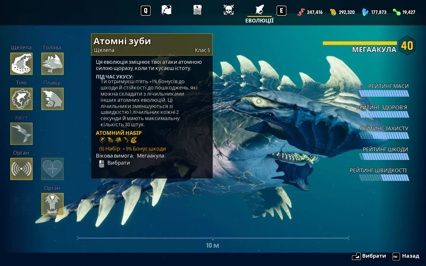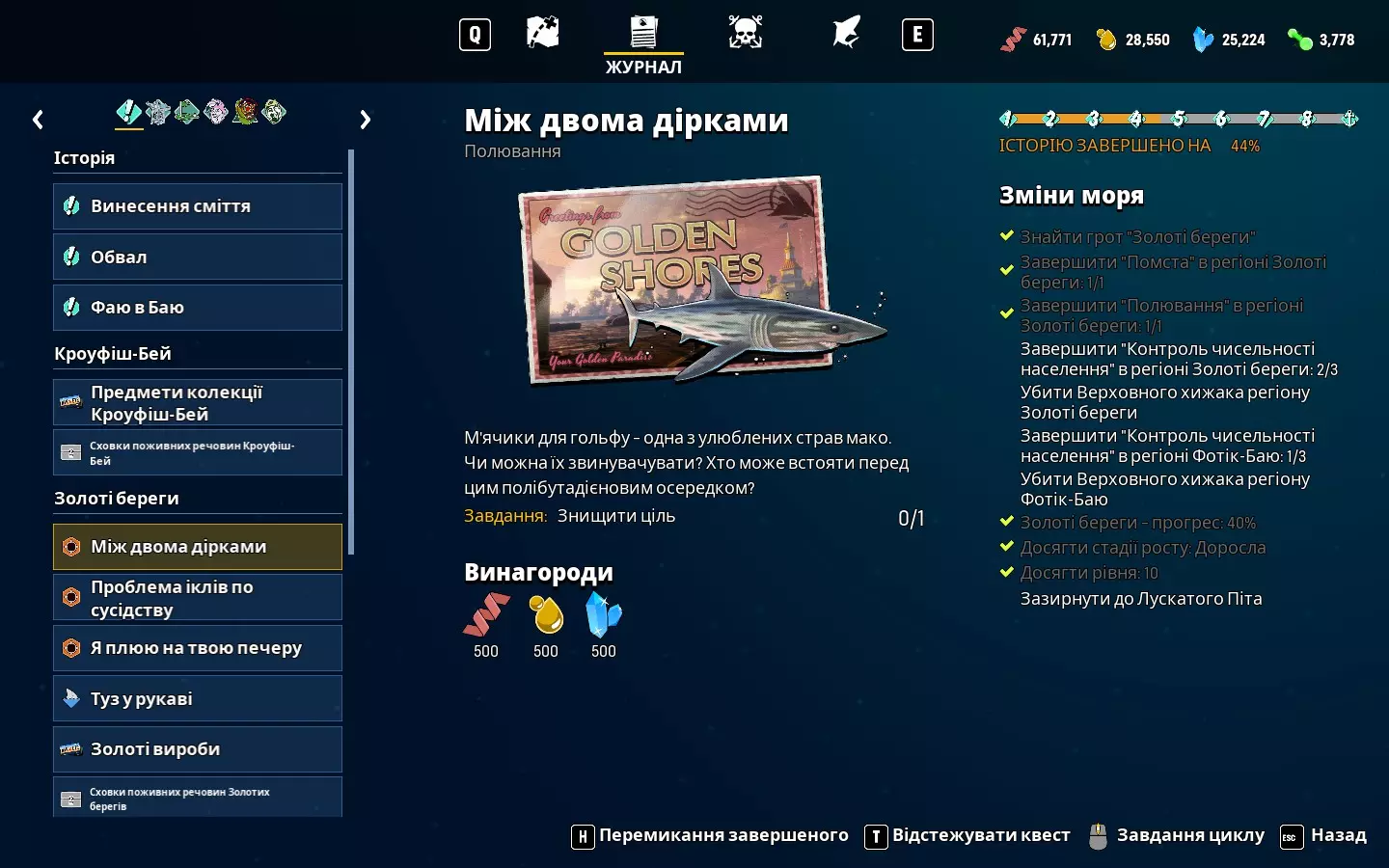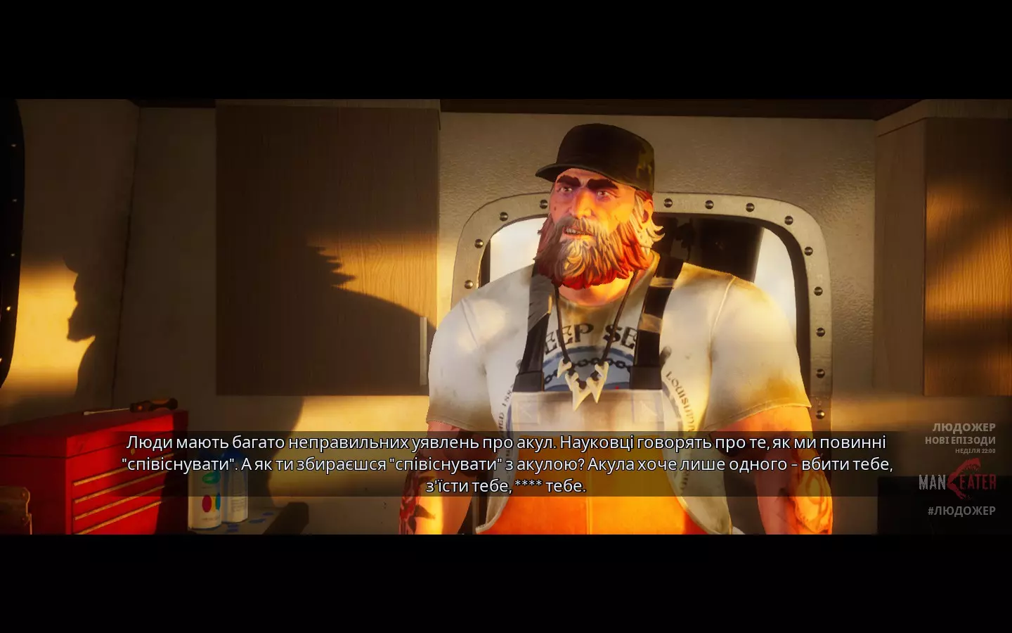 《食人鲨》文本完整乌克兰语化工具及安装说明。 信息 乌克兰语化工具类型:使用乌克兰语化文件替换原始文件;仅文本。 工具运行所需游戏语言:英语。 翻译所基于的原版语言:英语。 所需游戏版本:最新版(431513)。 本地化版本:最终版。 乌克兰语化工具及翻译作者:Bloody Punisher 请仔细阅读以下全部内容,以免产生疑问或误解!请在游戏开始前直接下载本地化文件,因为可能有各种小改进。 乌克兰语本地化安装步骤: 1.下载Maneater-WindowsNoEditor_ukr1.1压缩包。 2.在您的库中右键点击【食人鲨】,然后选择【属性…】。在【常规】选项卡窗口中找到【语言】项,并选择【English(英语)】(如果之前设置的是其他语言)。然后进入【已安装文件】选项卡,点击右侧窗口中的【浏览..】。 3. 打开【食人鲨】文件夹,接着依次打开Content和Paks文件夹。需要将压缩包解压到此处。 4. 游戏中需要手动开启字幕,因为默认是关闭的。操作方法为:点击【设置】,进入【游戏进程】选项卡,然后在右侧将【开启】设置在对应选项旁(截图2)。 可选步骤:关闭Steam。将包含已翻译成就的Maneater_ach解压到Steam的appcache stats文件夹并替换。附加信息:我获取了当前版本《食人鲨: apex版》的原始本地化文件。目前已完成主游戏和DLC的完整翻译。原始文件的文本量(不含id的单词/行数):76553/6655。美国使用英制单位,但其中一些单位有其特定含义:在所有可能且合适的情况下,我都将其转换为我们易于理解的公制单位。除旁白和操作员外,所有角色说话都带有口音或卡津方言,因此部分语句存在刻意为之的语法错误。 英文文本可能出现在以下位置: 1. 区域名称以及游戏过场动画中以#开头的部分文字。这在本地化文件中不存在,因此部分内容可能是纹理,部分是内部文本。 2. 在两场战斗中,首领的血条上方还有一个标有Cage(牢笼)的血条。这个词已进行翻译和检查,但游戏仍保持原样。初始标题也是如此,过一段时间后才会显示乌克兰语。 关于一些特性和问题: 1.1. 部分词语在不同地方使用,因此唯一的办法是用句号代替词尾,以表示缩写。例如:低。 2. DLC中关于最终Boss猎人的提示显示效果不太好,但如果对其进行修复,其他所有同类型的文本都会出现问题。 3. 还需要提及的是,有时字幕虽然应该显示,却没有显示出来。这种情况只发生在游戏开场动画期间或刚结束动画时——也就是可以操控鲨鱼的时候。这可能只是我遇到的问题,但还是得反馈一下。 本地化示例