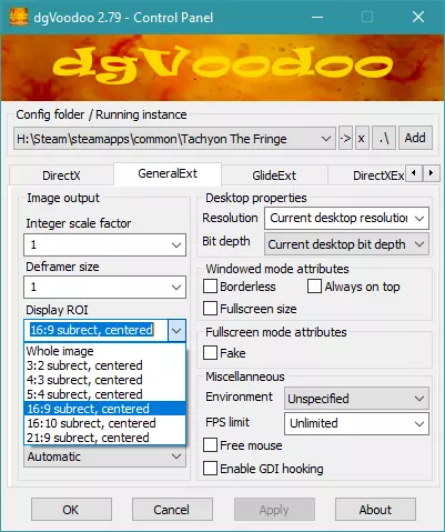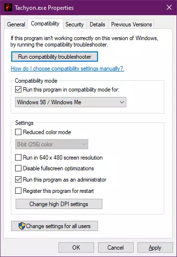 8. 使用Tachyon.exe启动器(非Steam)运行游戏一次,更改一些设置以确保dgVoodoo D3d包装器被识别为你的显卡……运行游戏后退出。 9. 撤销兼容性设置,但保留管理员选项的勾选,并将dpi设置调整为以下值: